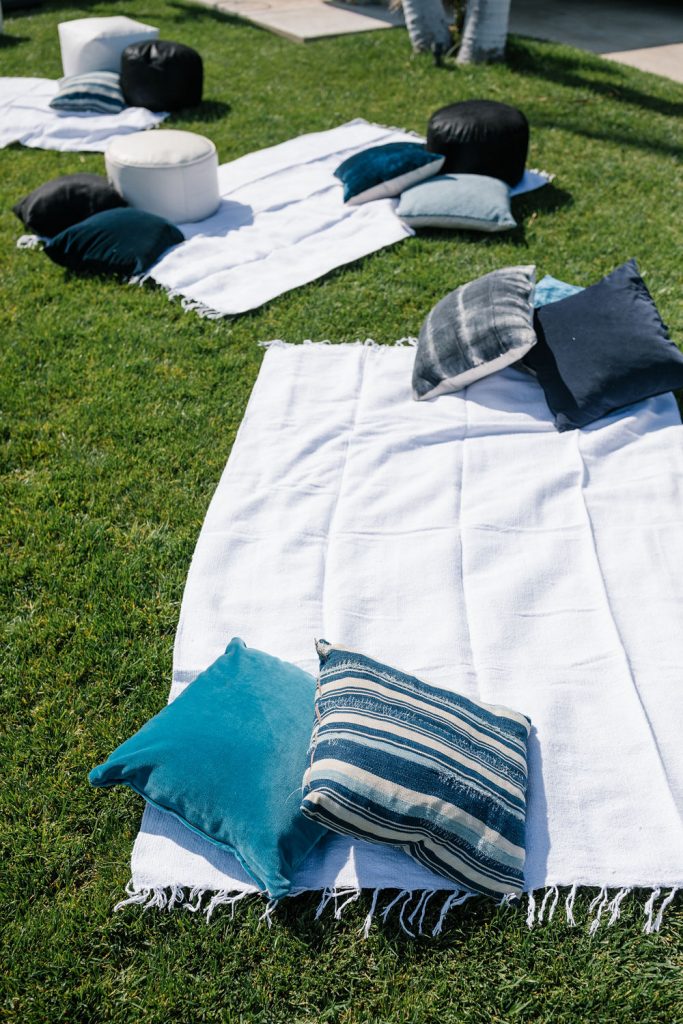 I added more seating on my grass for kids and adults to sit, eat, and chill. Gunn & Swain blankets plus lots of cute pillows and poufs from Sweet Salvage Rentals always do the job!