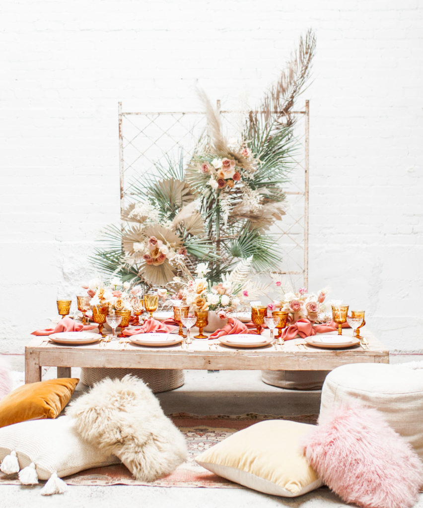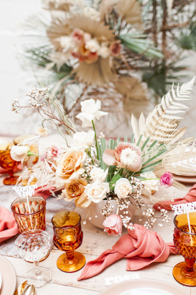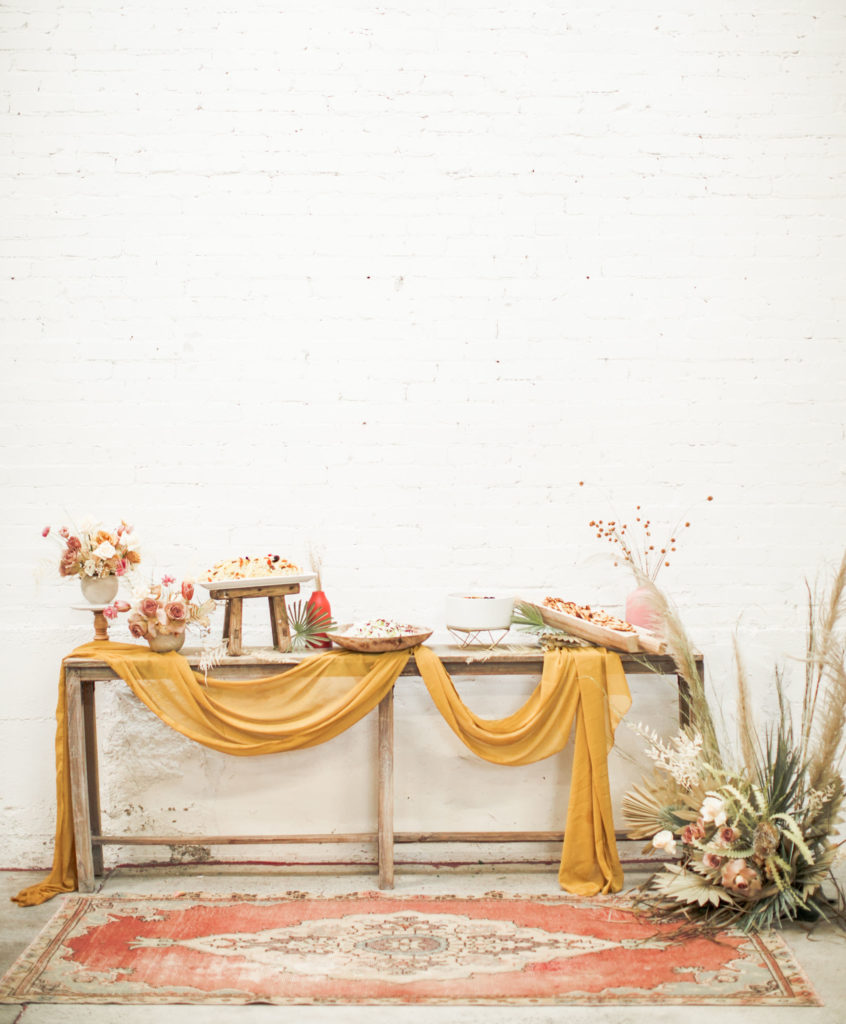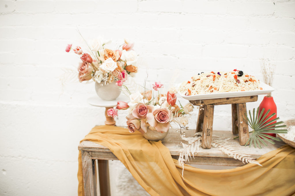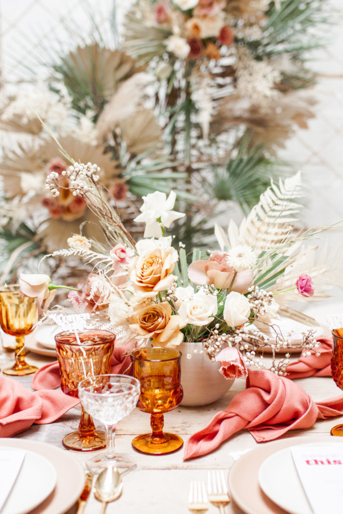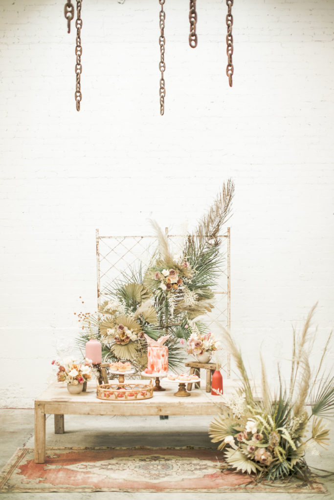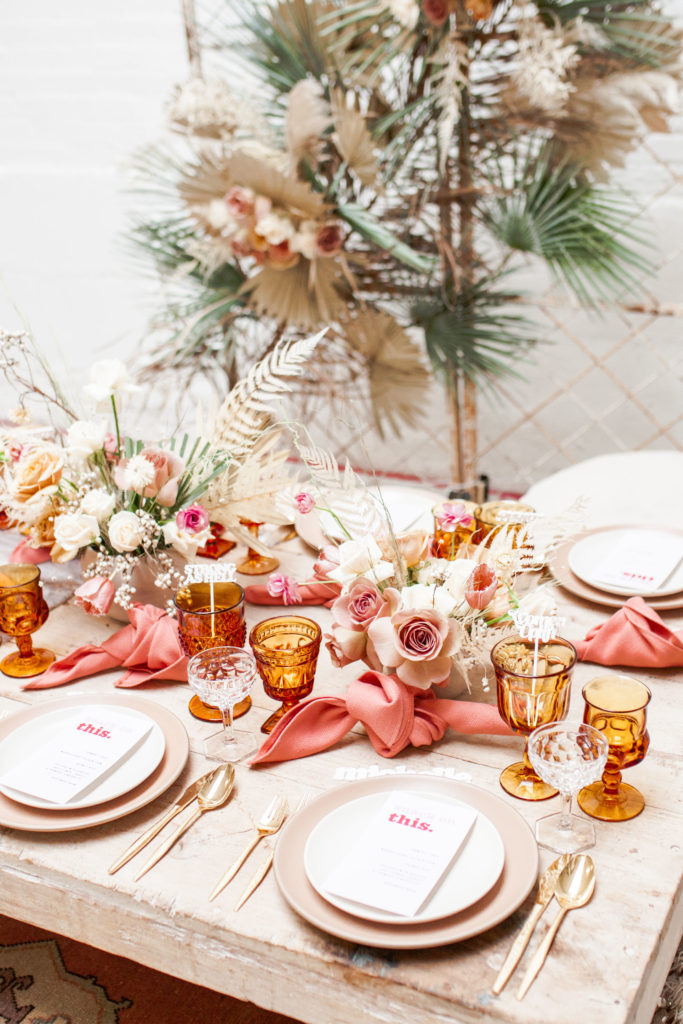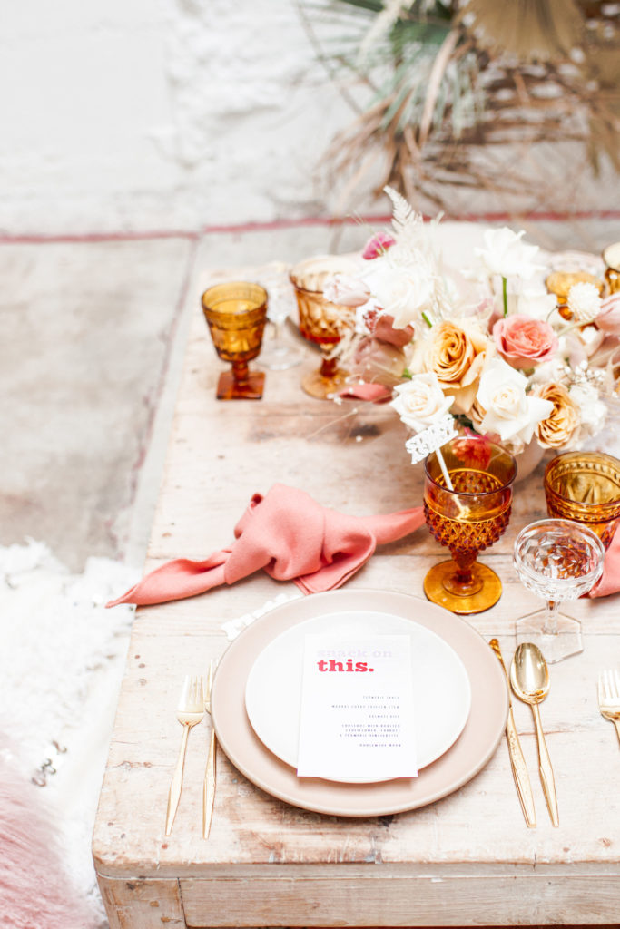 Ahhh… This set up is just everything I love. So many amazing and talented women went into making this gorgeousness come together. Let’s start with the venue and rentals – Marnie at Sweet Salvage is the best and has this great warehouse full of beautiful furniture and objects to use for our shoots. Then there’s Jennifer from Cherished Rentals who is also in the warehouse with all the stunning tabletop items you see here. These ladies make the perfect pair and always bring such amazing energy to our shoots, I’m so grateful to know and work with them.