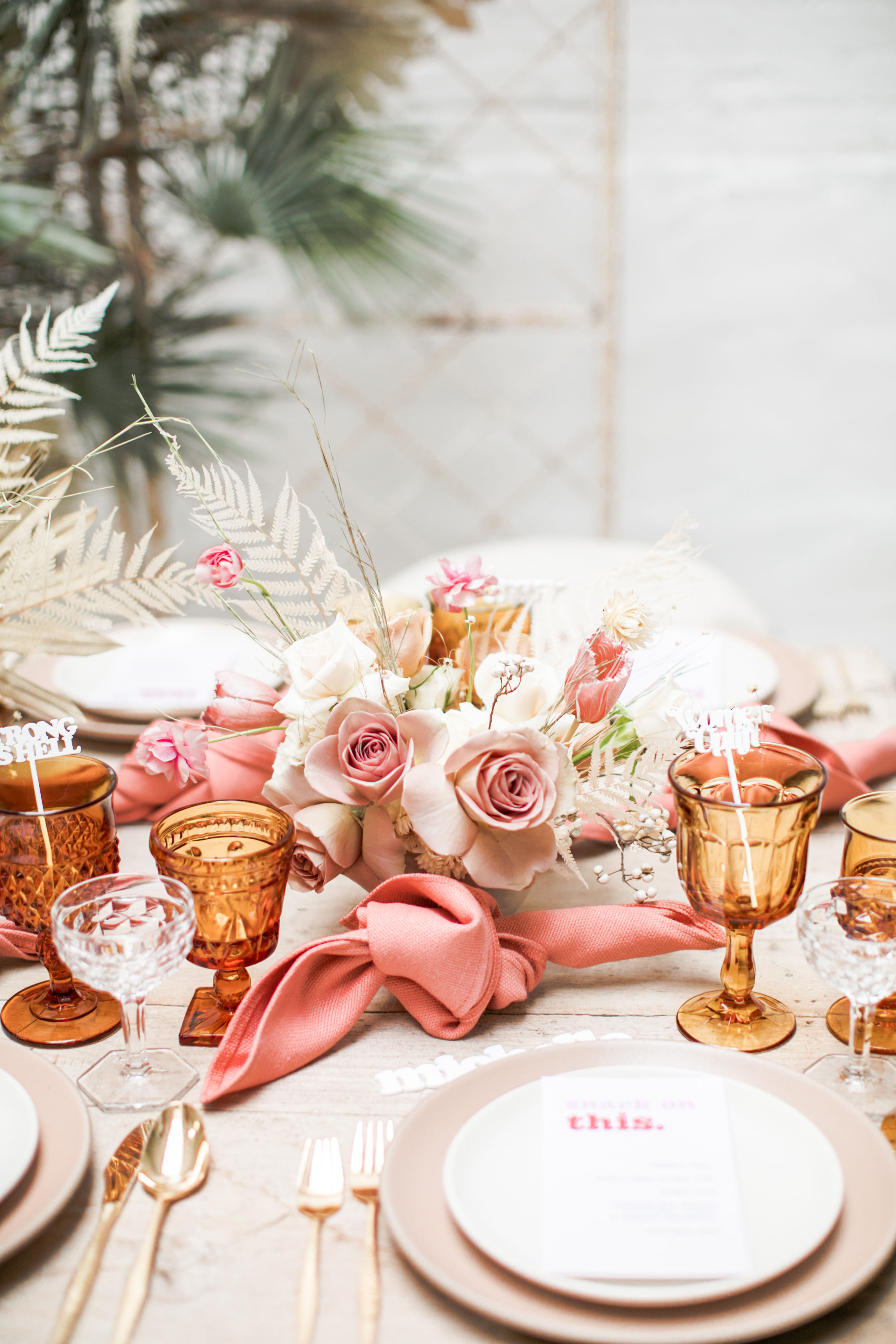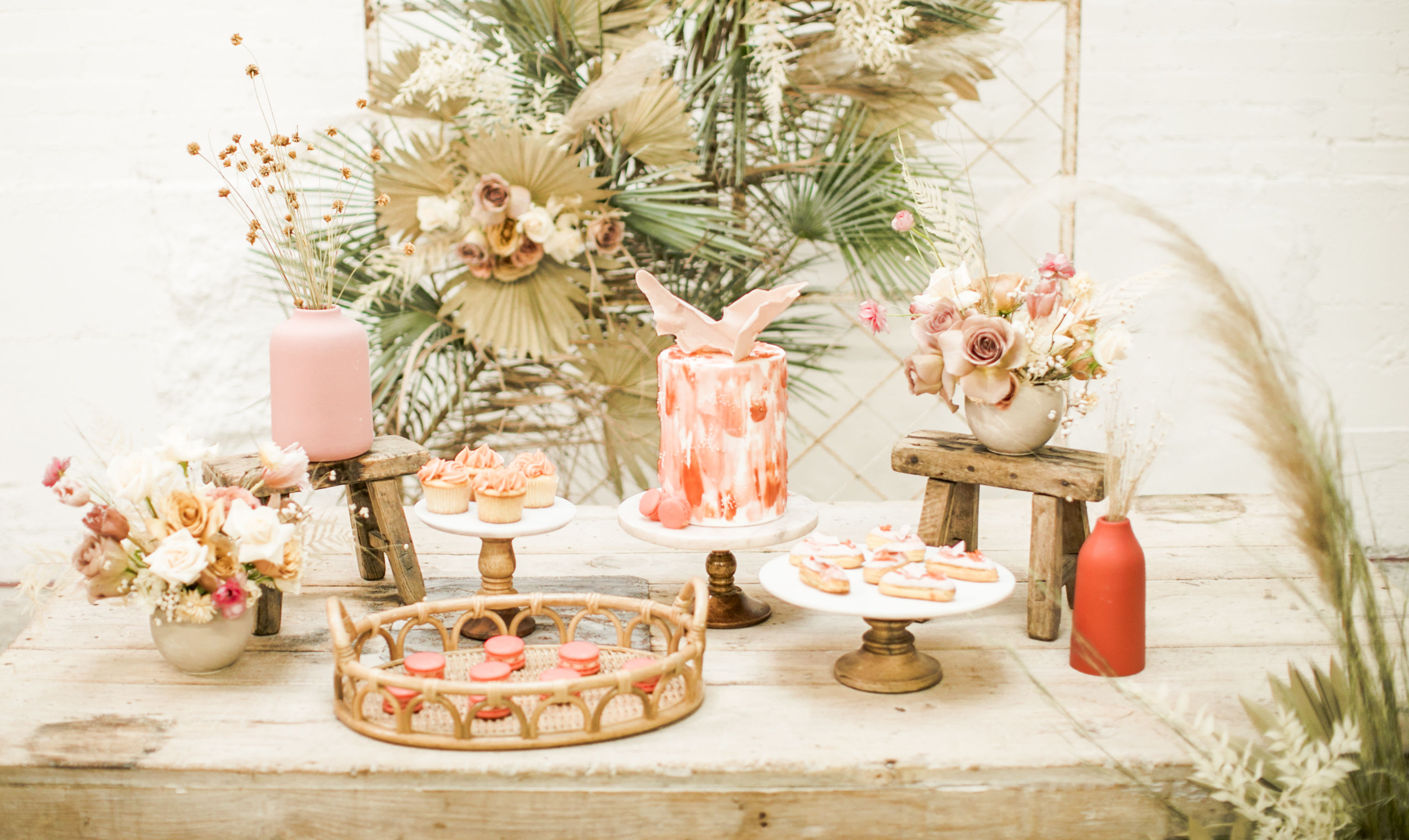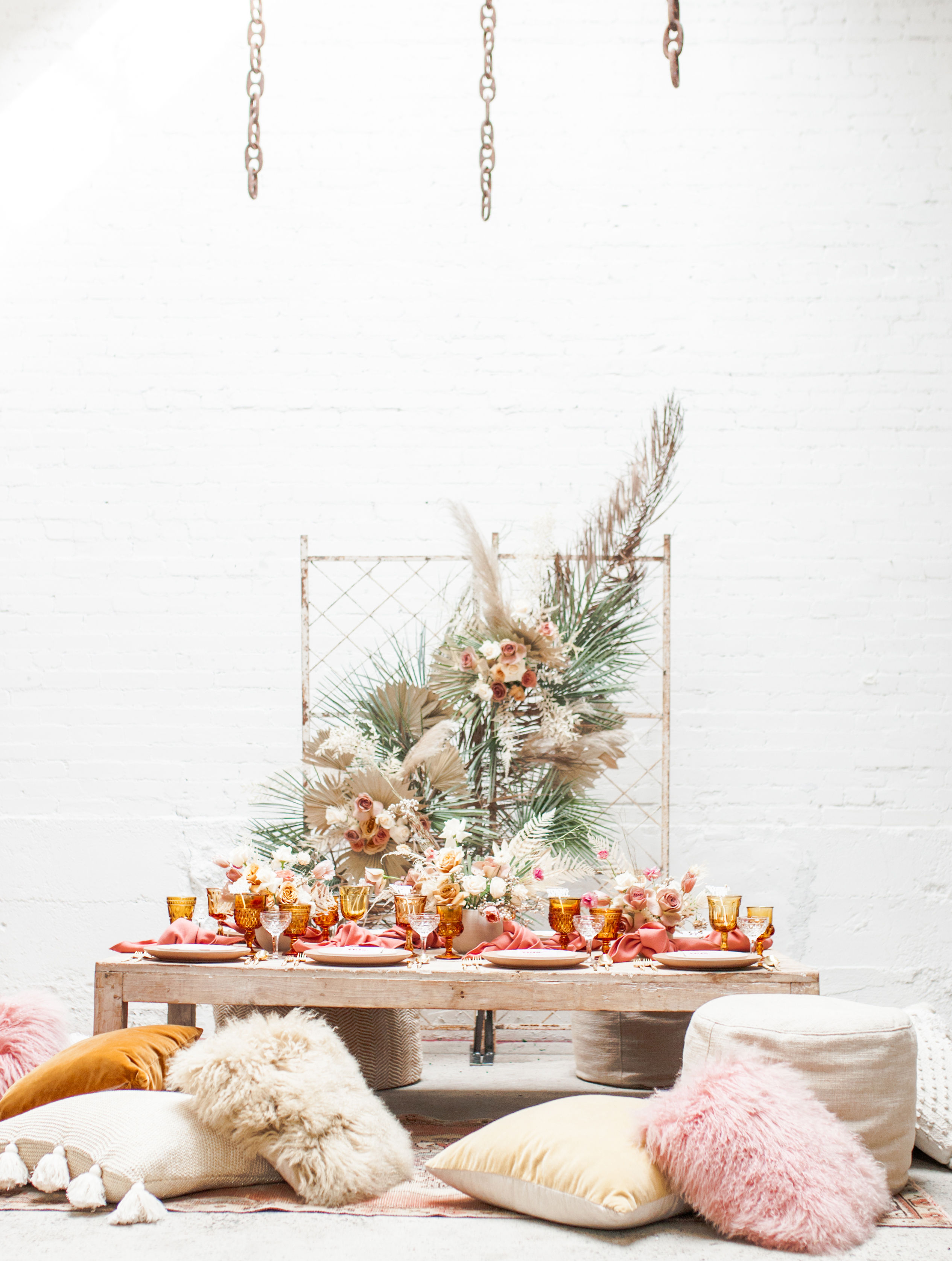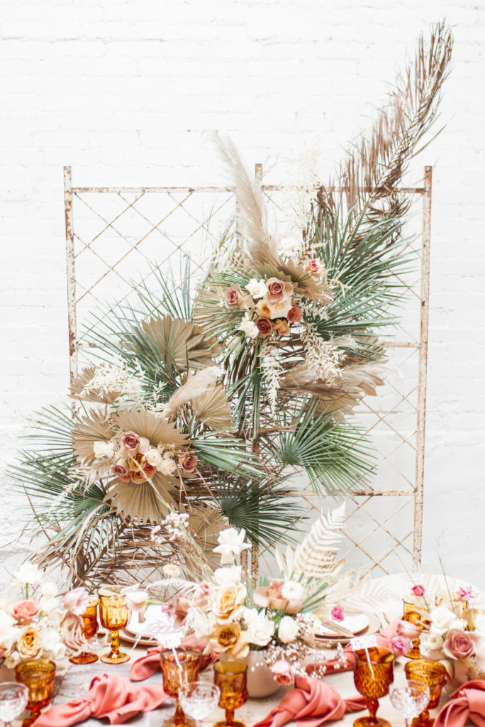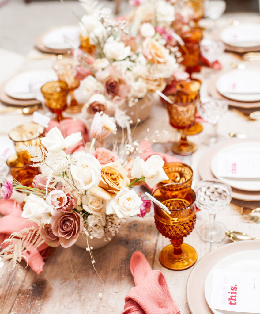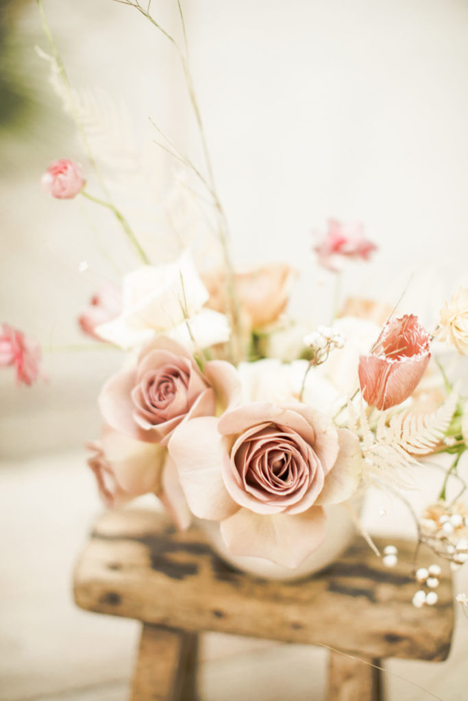 Ahhh… This set up is just everything I love. So many amazing and talented women went into making this gorgeousness come together. Let’s start with the venue and rentals – Marnie at Sweet Salvage is the best and has this great warehouse full of beautiful furniture and objects to use for our shoots. Then there’s Jennifer from Cherished Rentals who is also in the warehouse with all the stunning tabletop items you see here. These ladies make the perfect pair and always bring such amazing energy to our shoots, I’m so grateful to know and work with them.