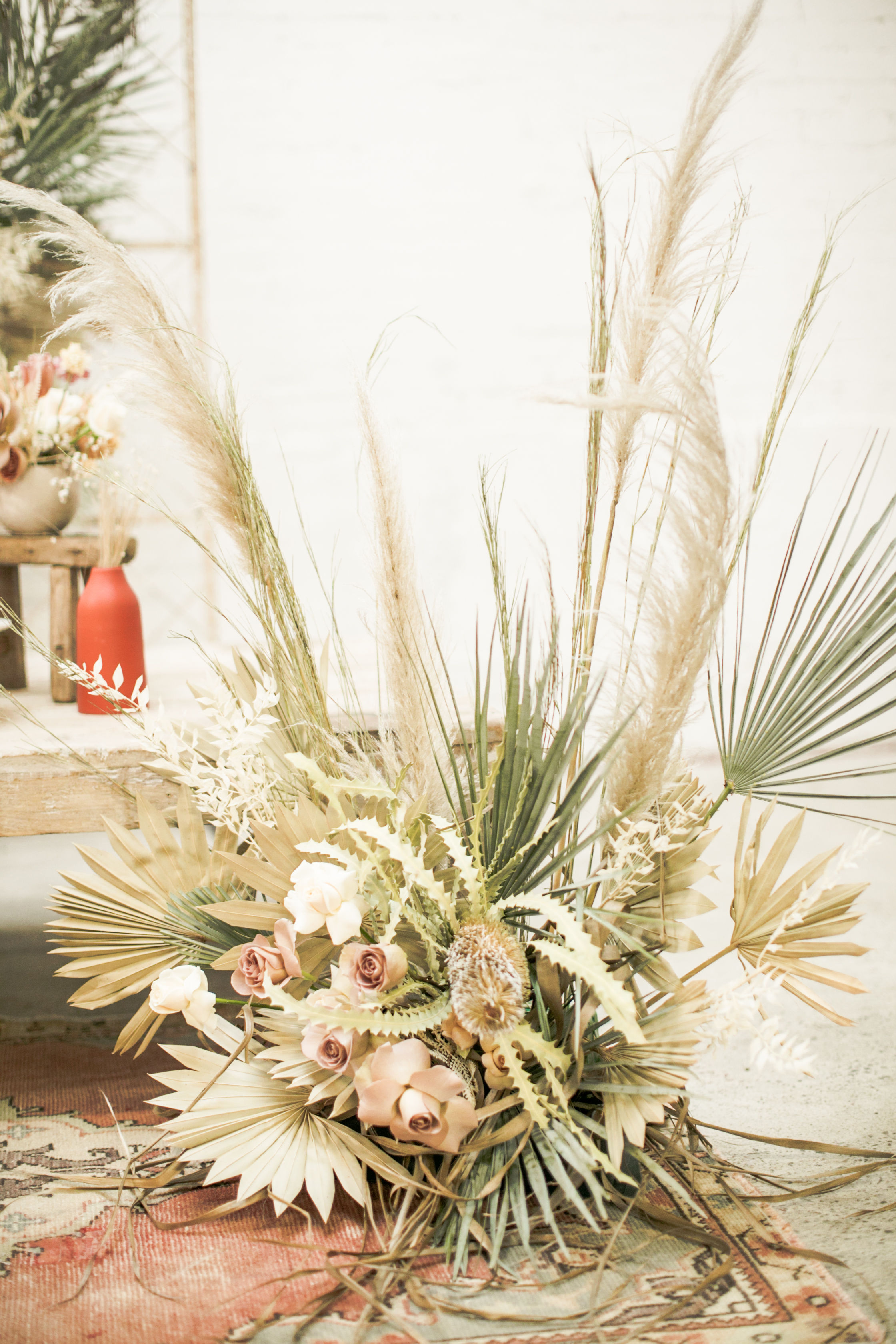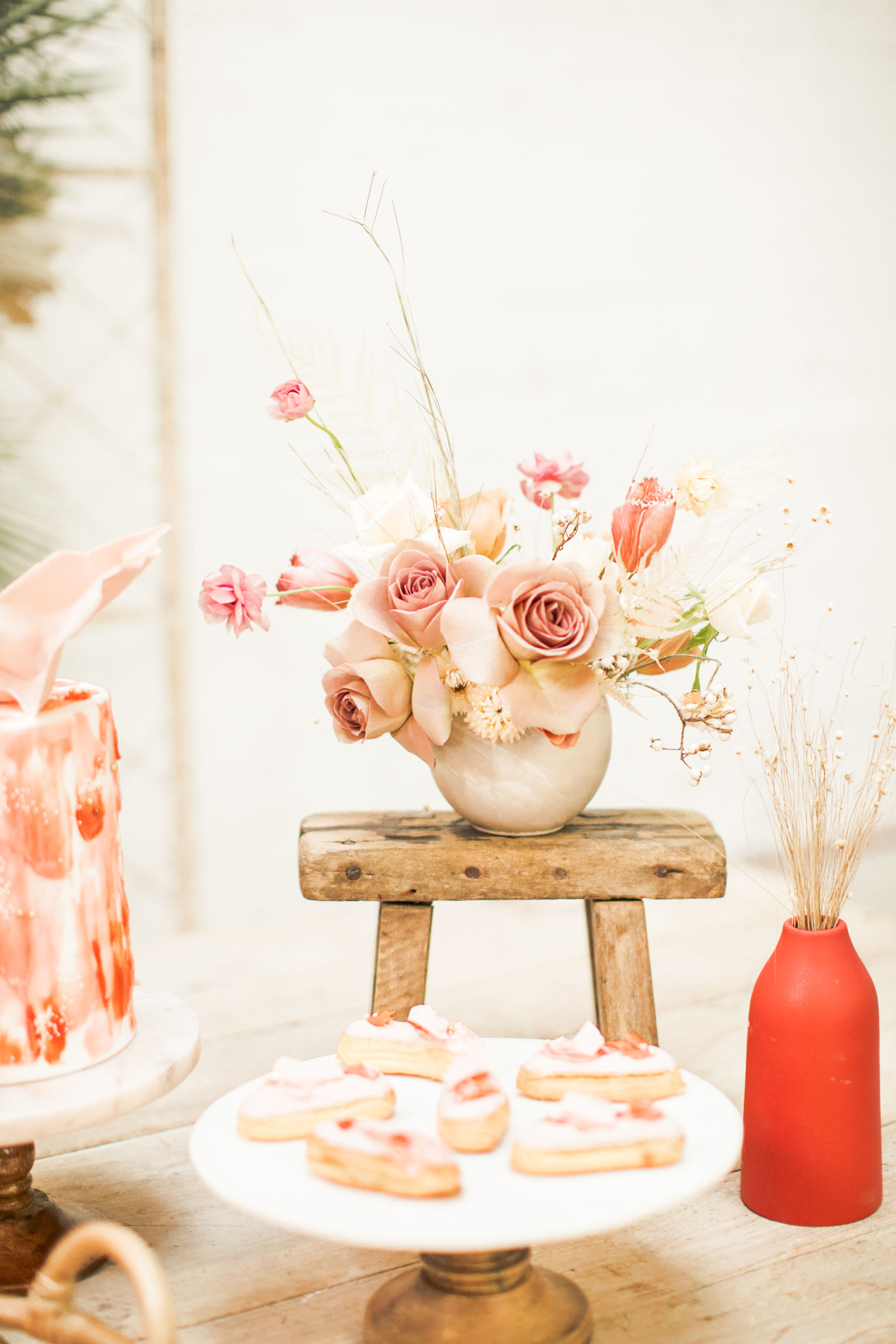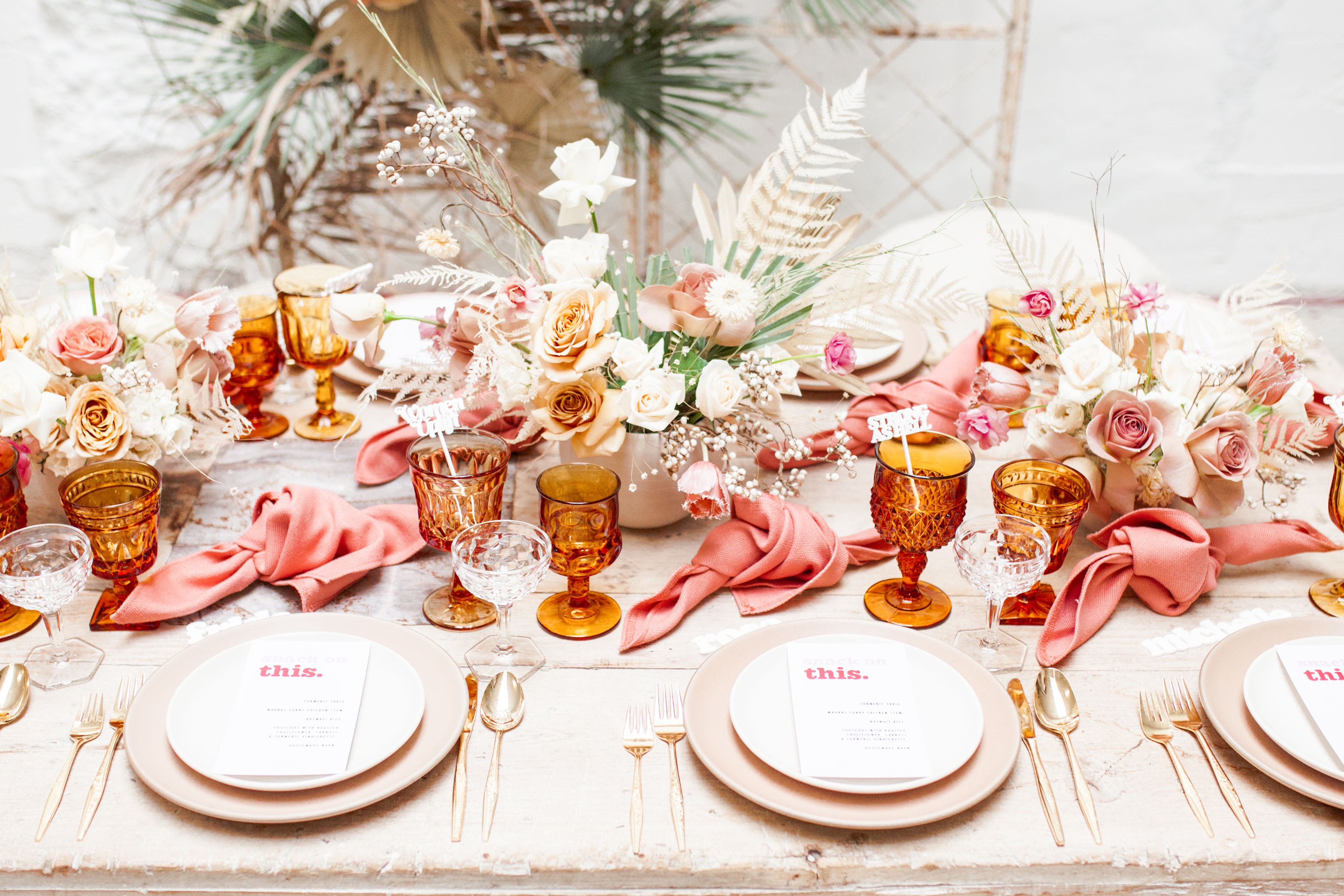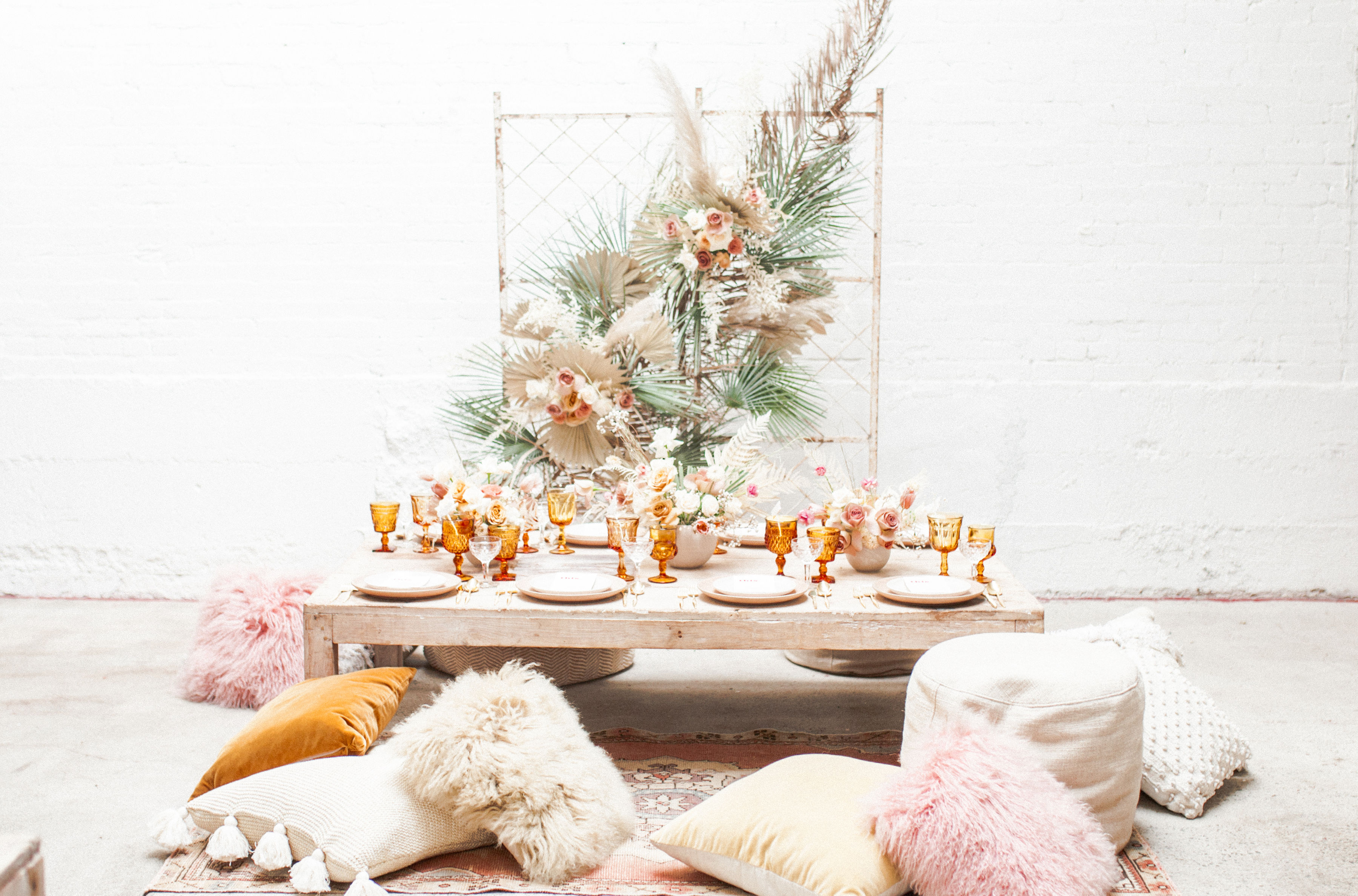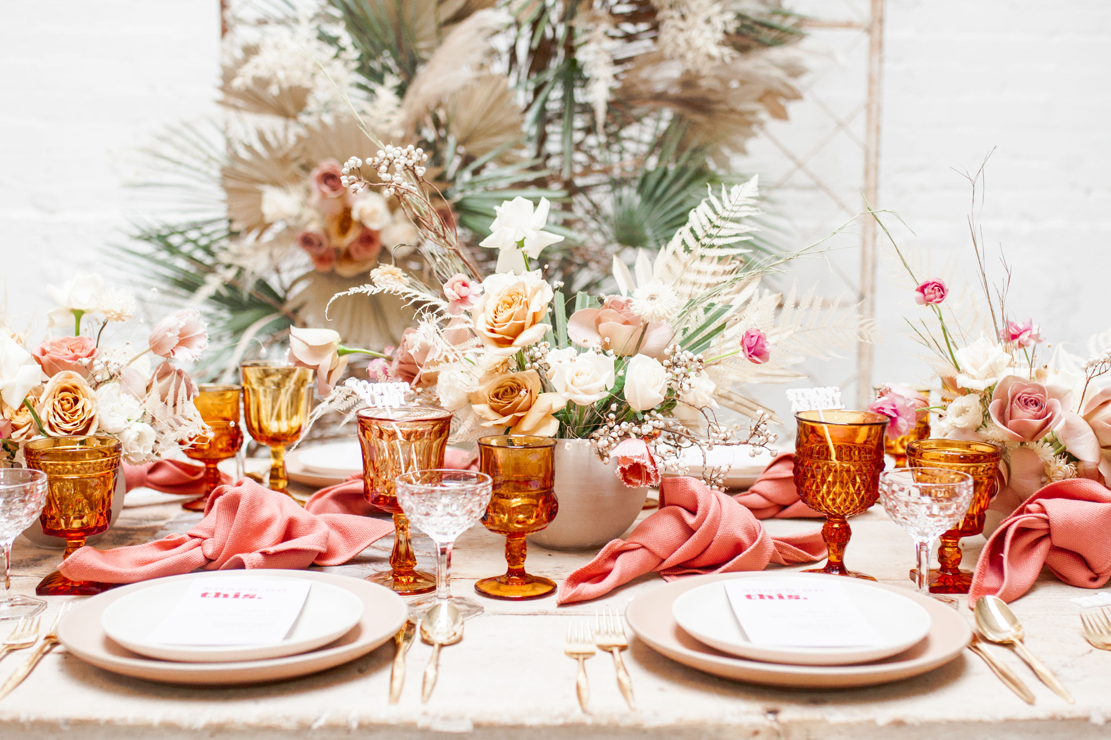 Ahhh… This set up is just everything I love. So many amazing and talented women went into making this gorgeousness come together. Let’s start with the venue and rentals – Marnie at Sweet Salvage is the best and has this great warehouse full of beautiful furniture and objects to use for our shoots. Then there’s Jennifer from Cherished Rentals who is also in the warehouse with all the stunning tabletop items you see here. These ladies make the perfect pair and always bring such amazing energy to our shoots, I’m so grateful to know and work with them.