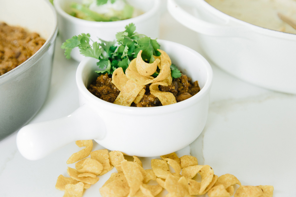 Serve it up with shredded cheddar, chopped onion, and Fritos.