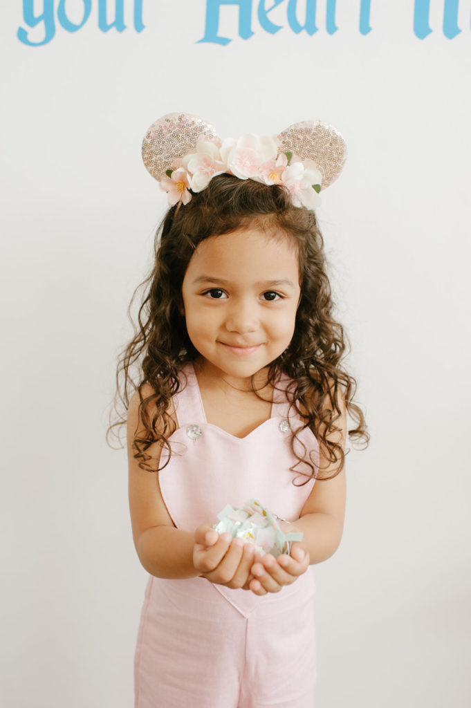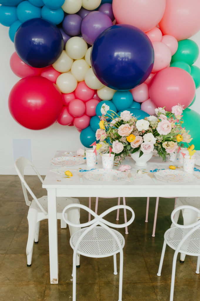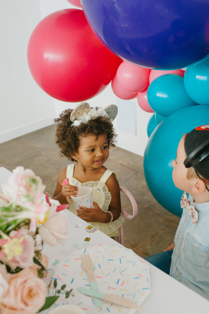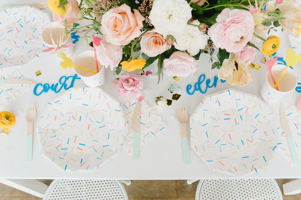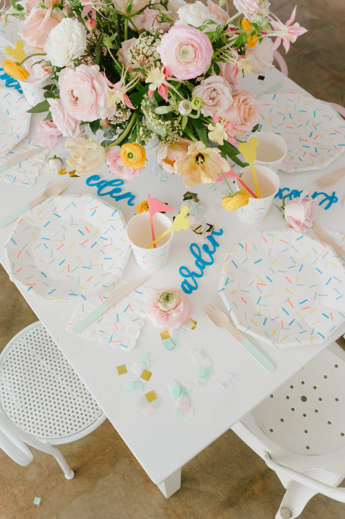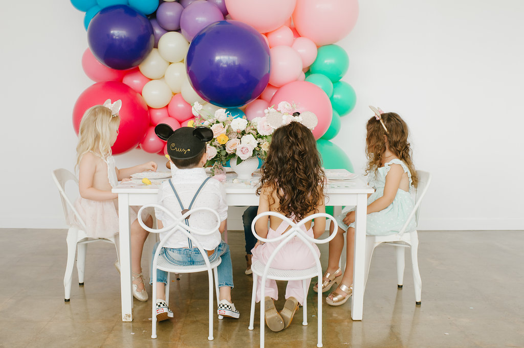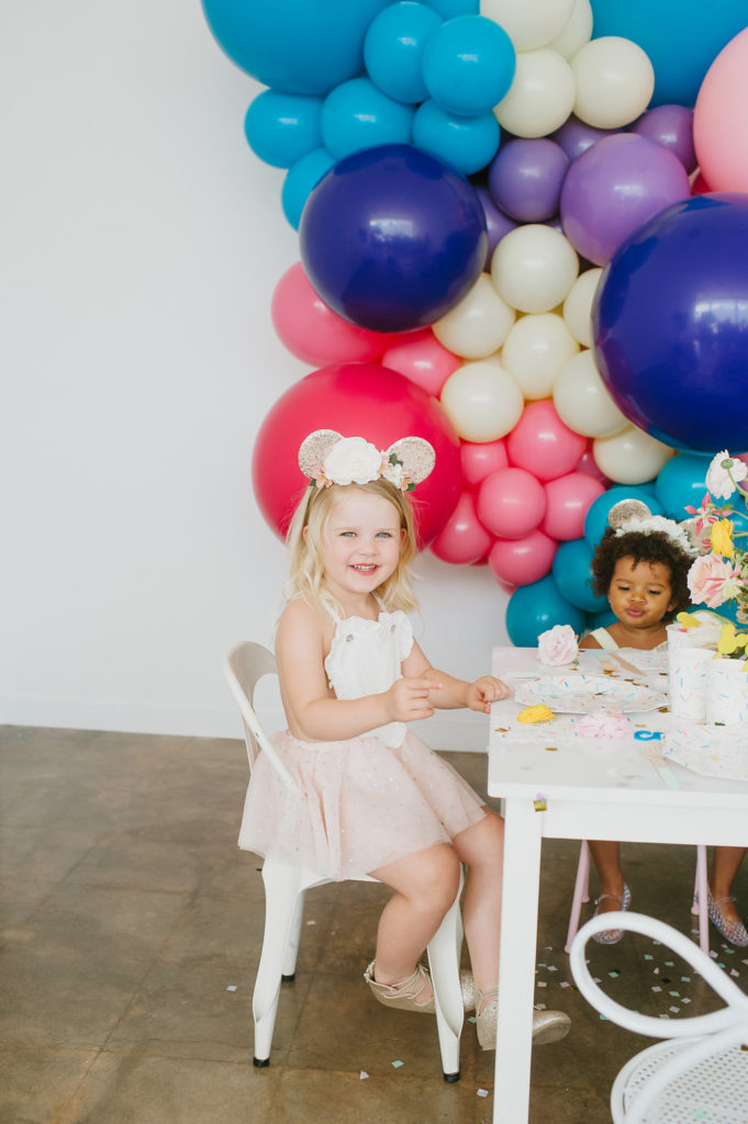 With a Disneyland party, we had to include balloons from our friends at Wild Child Party. They were the most amazing backdrop for our little party set up. We held our first Disney party at Wild Child’s space and we had to continue the fun with this little shoot! I also set the table with the most adorable plates, cups, napkins and flatware from their incredible tabletop selection. It’s a one stop shop y’all!!