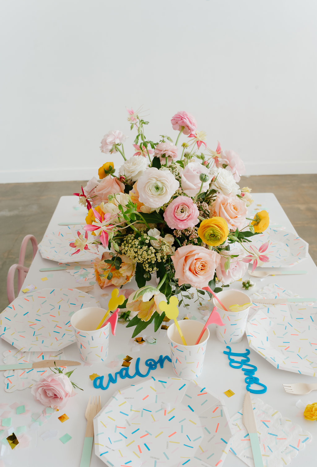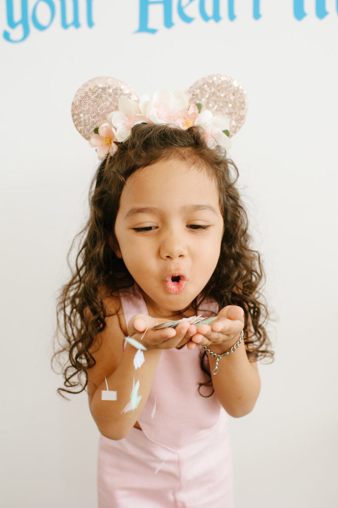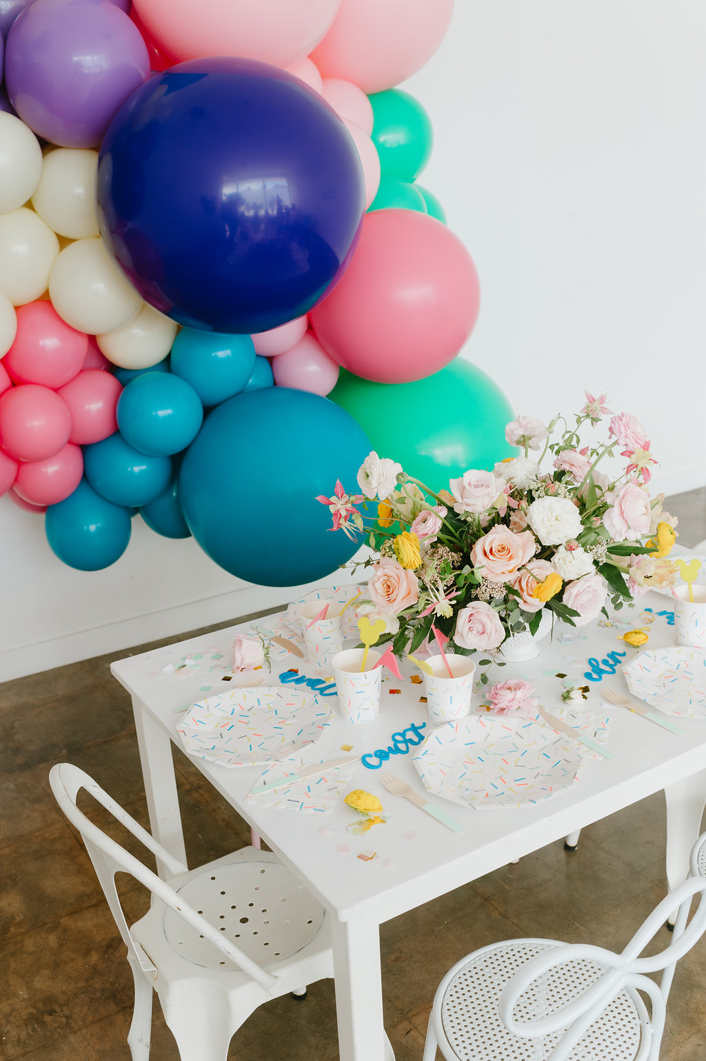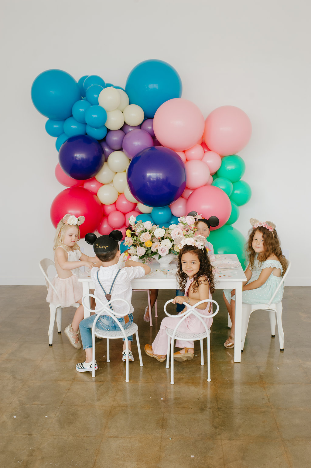 With a Disneyland party, we had to include balloons from our friends at Wild Child Party. They were the most amazing backdrop for our little party set up. We held our first Disney party at Wild Child’s space and we had to continue the fun with this little shoot! I also set the table with the most adorable plates, cups, napkins and flatware from their incredible tabletop selection. It’s a one stop shop y’all!!