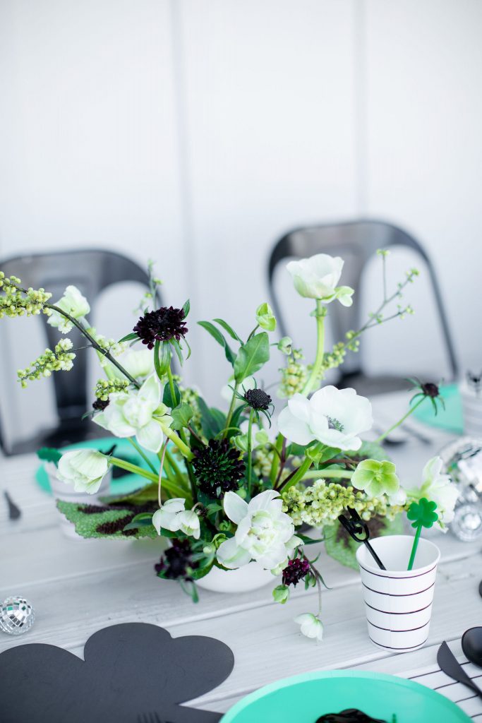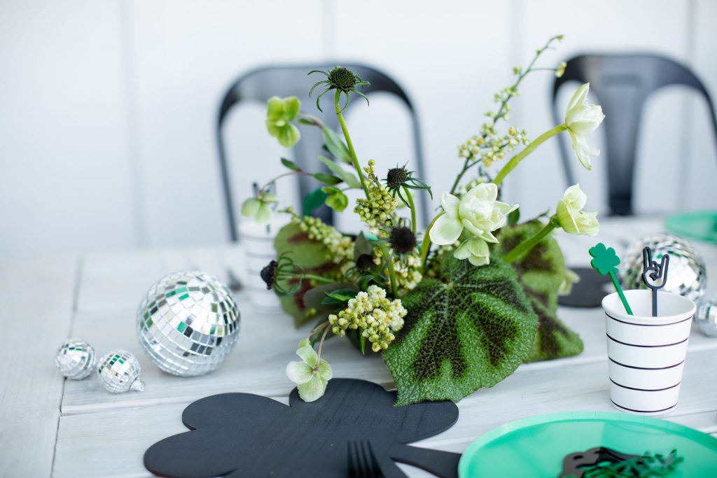 The table is set!! My friend David & Leanna did the cutest black shamrocks to go with our green plates from Oh Happy Day Party Shop. Then I added Daydream Society’s black and white napkins & cups and Sophistiplate’s black and white flatware. Other adorable details by David & Leanna were those rock and roll place cards and stir sticks. So fun, right?! Rock on!!