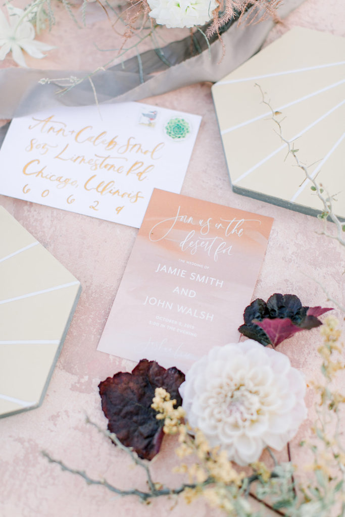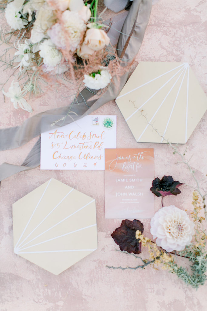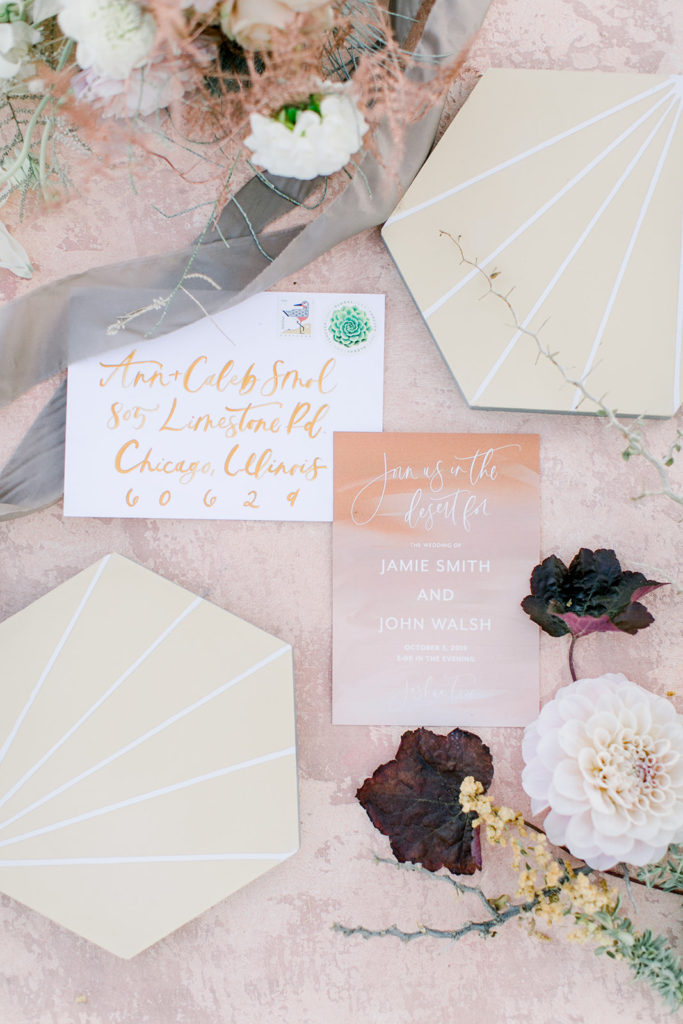 Onto the details… Proper Letter made this pretty invite suite that I styled on Chasing Stone’s styling surface aptly named “Joshua Tree”. The soft pink tones are reminiscent of the sunsets in the desert and it all looked so lovely together. Add in some amazing tiles from Cement Tile Shop and a to die for bouquet by Third & Park and it’s pretty darn gorgeous…