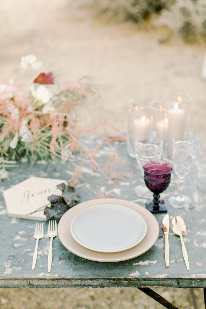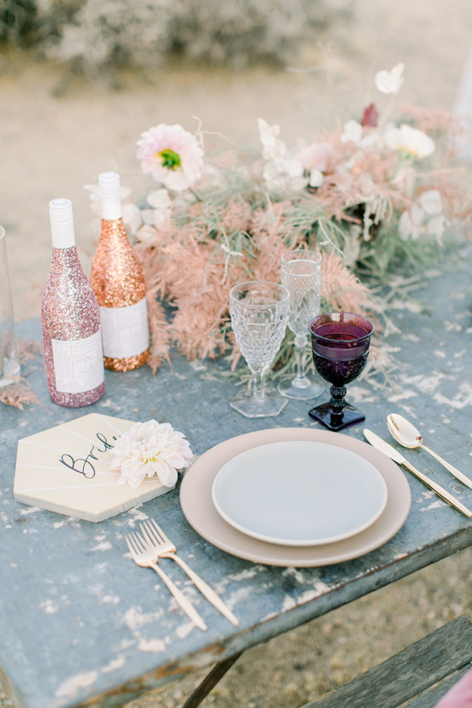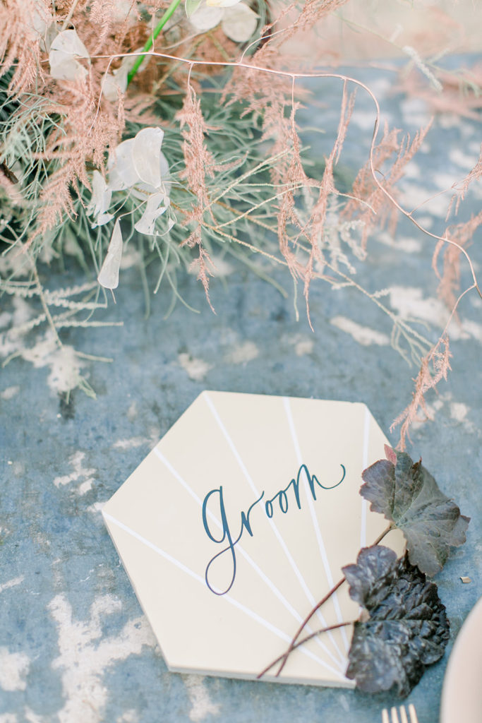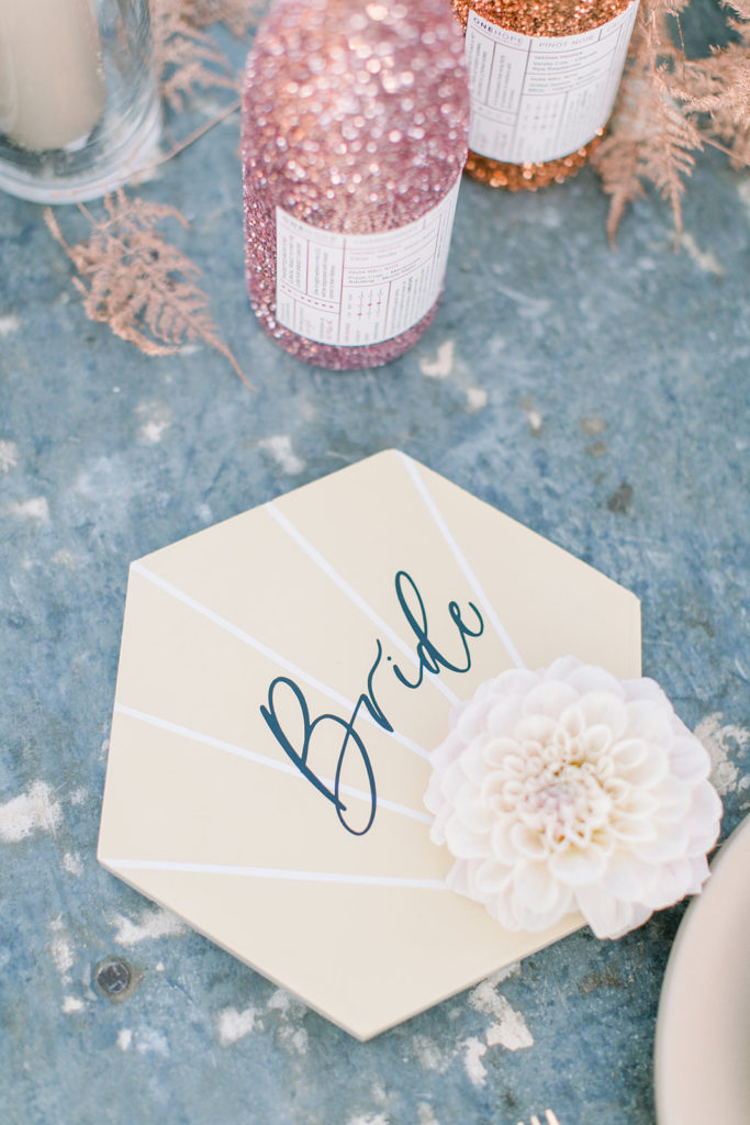 I set the table with Cherished Rentals beautiful tabletop pieces, their heath ceramic plates and vintage glassware are so pretty together. You’ll spot those pretty tiles from Cement Tile Shop again, I loved them and loved using them as place cards for our bride and groom! Proper Letter added her hand to them and made then complete!