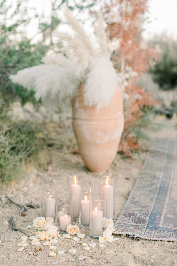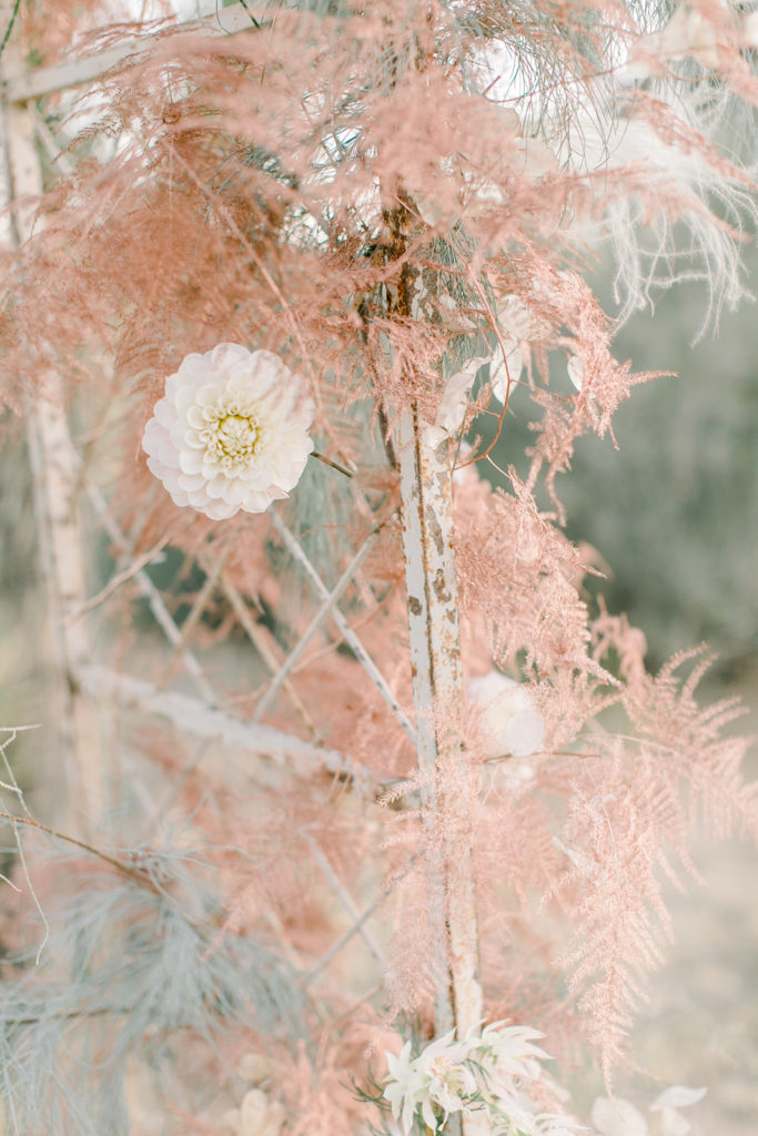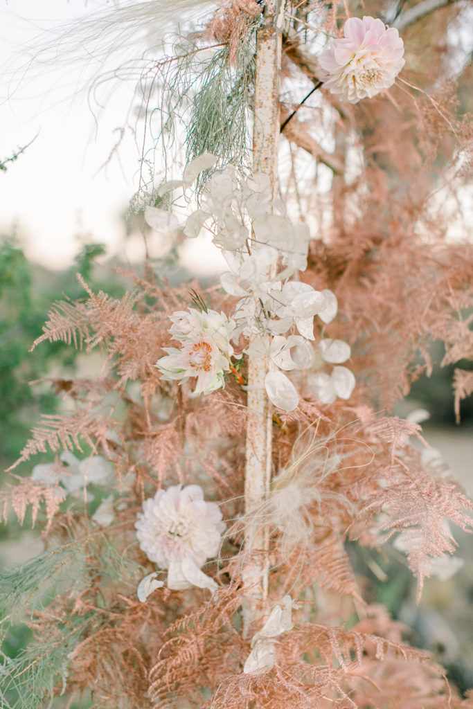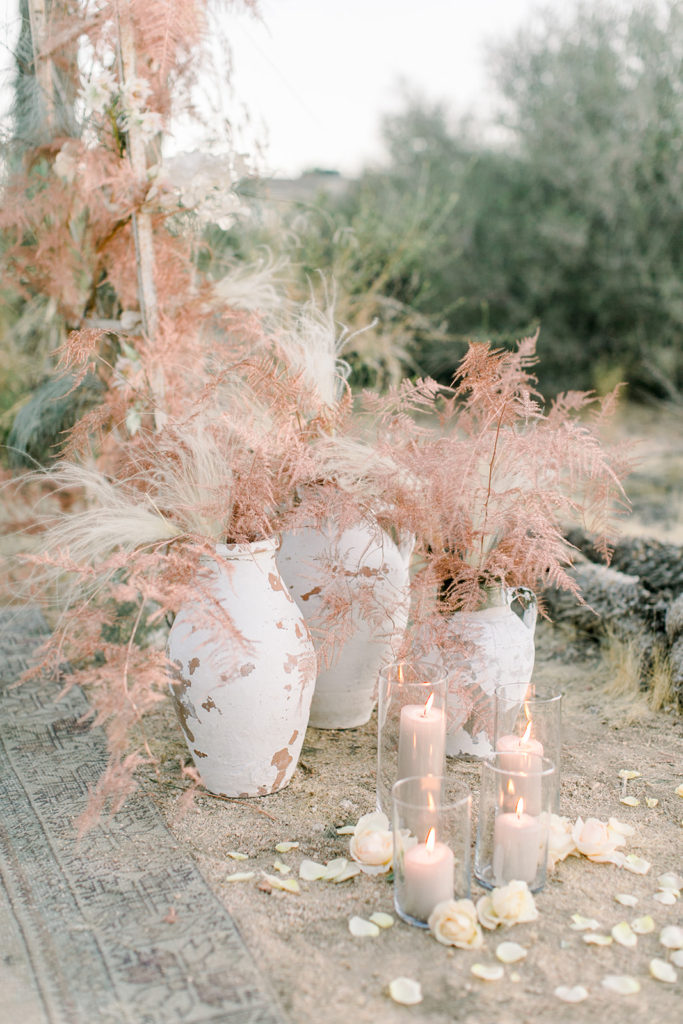 Our ceremony site is one of my favorite elements of this shoot. Third & Park used adorned a Sweet Salvage arch with tones of copper toned florals. We then used candles and the prettiest vases from Sweet Salvage and added pampas grass. It’s the ideal bohemian situation and I am here for it!