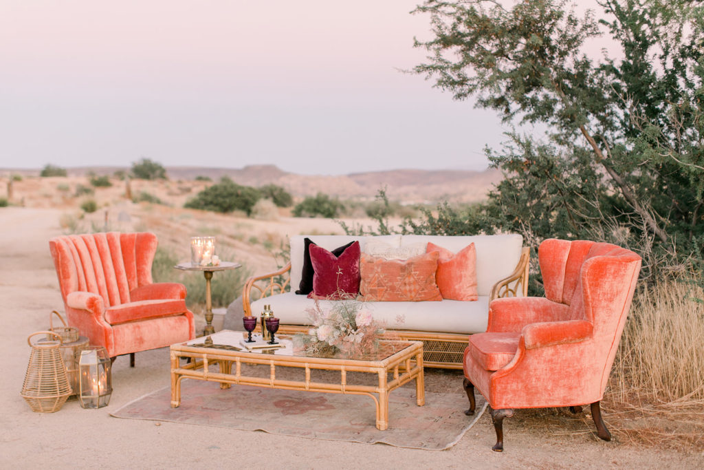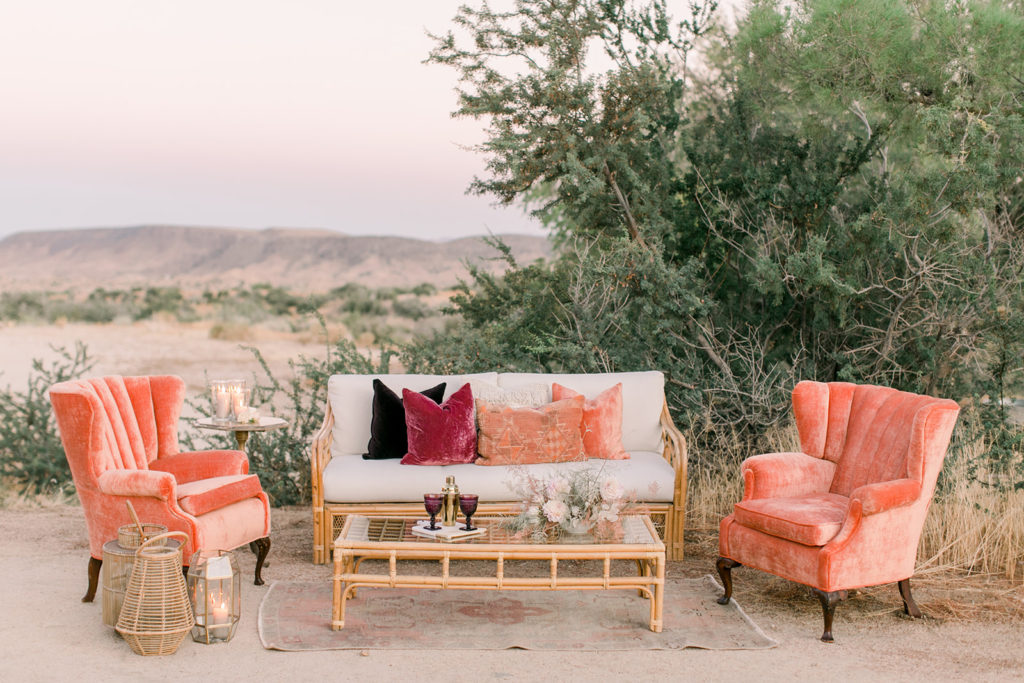 Last but not least, a pretty lounge situation is needed!! Sweet Salvage used their pretty pieces to create this ideal situation. And those coral chairs are looking real good!!!