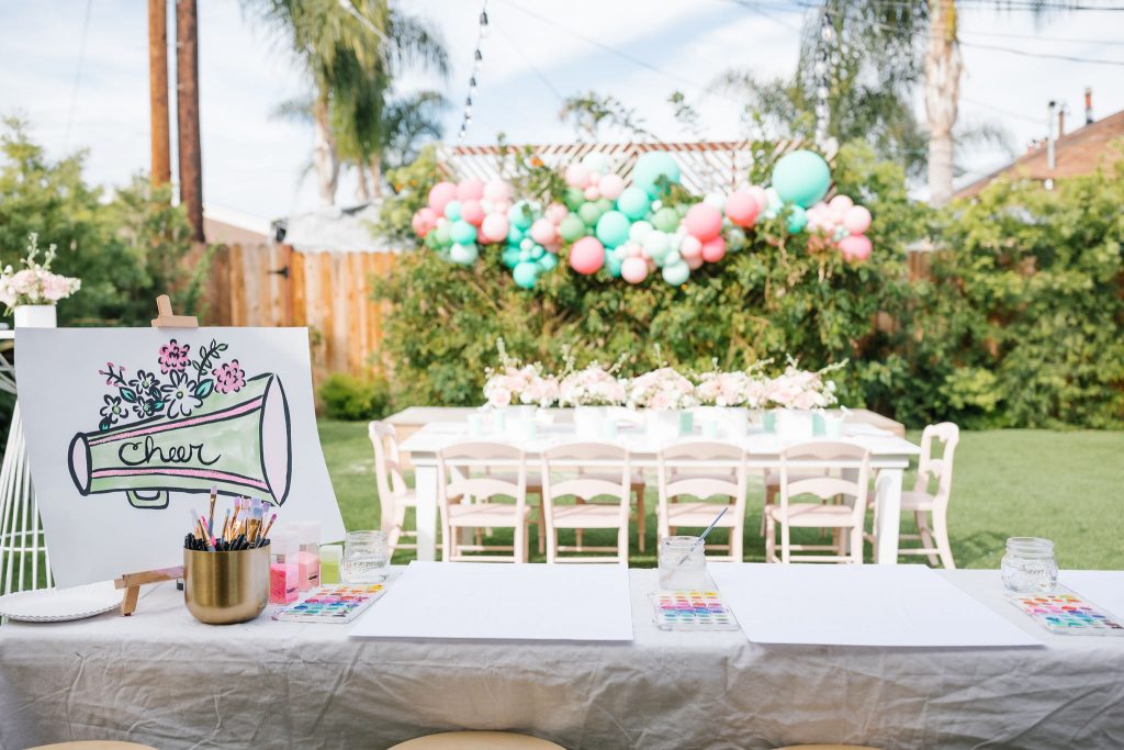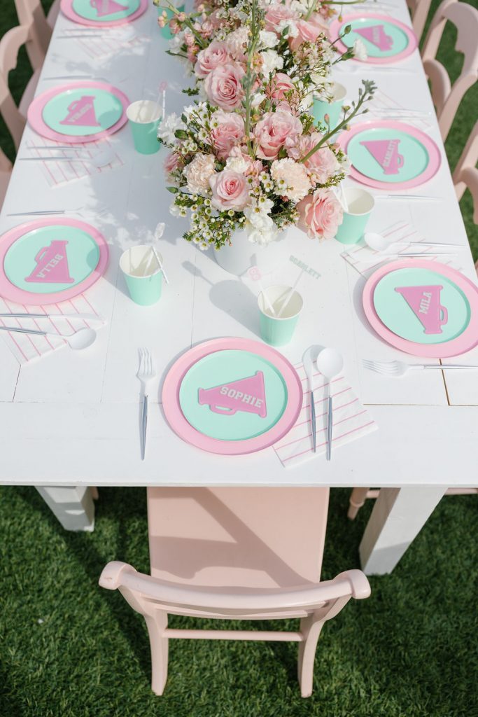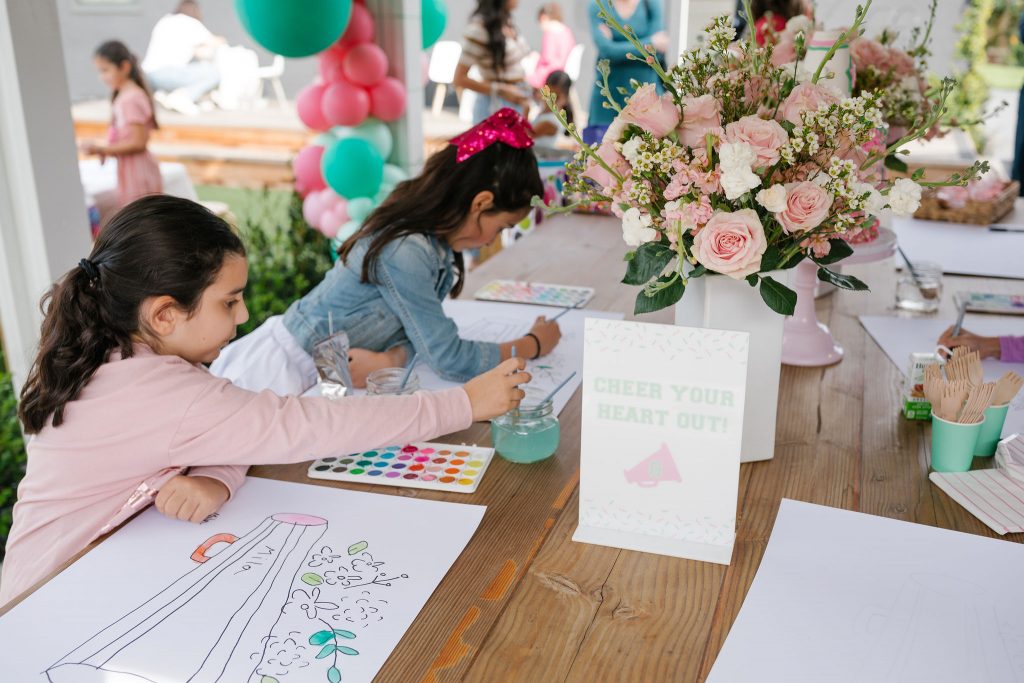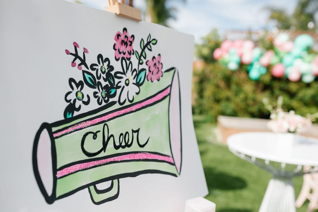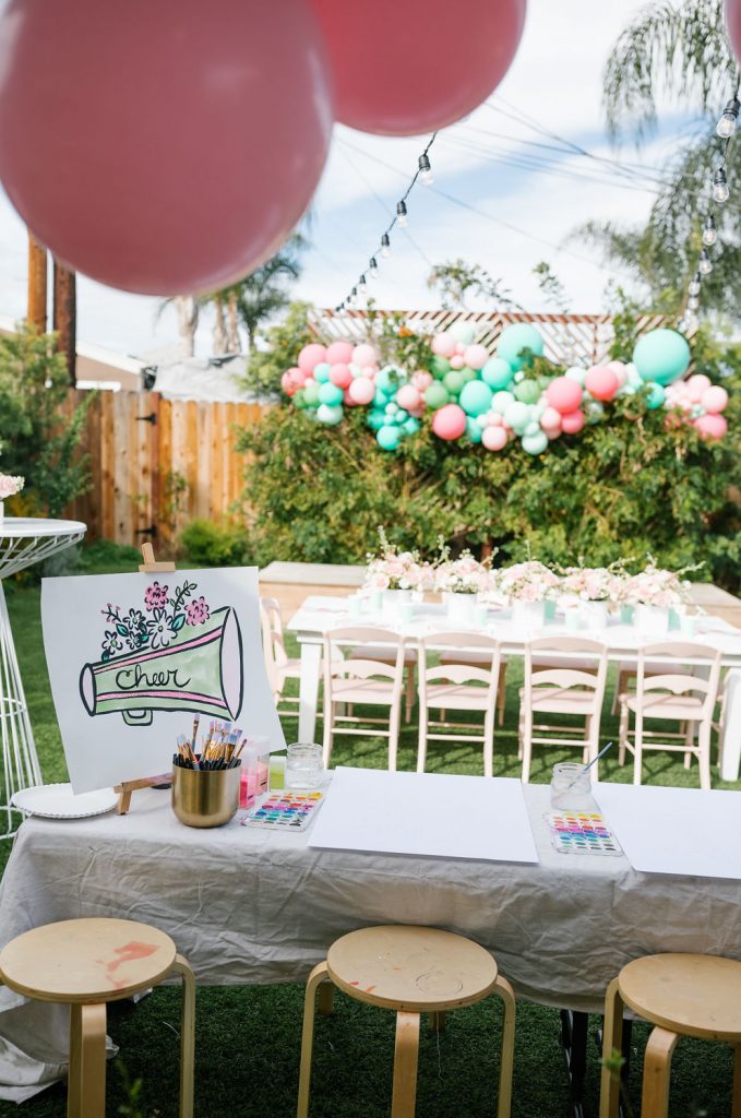 Scarlett was turning 8 and wanted to cheer her heart out with a cheerleader themed party! She loves the movie Zombies and we had so much fun using the greens and pinks from the cheerleaders in that movie to create this cute atmosphere. It doesn’t hurt that the party was held at our favorite Camp Lila – the cutest little venue with the most amazing art parties. Lets take a closer look at all the adorable details and fun captured by the amazing Alison Bernier!