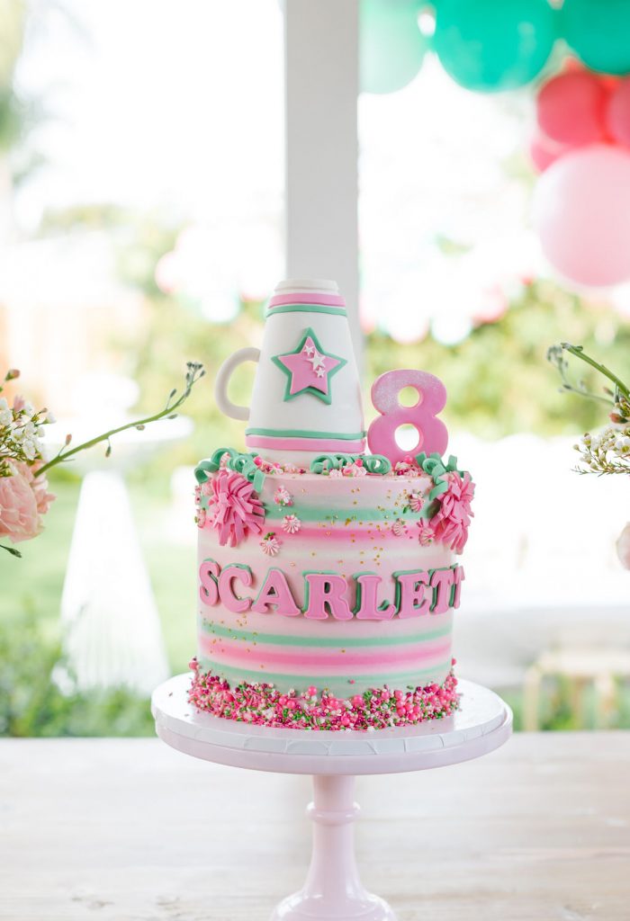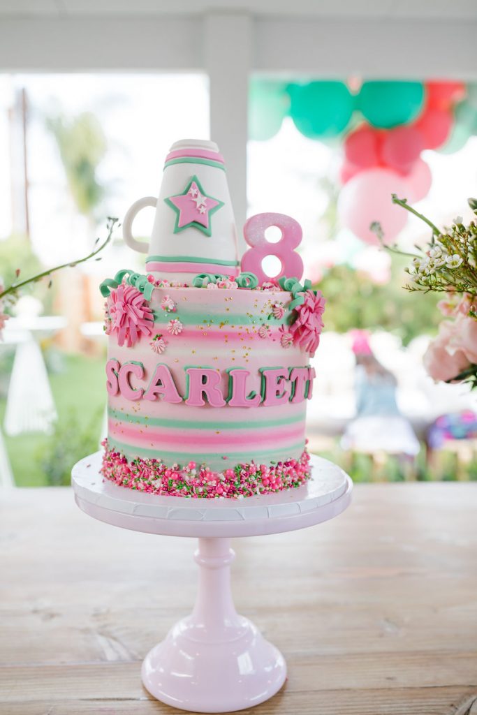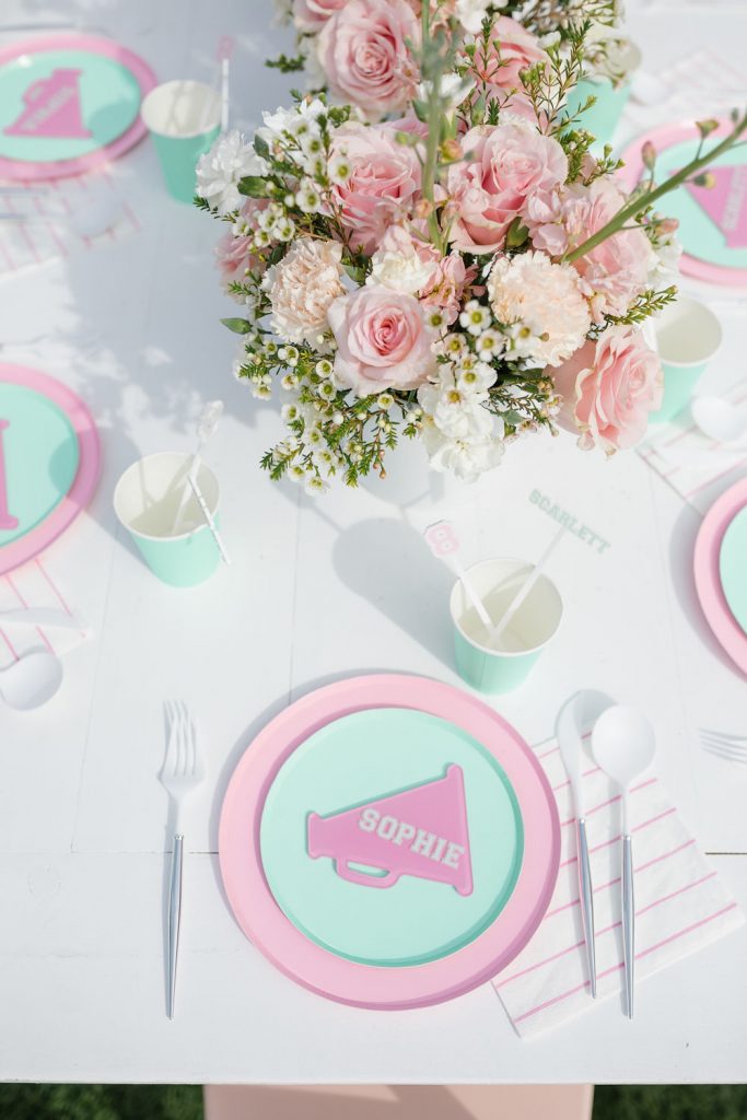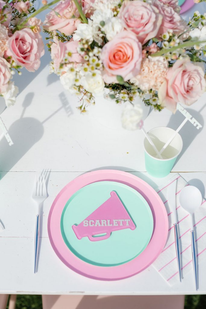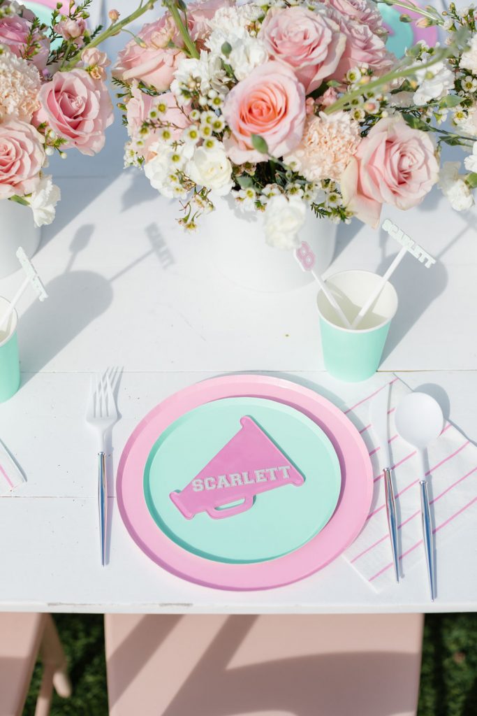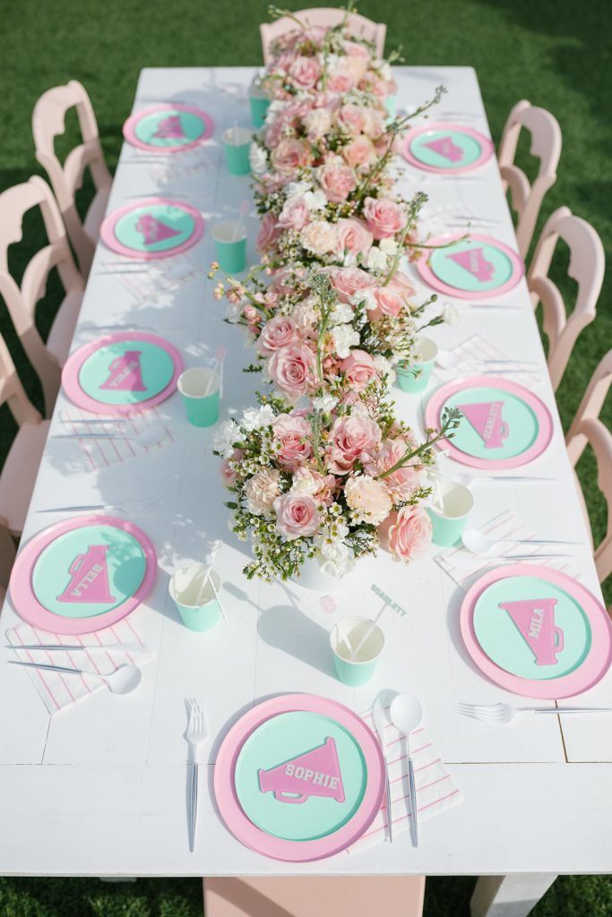 Scarlett was turning 8 and wanted to cheer her heart out with a cheerleader themed party! She loves the movie Zombies and we had so much fun using the greens and pinks from the cheerleaders in that movie to create this cute atmosphere. It doesn’t hurt that the party was held at our favorite Camp Lila – the cutest little venue with the most amazing art parties. Lets take a closer look at all the adorable details and fun captured by the amazing Alison Bernier!
