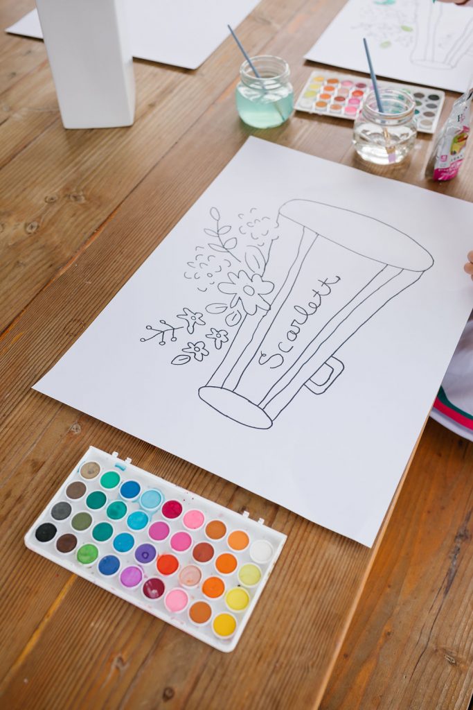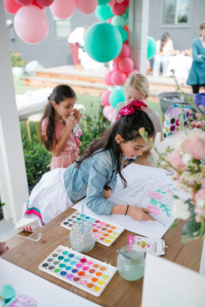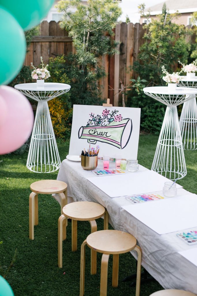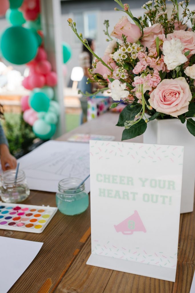 Camp Lila had art ready for the guests to be a part of! An adorable cheer megaphone with flowers in our color scheme, so perfect! I love how they always keep the littles so busy being creative at our parties.