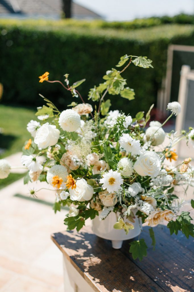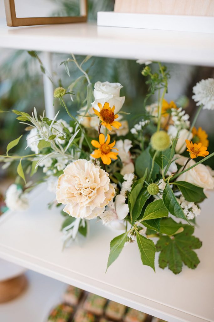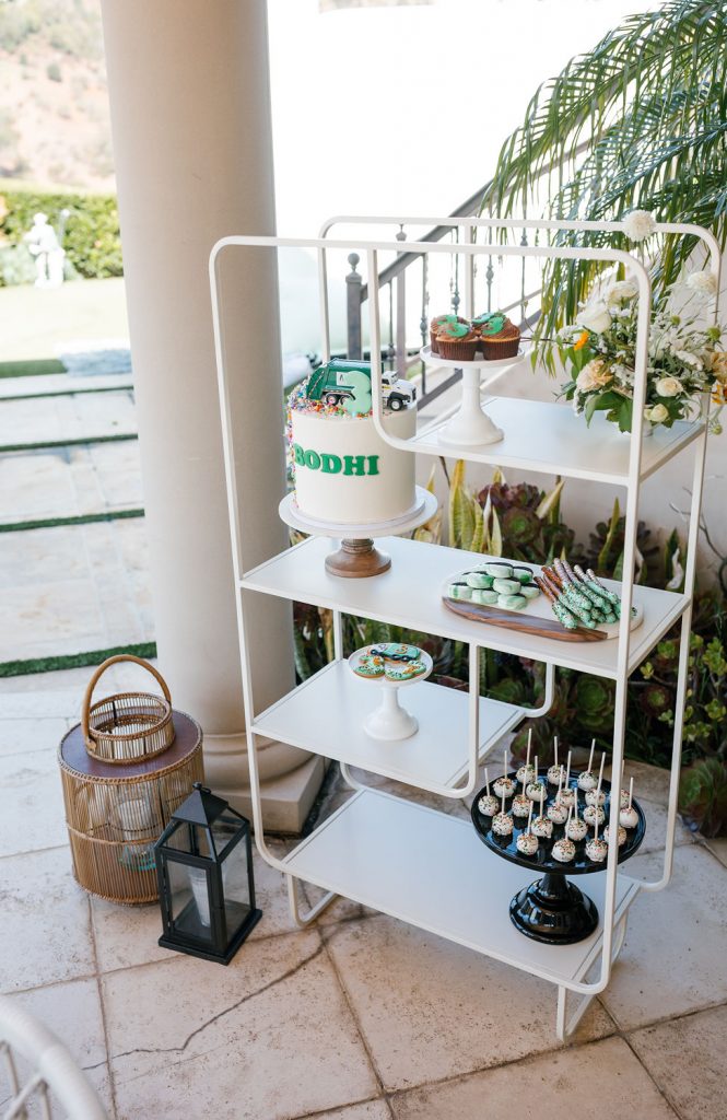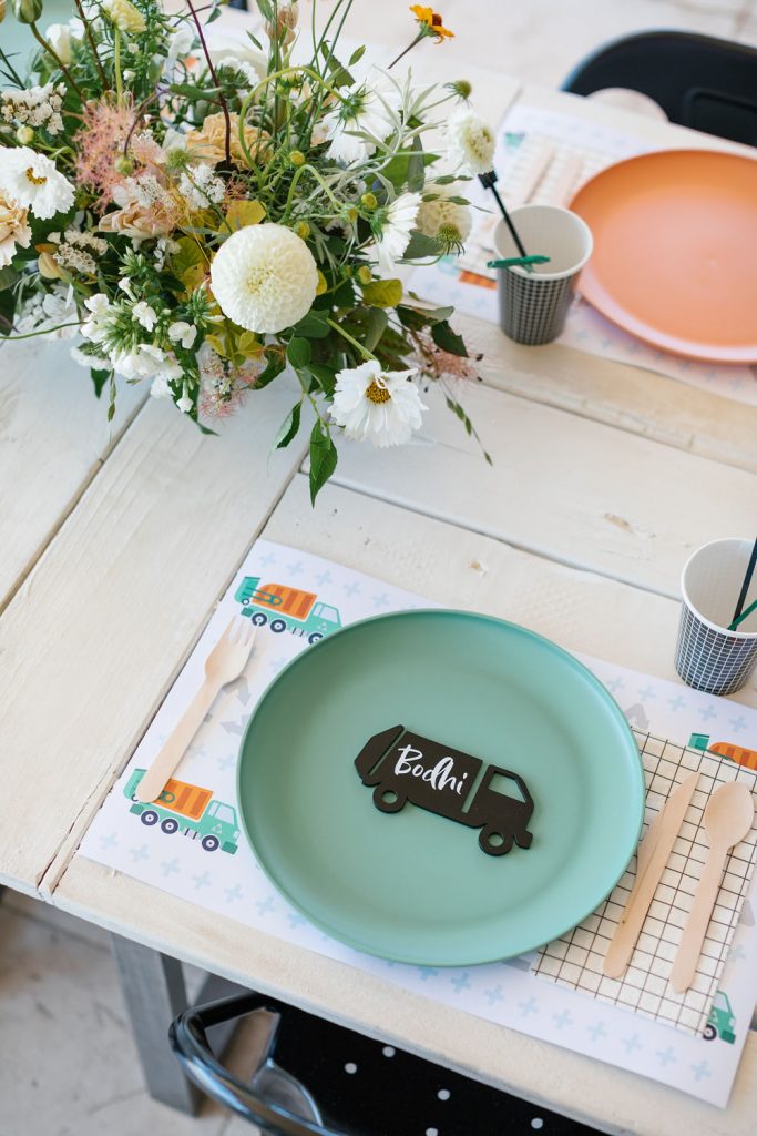 Check out these cute tables we set for Bodhi and his preschool buddies! Of course, we used Sweet Salvage Rentals for all things from tables to chairs to the lounge! Earth and Grace did their magic with the florals doing the perfect amount of white, greens, and a pop of color! Even though it’s a boy party I still love to keep florals on the table, they add so much and can still have a masculine touch.