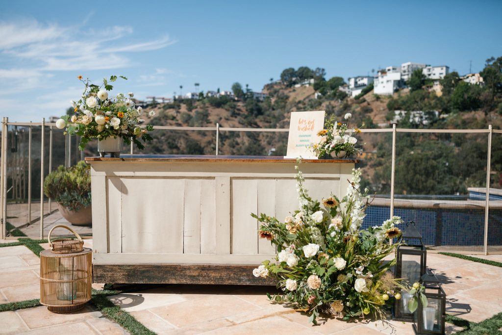 Guests were greeted at the front door by an incredible balloon installation by Balloon Works. I love the mixture of green and orange with the neutral tan and black! Plus the cutest welcome sign by Poppy Jack Shop accompanied by greenery from Earth & Grace. Talk about a good first impression!!