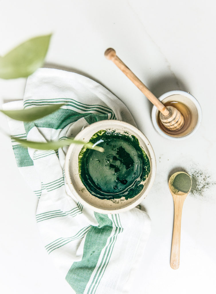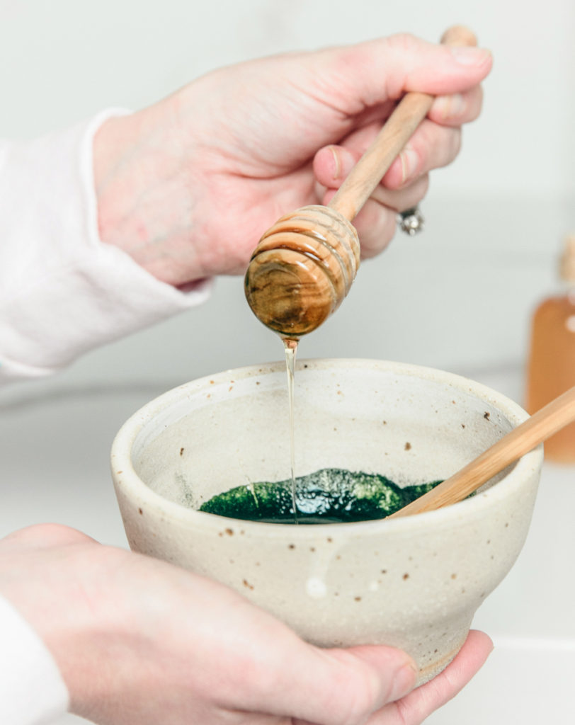 This face-focused version utilizes the anti-aging powers of raw honey to boost spirulina’s detoxifying, toning, inflammation calming, and softening properties.