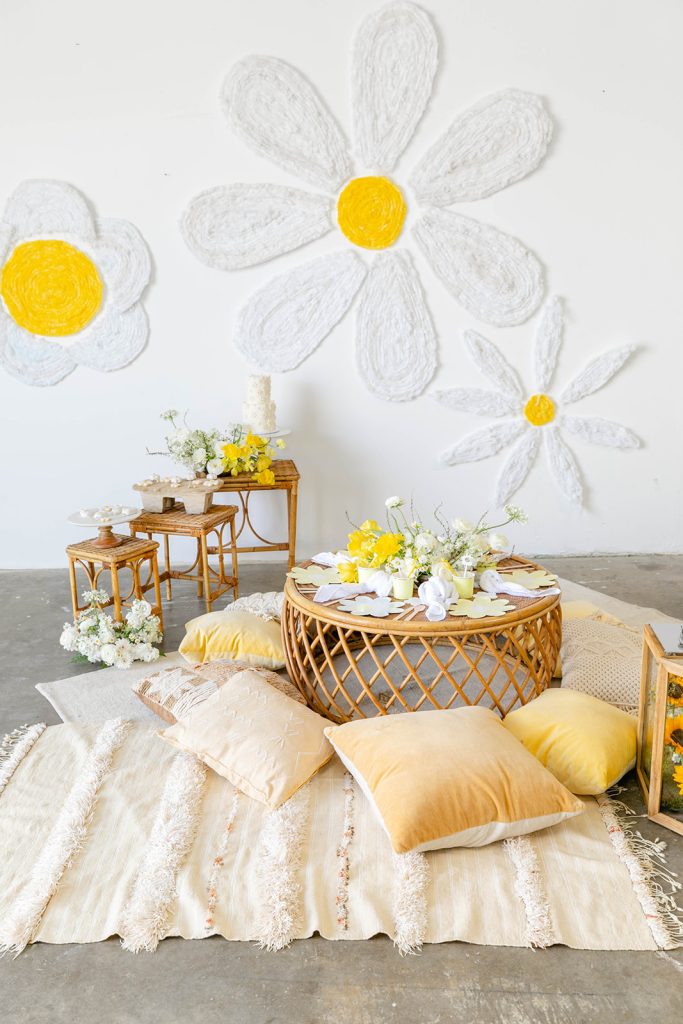 My favorite color is yellow, and when we decided to do a little Daisy themed week on the blog last year I got super excited to play with my favorite color! I enlisted the help of my talented friend Jesi Haack to do a backdrop for this one going outside the box and not using balloons. What she created blew me away! When she explained it to me I just sort of said, ok I trust you, but when I saw it I was blown away!! Adding in all of the rattan furniture from Sweet Salvage Rentals just completed our whimsical boho look! Love, love, love!