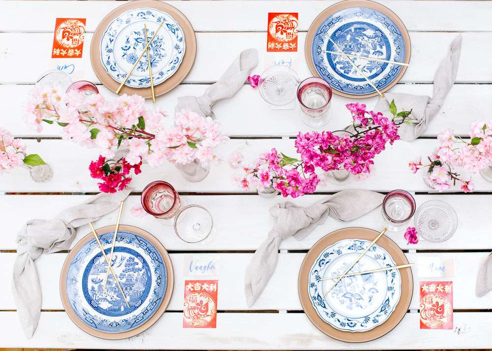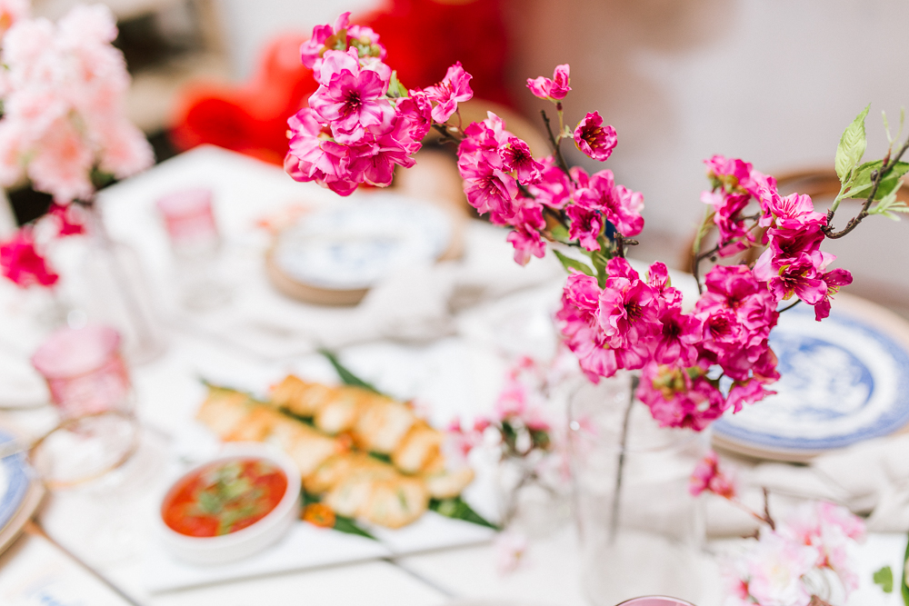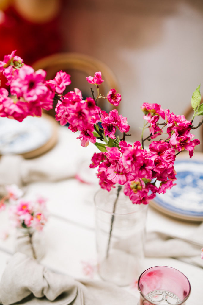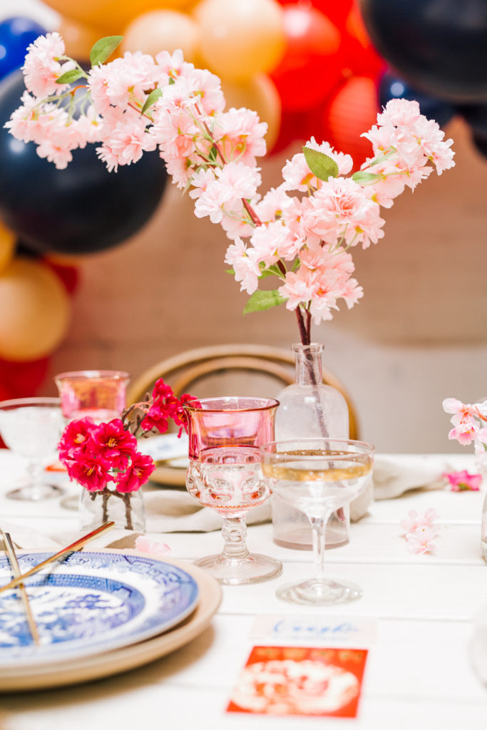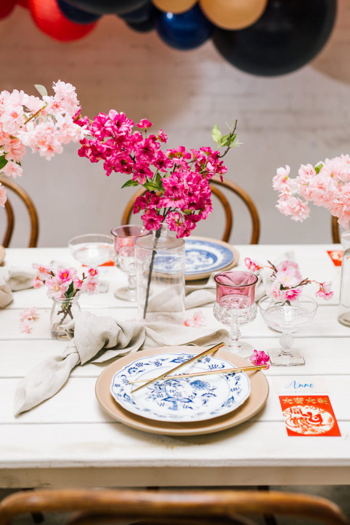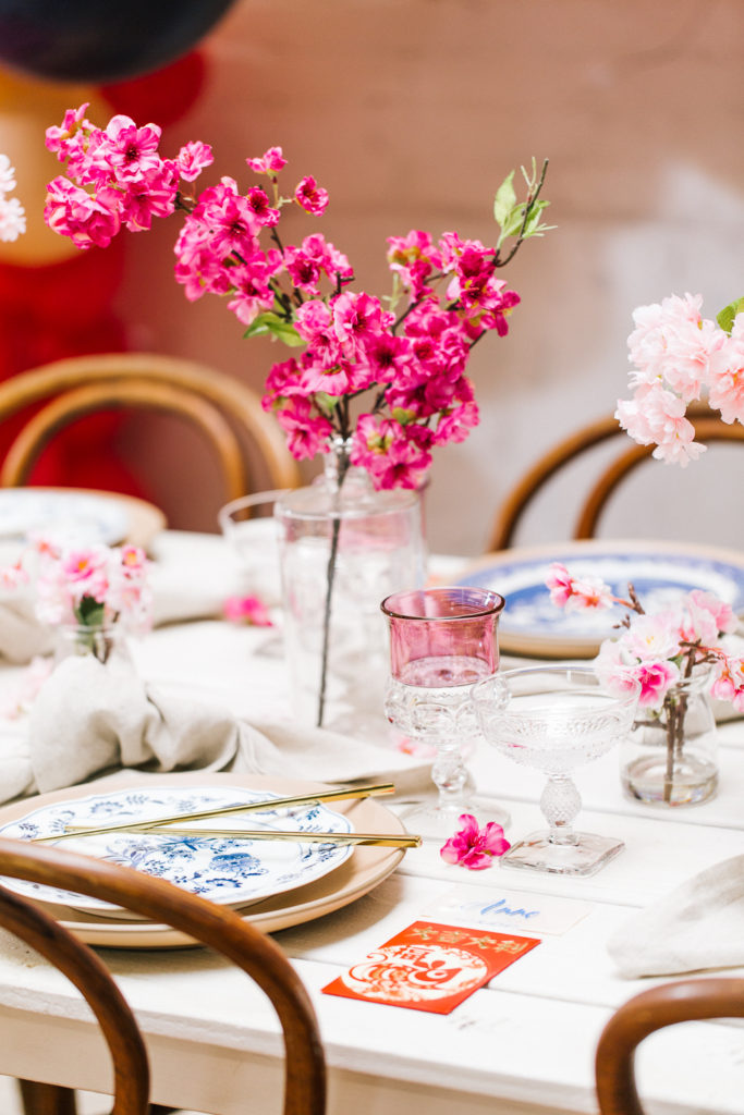 I was pretty set on using cherry blossoms for the florals at this table. Here’s the problem with that… Cherry blossoms are not in season during Lunar New Year. So I reached out to my friends at Afloral, they have the most beautiful silk florals and I was so impressed with how they looked in person. You guys must check them out!!