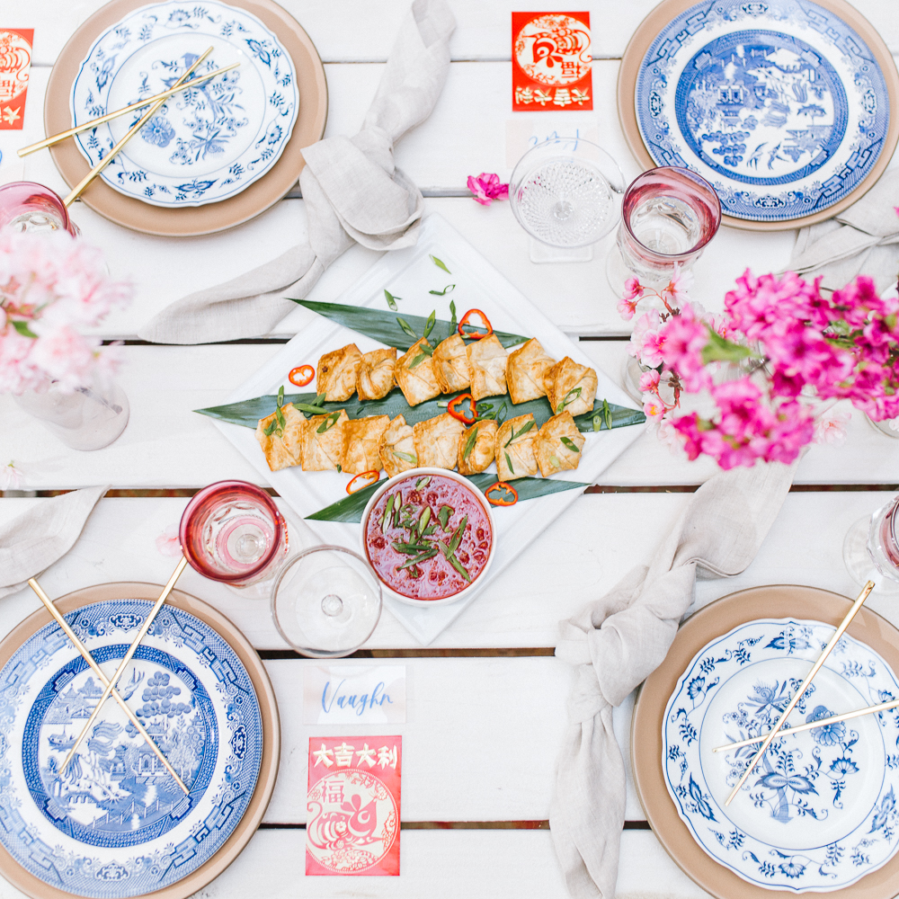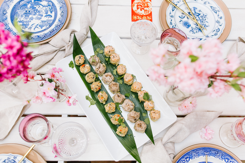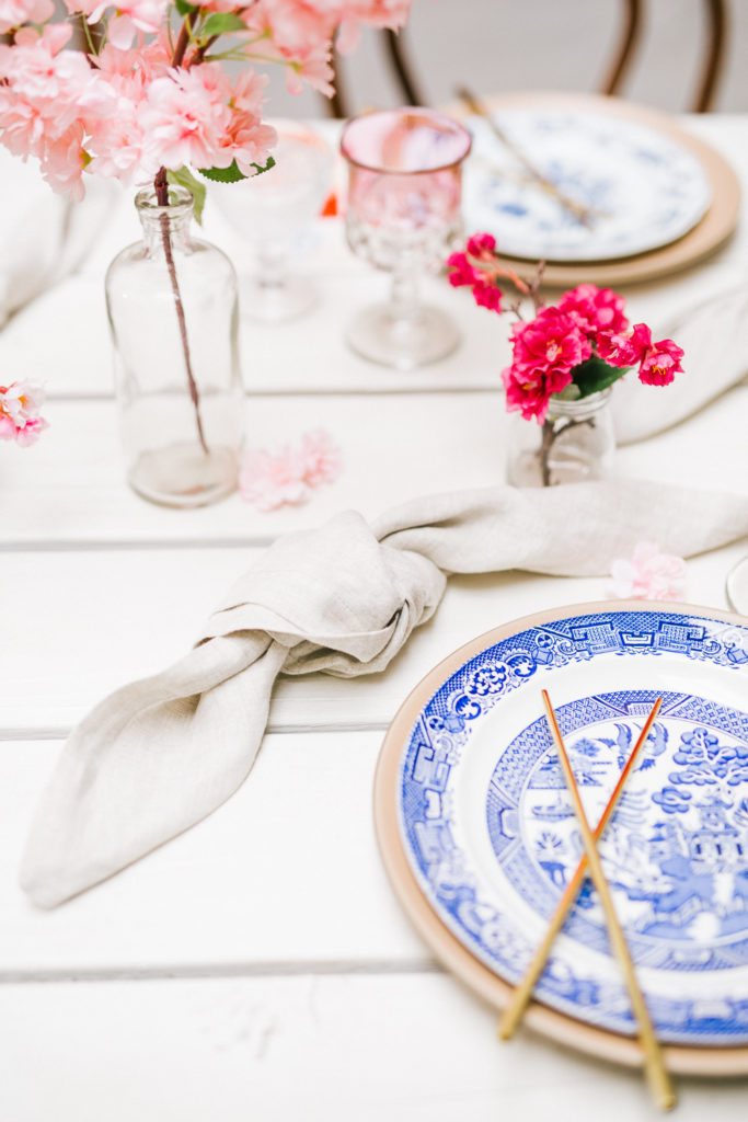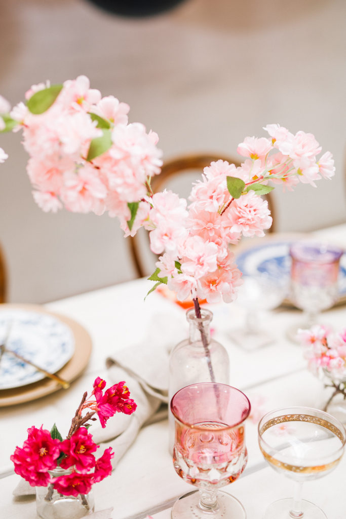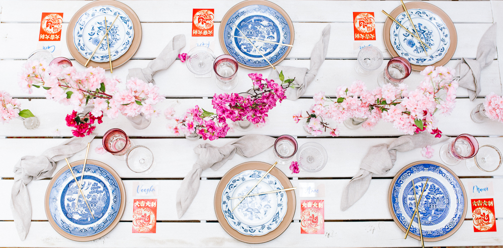 I was pretty set on using cherry blossoms for the florals at this table. Here’s the problem with that… Cherry blossoms are not in season during Lunar New Year. So I reached out to my friends at Afloral, they have the most beautiful silk florals and I was so impressed with how they looked in person. You guys must check them out!!