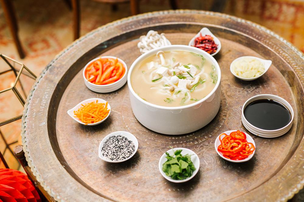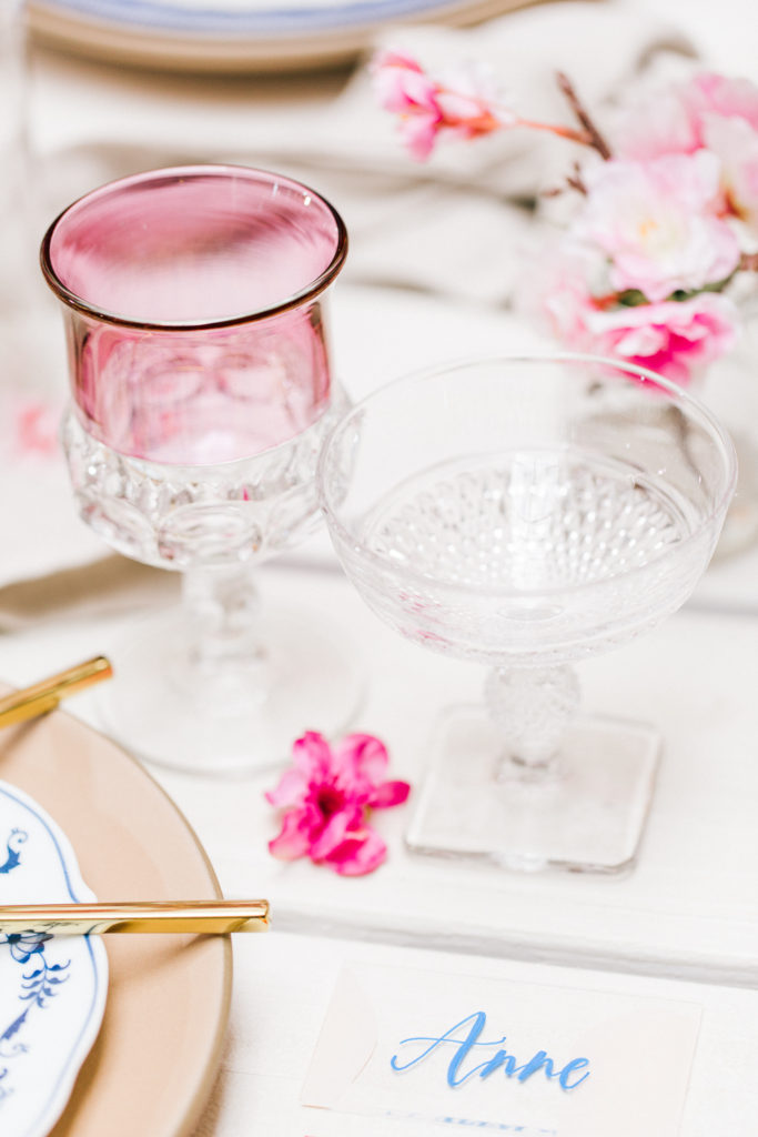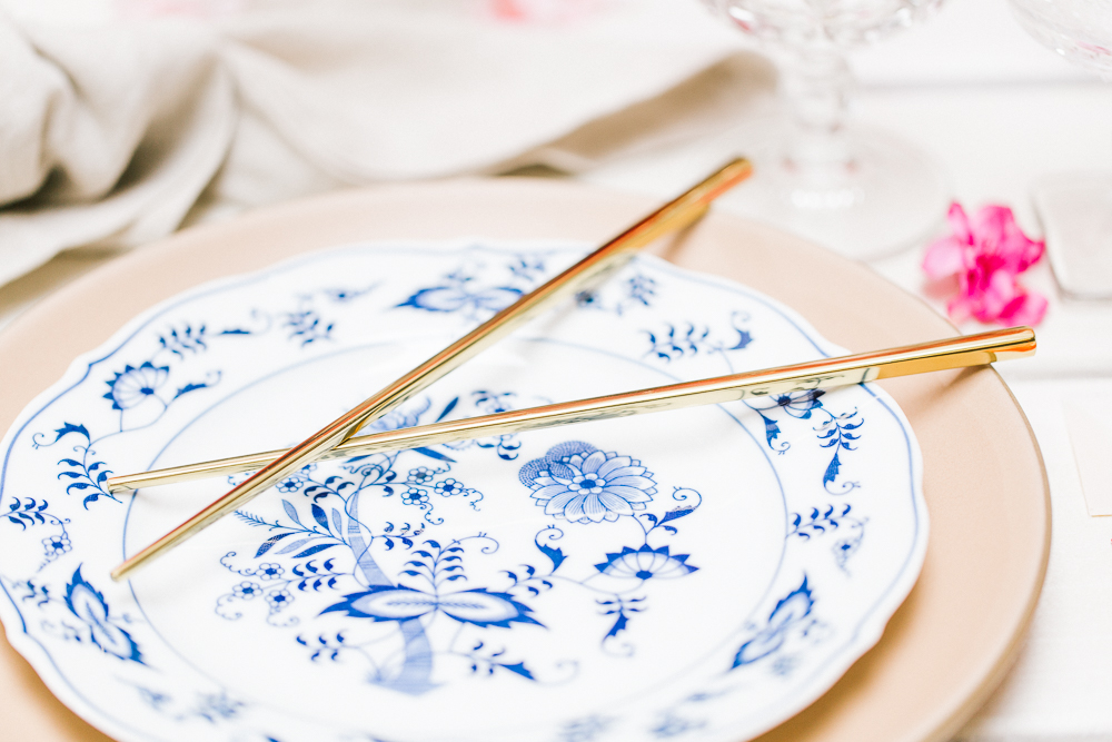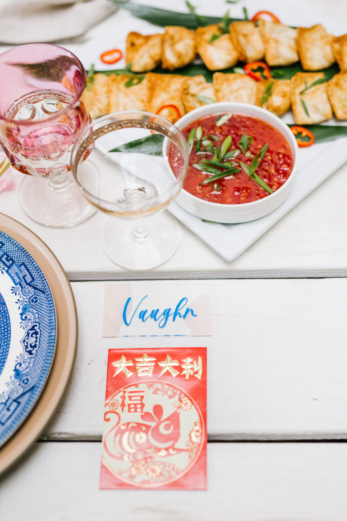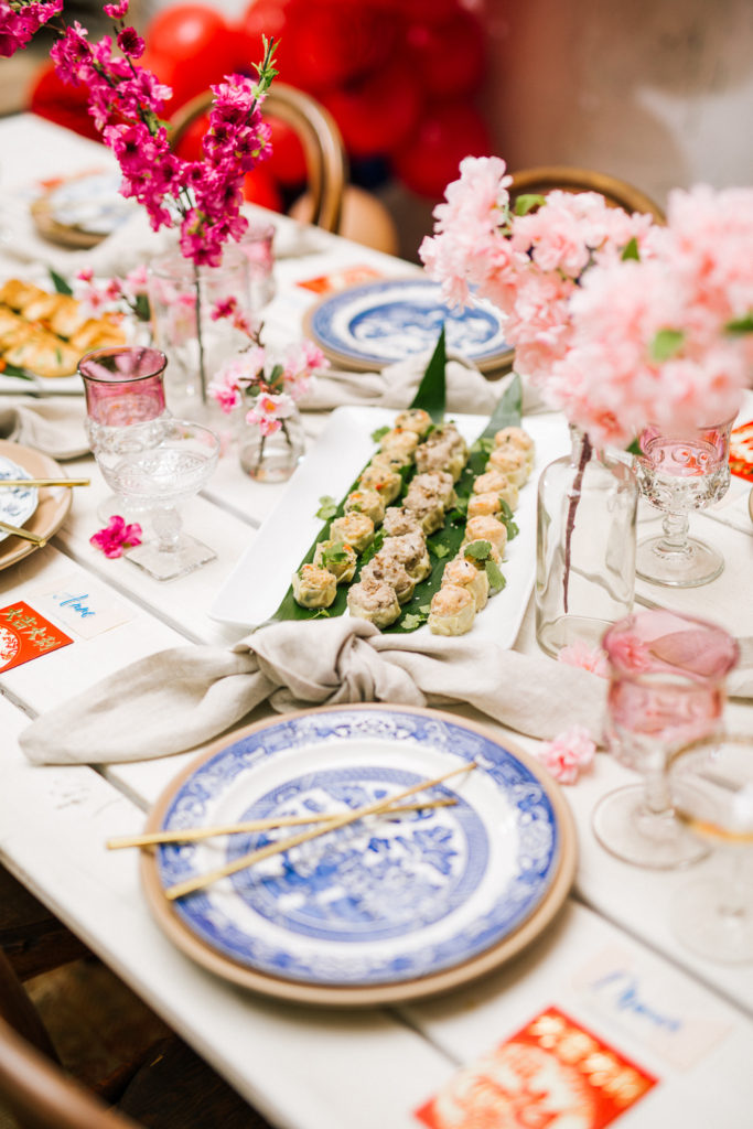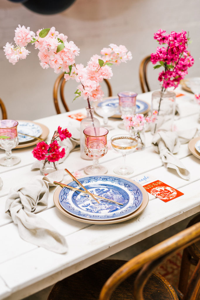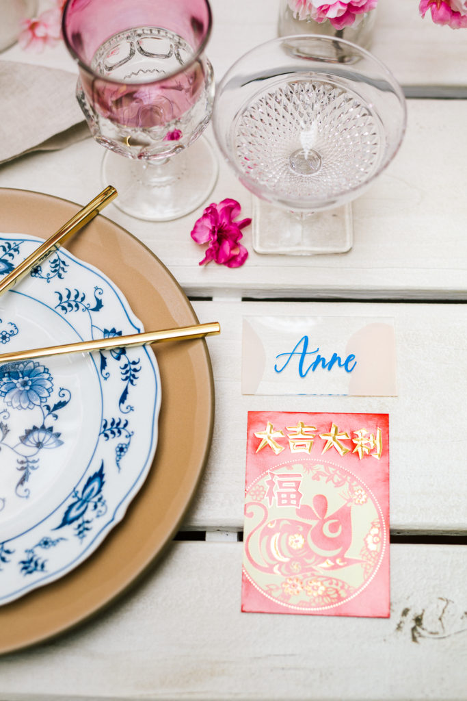 I set this beautiful table from Sweet Salvage Rentals with some really fun tabletop items from Cherished Rentals. The combination of the Heath Ceramic plates with the vintage blue & white china is everything I wanted. There were also lots of pretty details added, like the traditional red envelopes and gold chopsticks.
