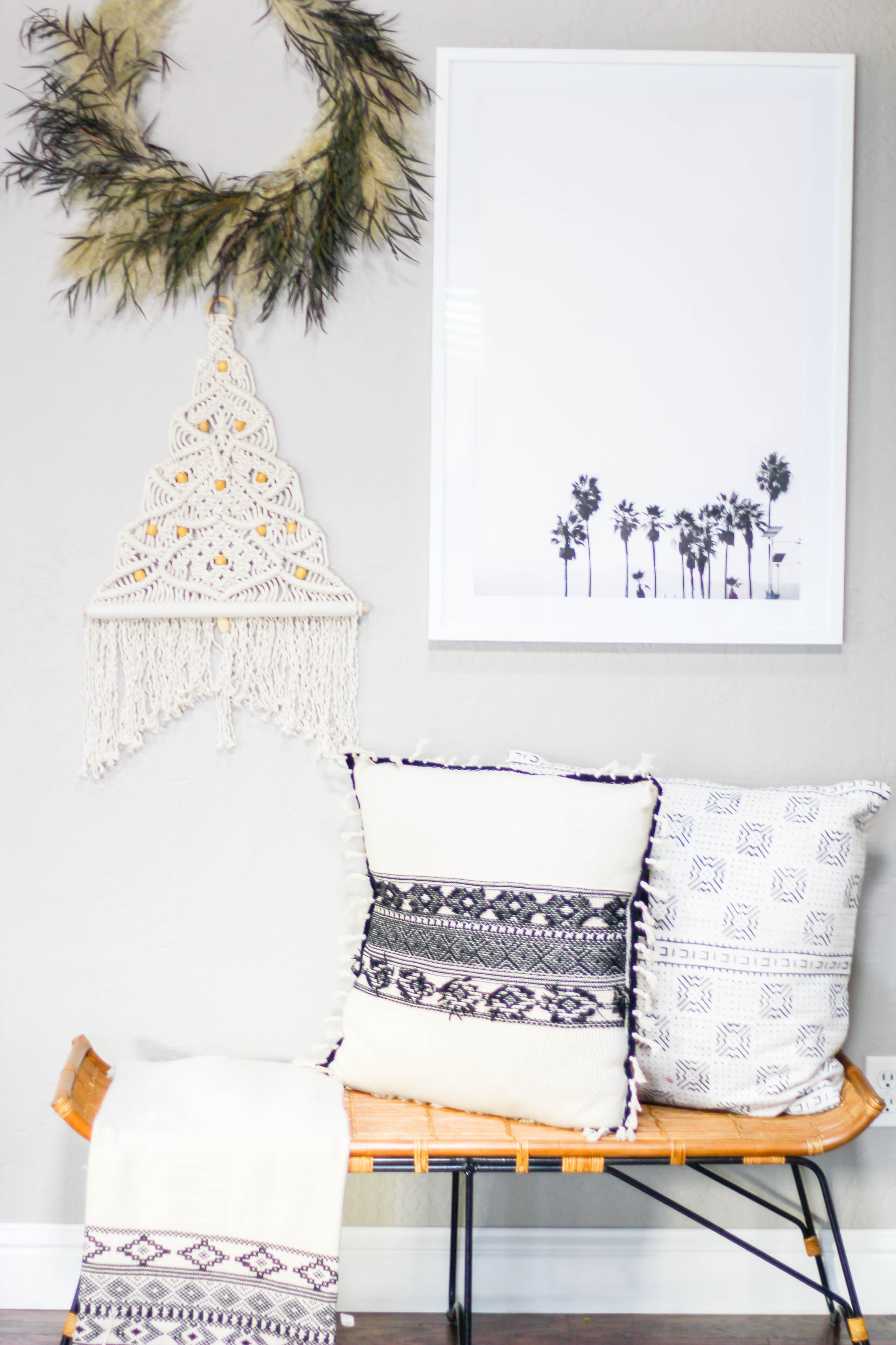 Leah chose to have her macrame tree hang over her fireplace, perfect spot since the fireplace is the ultimate hot spot for Winter! Love the colorful stockings and the print from Land of Nod to accessorize it!