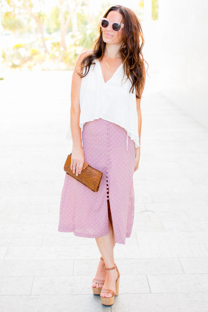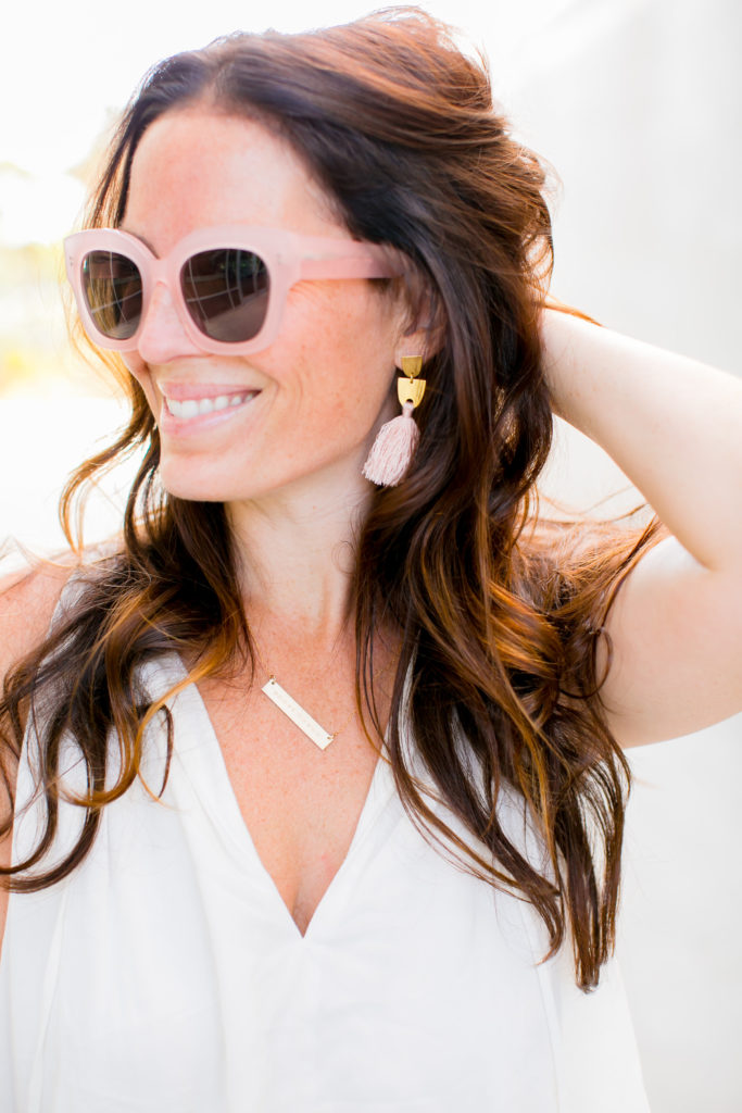 I have been eyeing this Flynn Skye skirt for a while now and had to add it to my wardrobe. It’s perfect for casual daytime or wearing it like this for a date night. I paired it with my new favorite Stillwater top (similar here), Wyeth’s new Leona sunnies in Rose Quartz and the cutest Madewell fringe earrings.