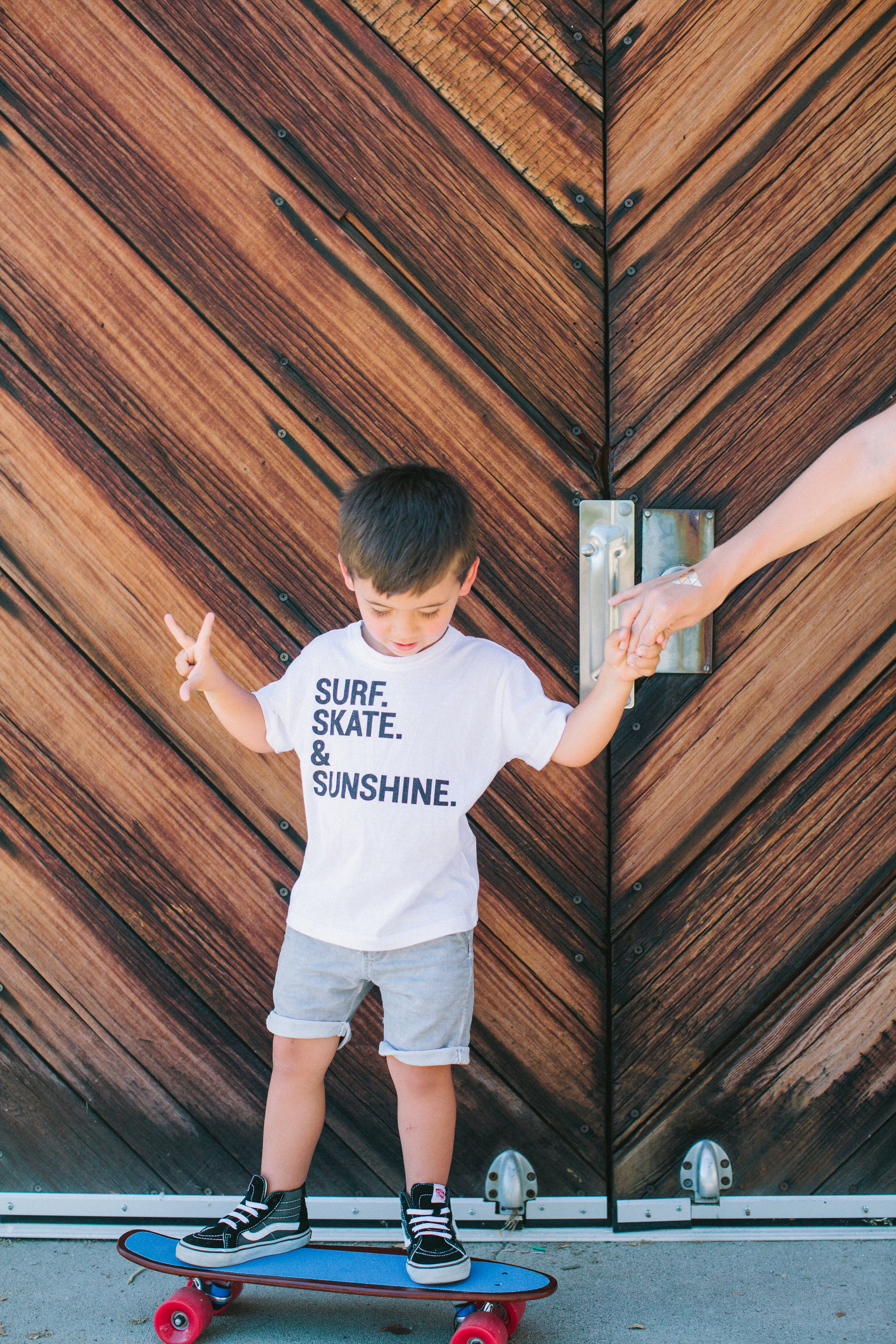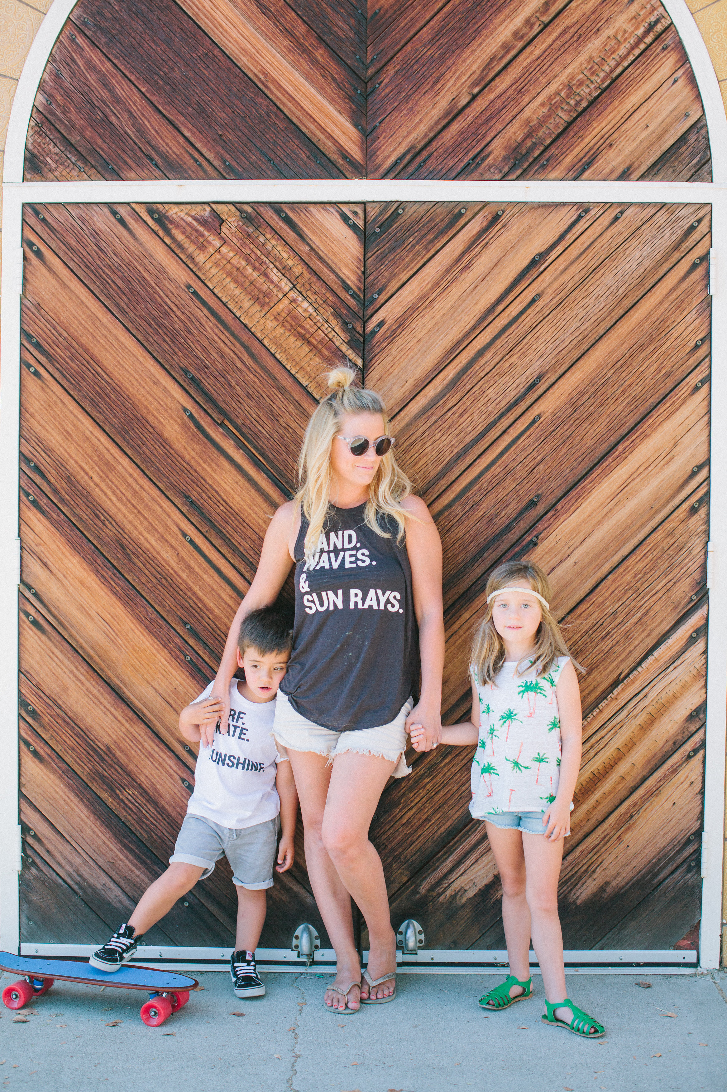 This summer we have been traveling a lot along the coast and living like gypsies. Our favorite place and most visited are the Santa Cruz beaches. We can be there for hours and hours, especially Jett. We are soaking up all the beach sun we can until school starts, and we did just that with our sunny summer beach inspired shirts. I’m sporting the Sand Waves. Sun Rays tee which is sadly out of stock. Dylan is giving us the sunny Cali palm tree landscape with her Palm Tree Breeze Tee.  Jett is sporting what he lives off of, Surf, Skate, & Sunshine tee. (expect when your not allowed in the ocean because of sharks, boo!) … and yes we wear helmets :)