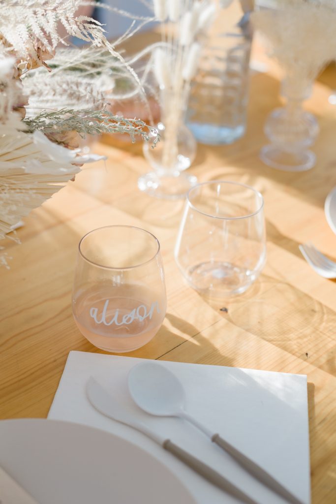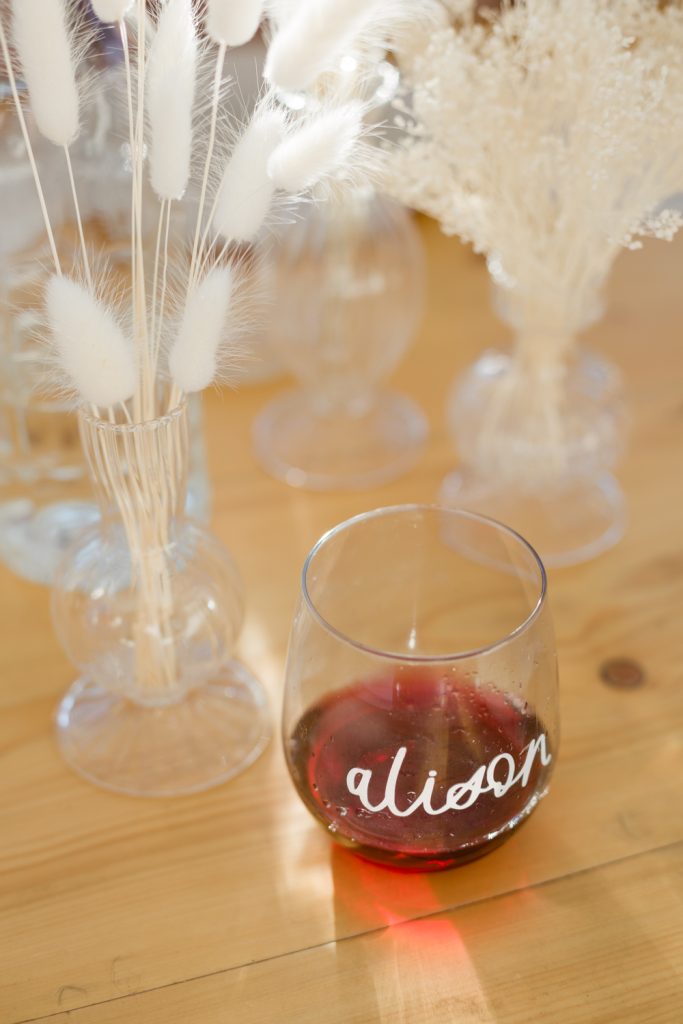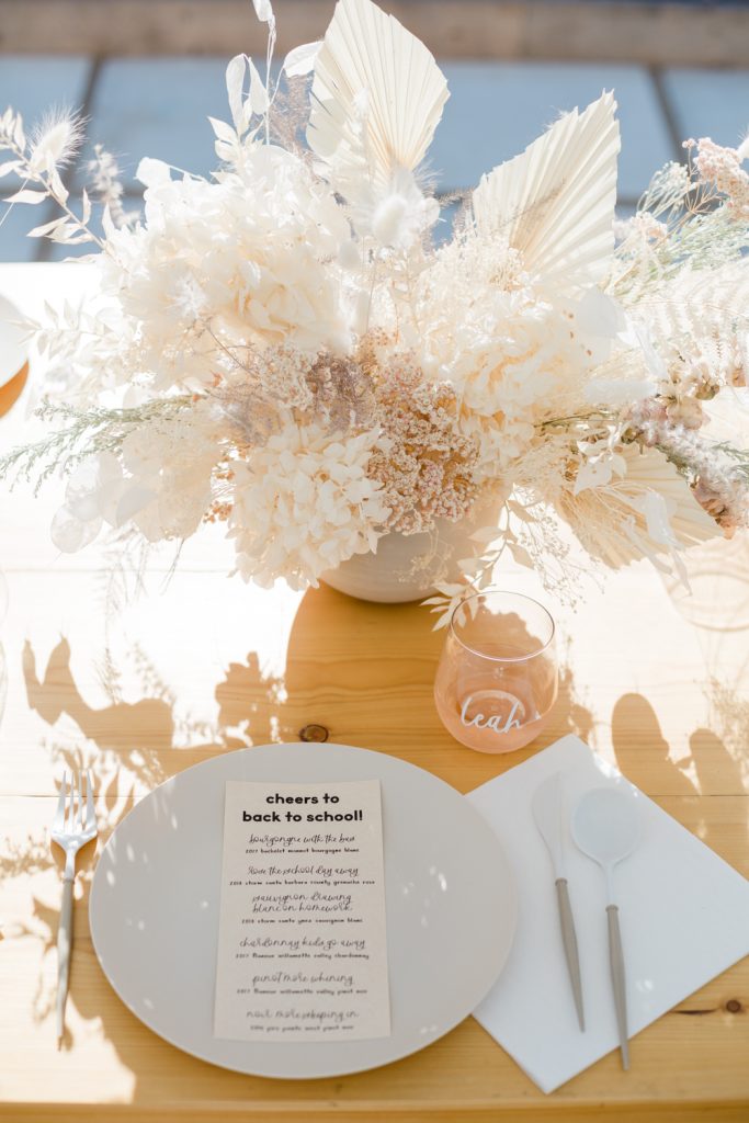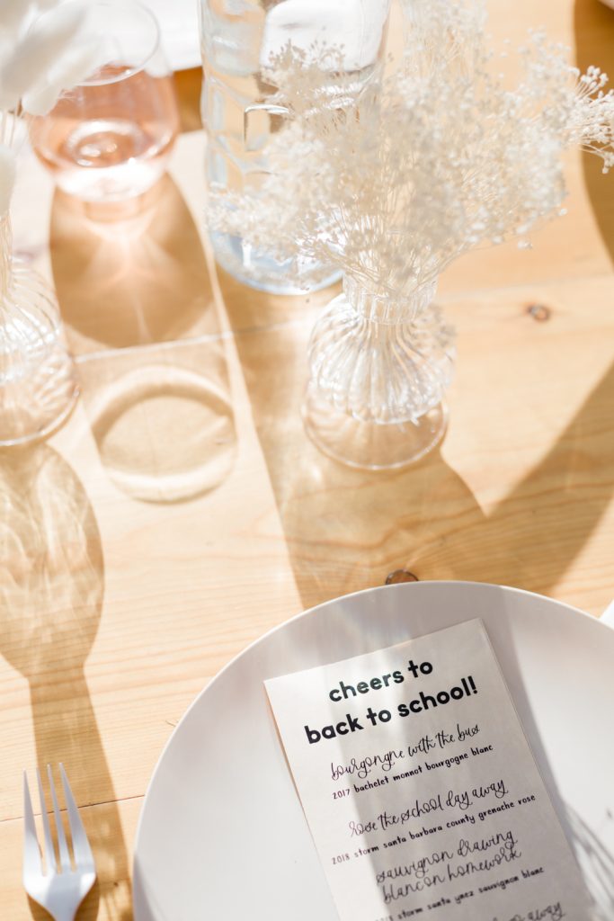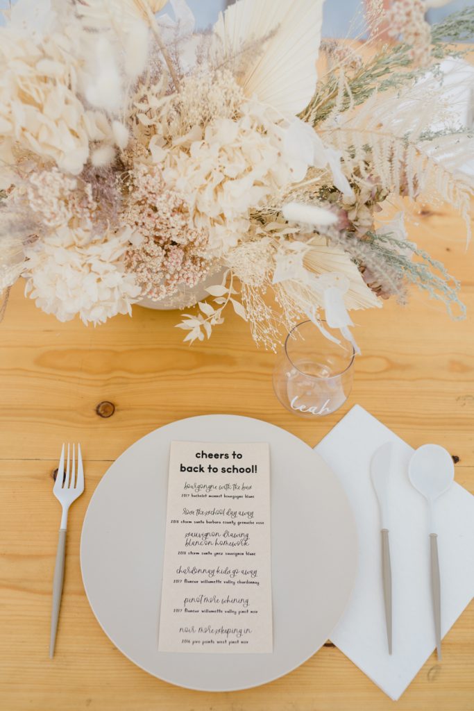 Onto the amazing details from Poppy Jack Shop! She created these cute menus highlighting all the wines from Argaux we would be tasting… And let’s just say we had a little fun with it and added lots of puns! Look closely and you’ll see we tasted a “Sauvignon Drawing Blanc on Homework”, “Pinot More Whining”, and “Chardonnay Kids Go Away” to name a few…