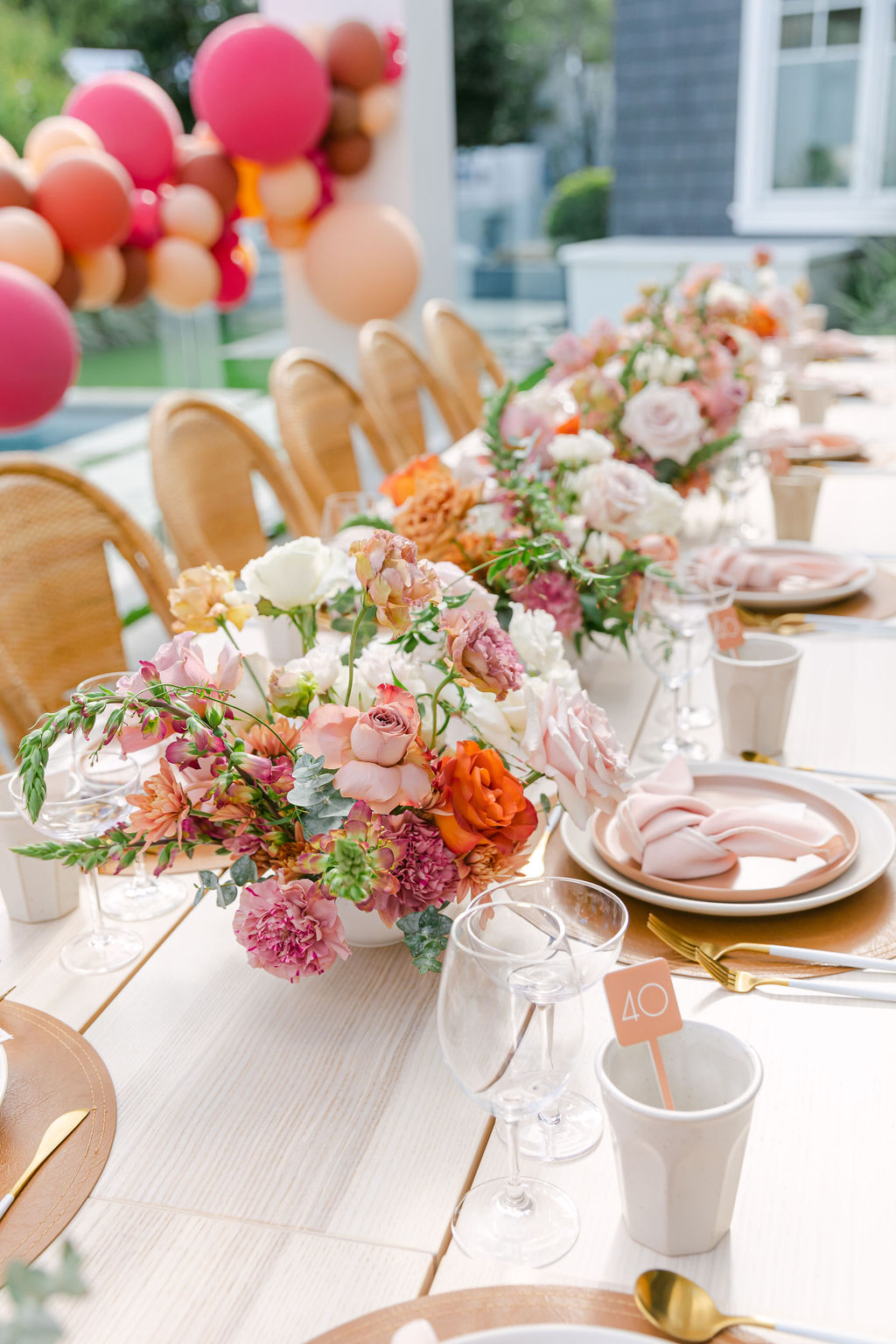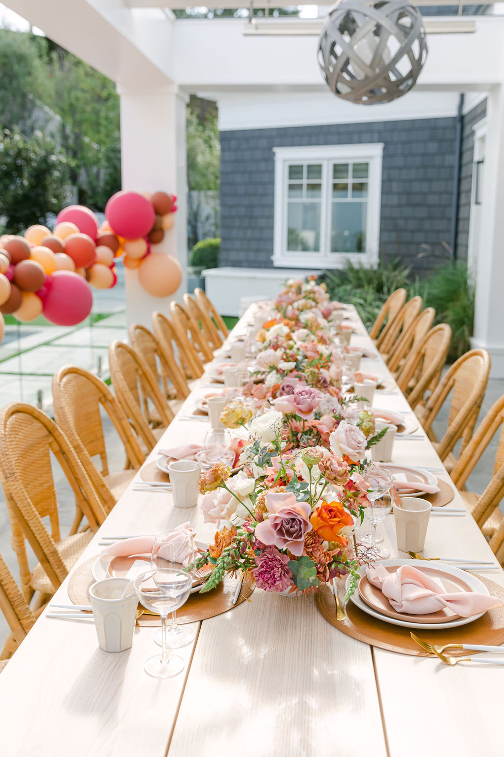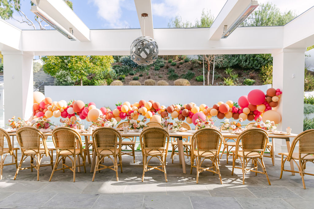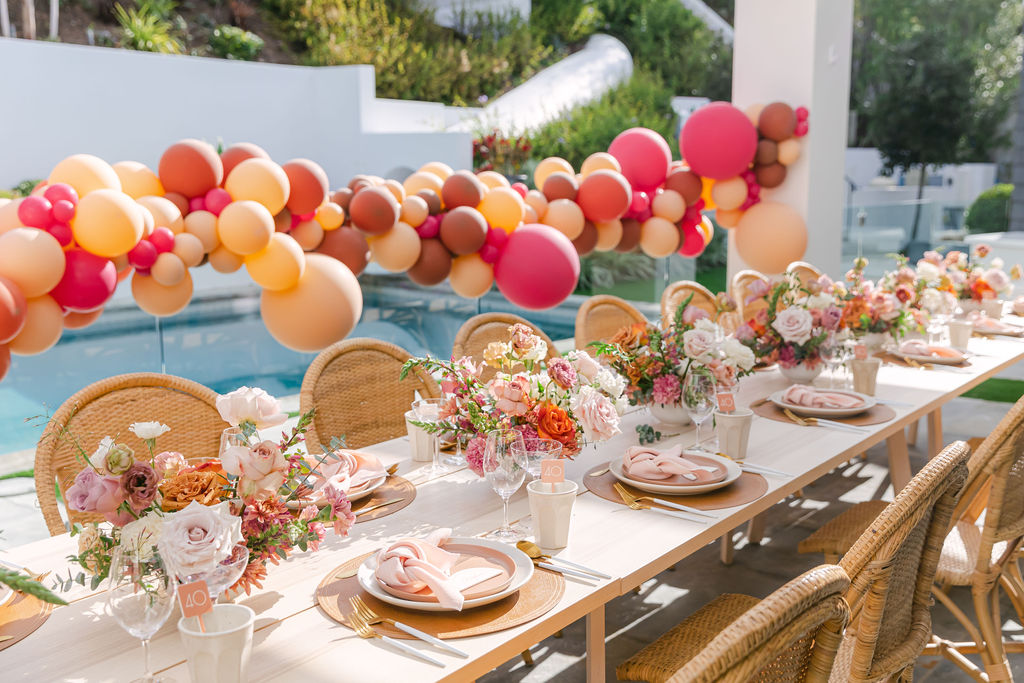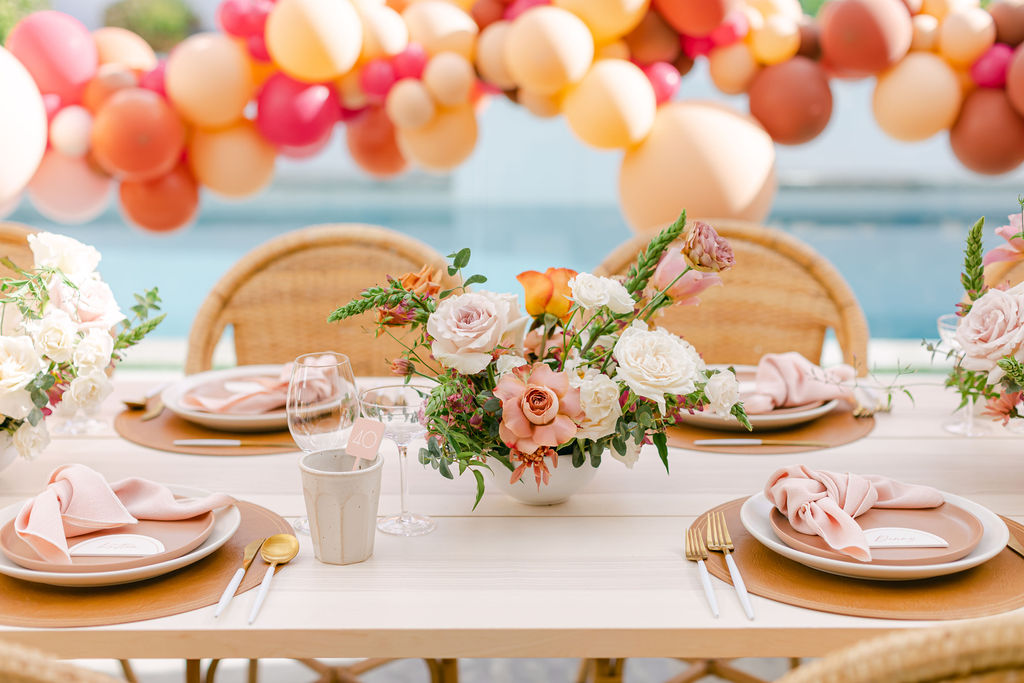 Of course we brought our a few of our favorites along to make this magic happen! We already mentioned our talented friend Ellen who did those incredible balloons, but we also had Sweet Salvage Rentals who brought the amazing table and chairs, Hostess Haven supplied the beautiful tabletop items, and Not Just in Novels created the insanely pretty floral arrangements that I can’t get enough of!!