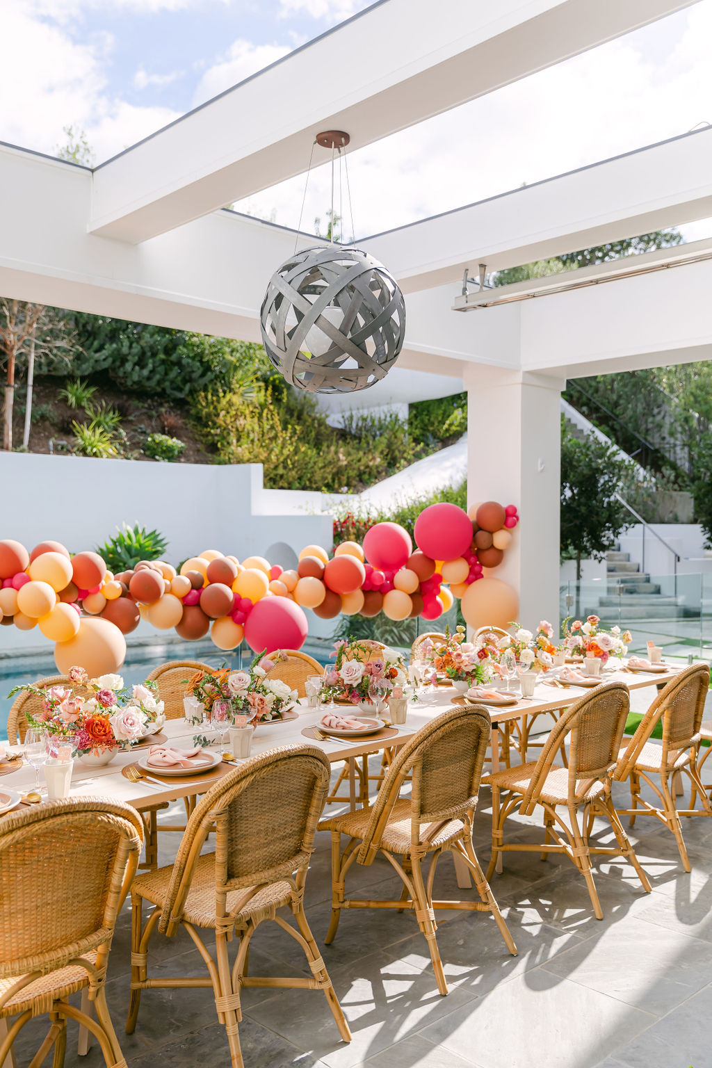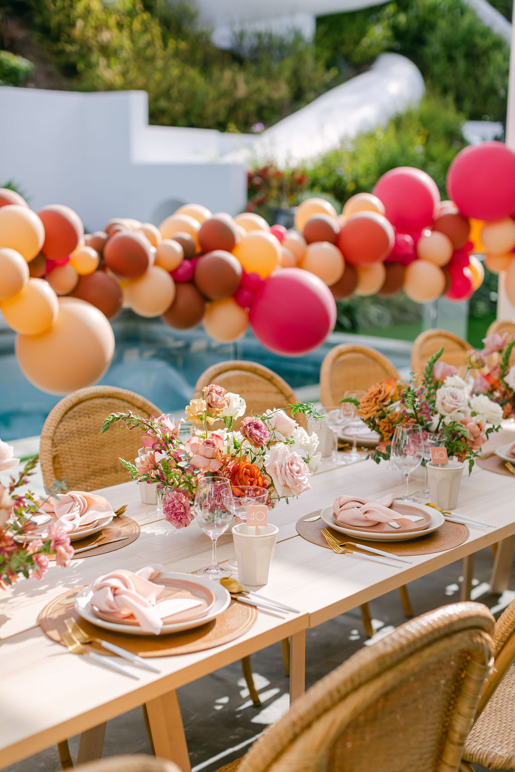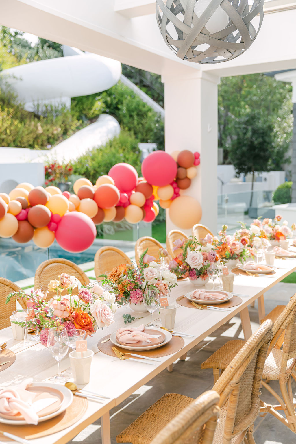 Of course we brought our a few of our favorites along to make this magic happen! We already mentioned our talented friend Ellen who did those incredible balloons, but we also had Sweet Salvage Rentals who brought the amazing table and chairs, Hostess Haven supplied the beautiful tabletop items, and Not Just in Novels created the insanely pretty floral arrangements that I can’t get enough of!!