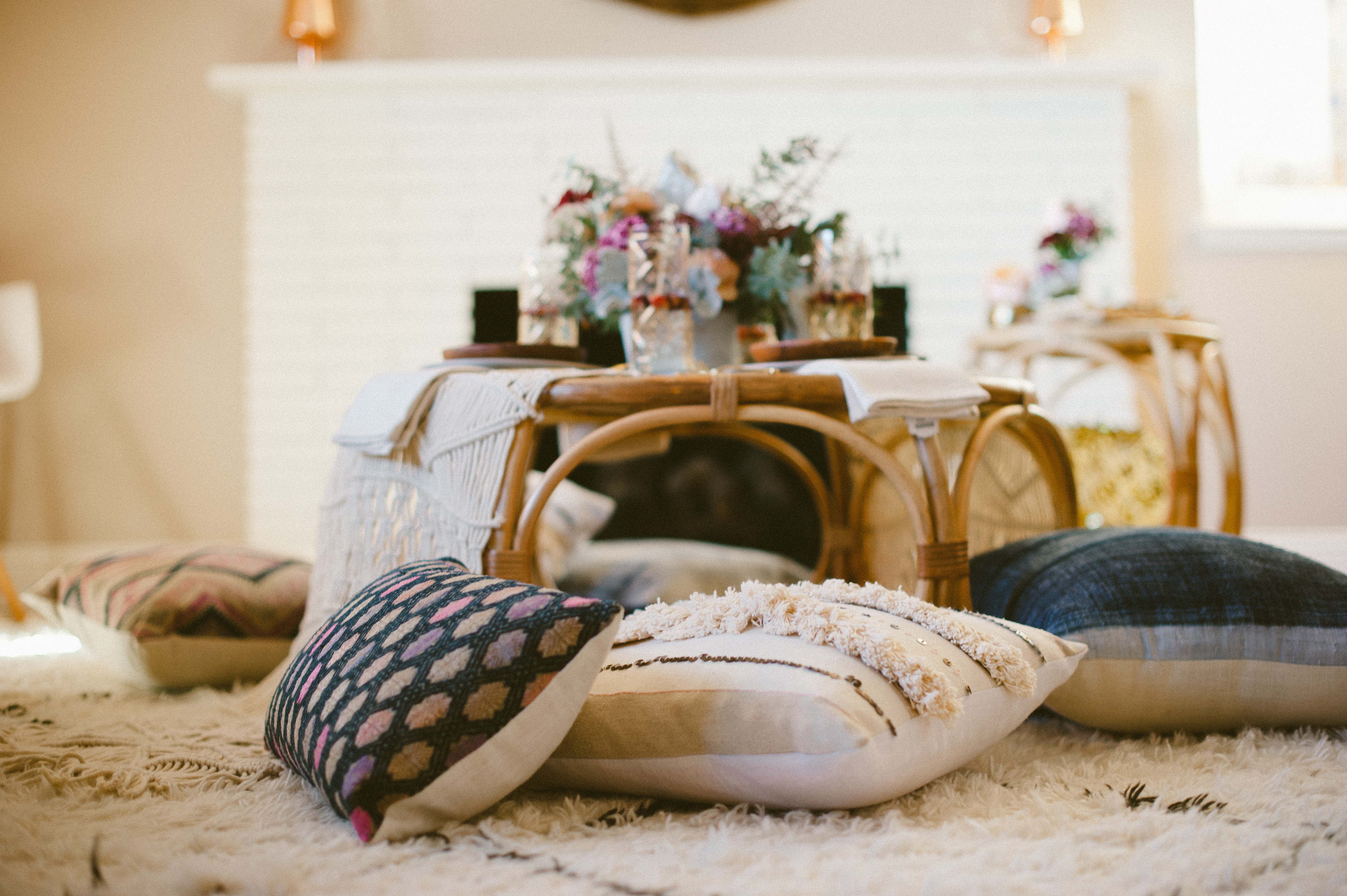 Throw your pillows from the couch next to your table to add color, texture, and some cushion for your guests to lounge with.