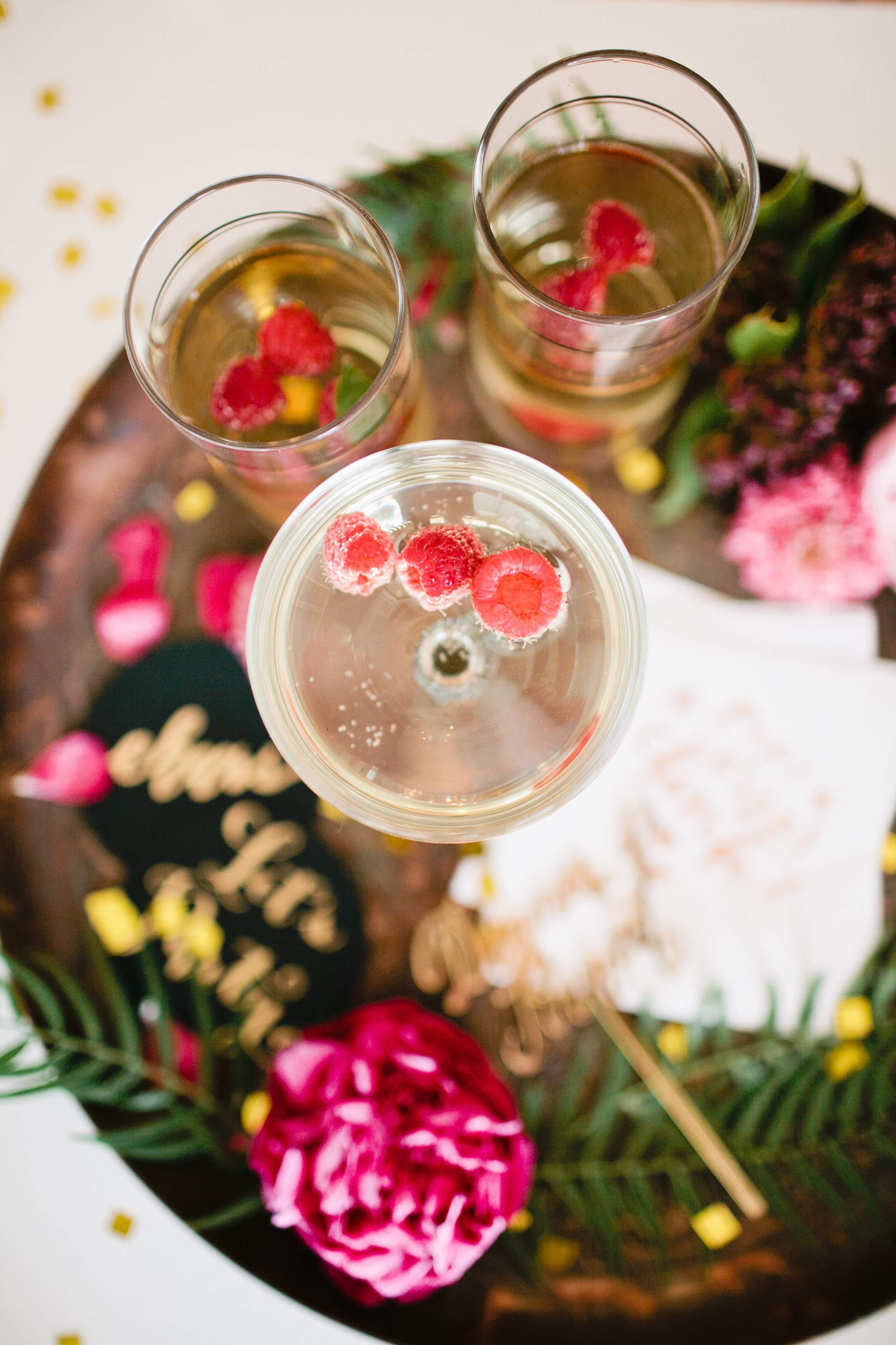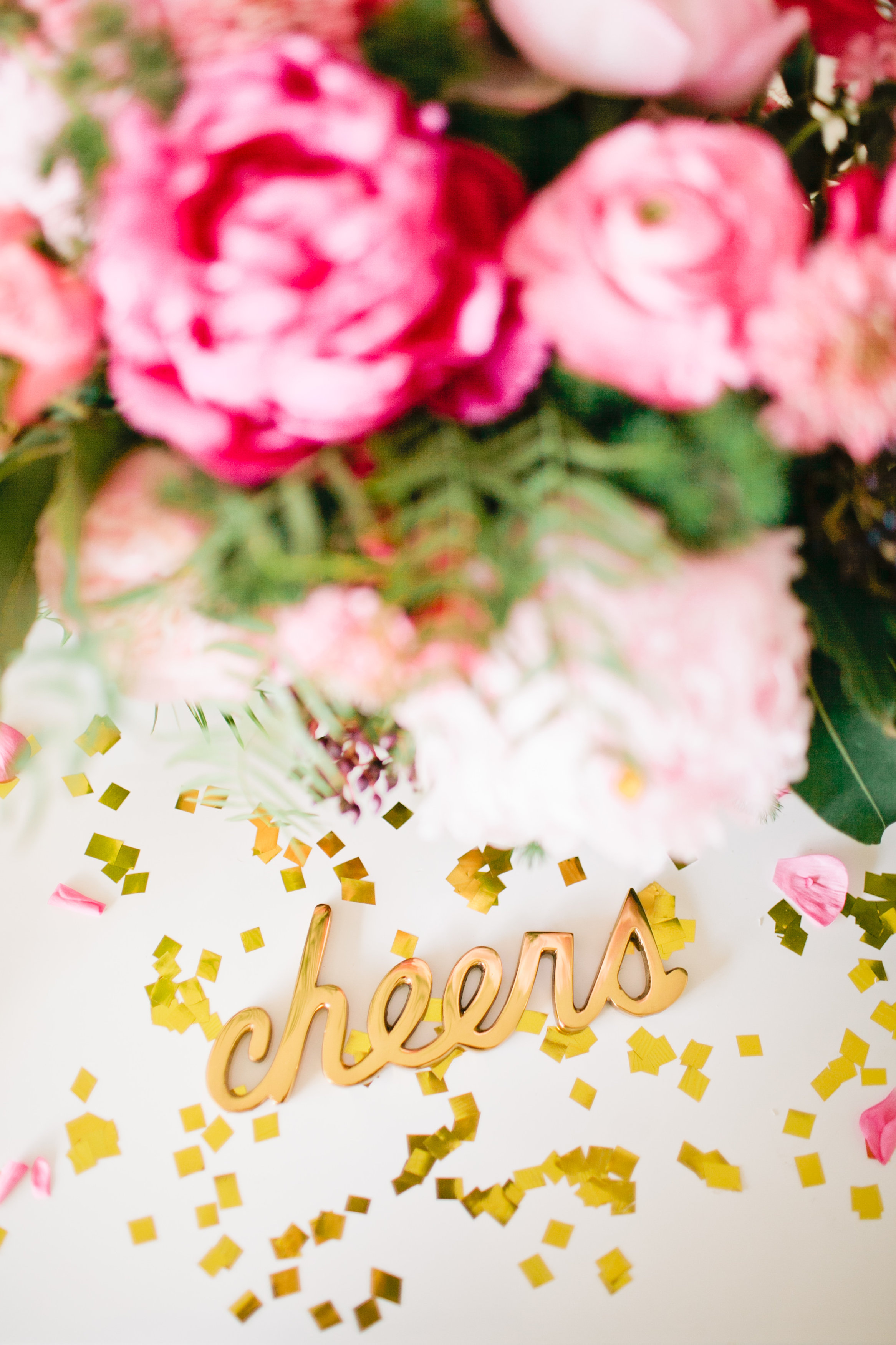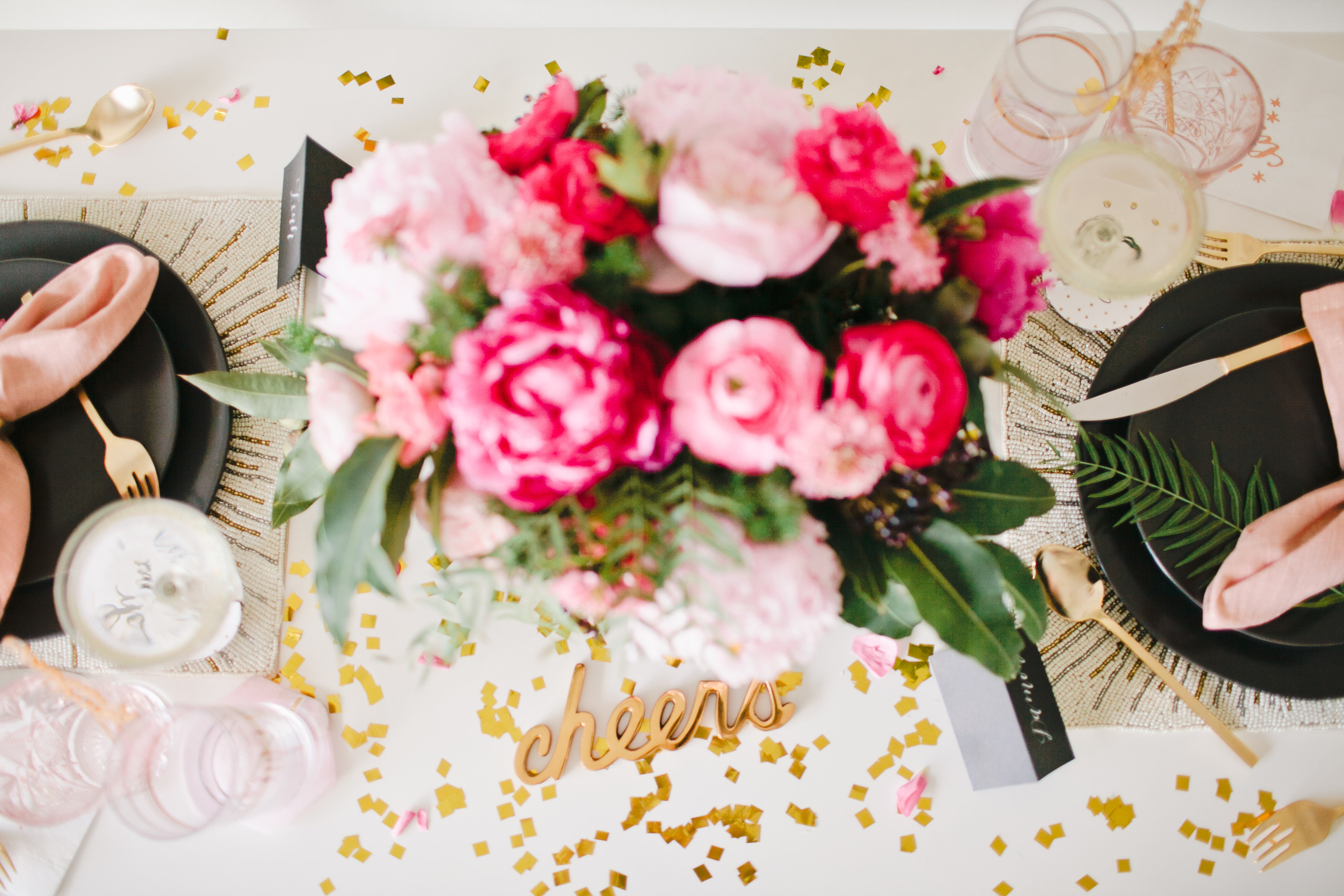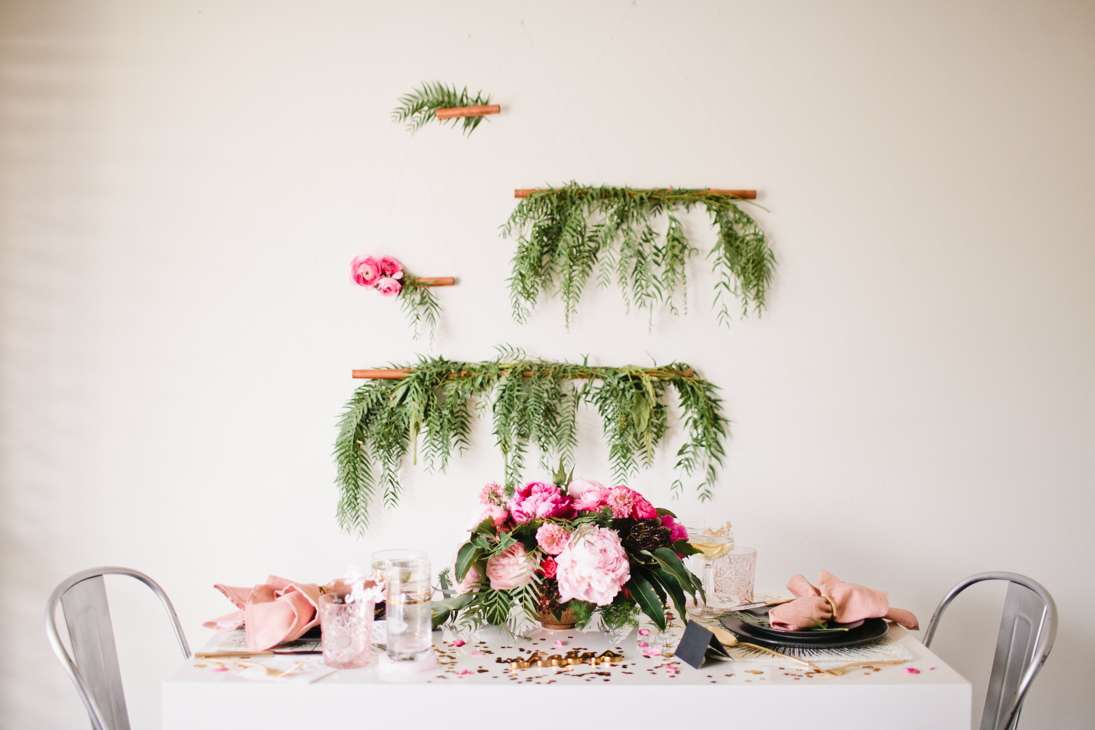 The backdrop was pretty easy to create with the help of our gal Meagan from MV Florals! We had some copper piping lying around that she attached some greenery to, then we hung it to our wall with fishing wire and added a few blooms! Voila! Super easy and makes a gorgeous statement. Meagan didn’t stop there, she created the most beautiful pink center piece for our table, we couldn’t stop saying how stunning it was! We love using metallics like gold and copper mixed with black and white for New Years, but to brighten this one up and make it a little different we decided to mix in some pretty pinks and greenery… MV Florals really did an amazing job with these gorgeous blooms!!