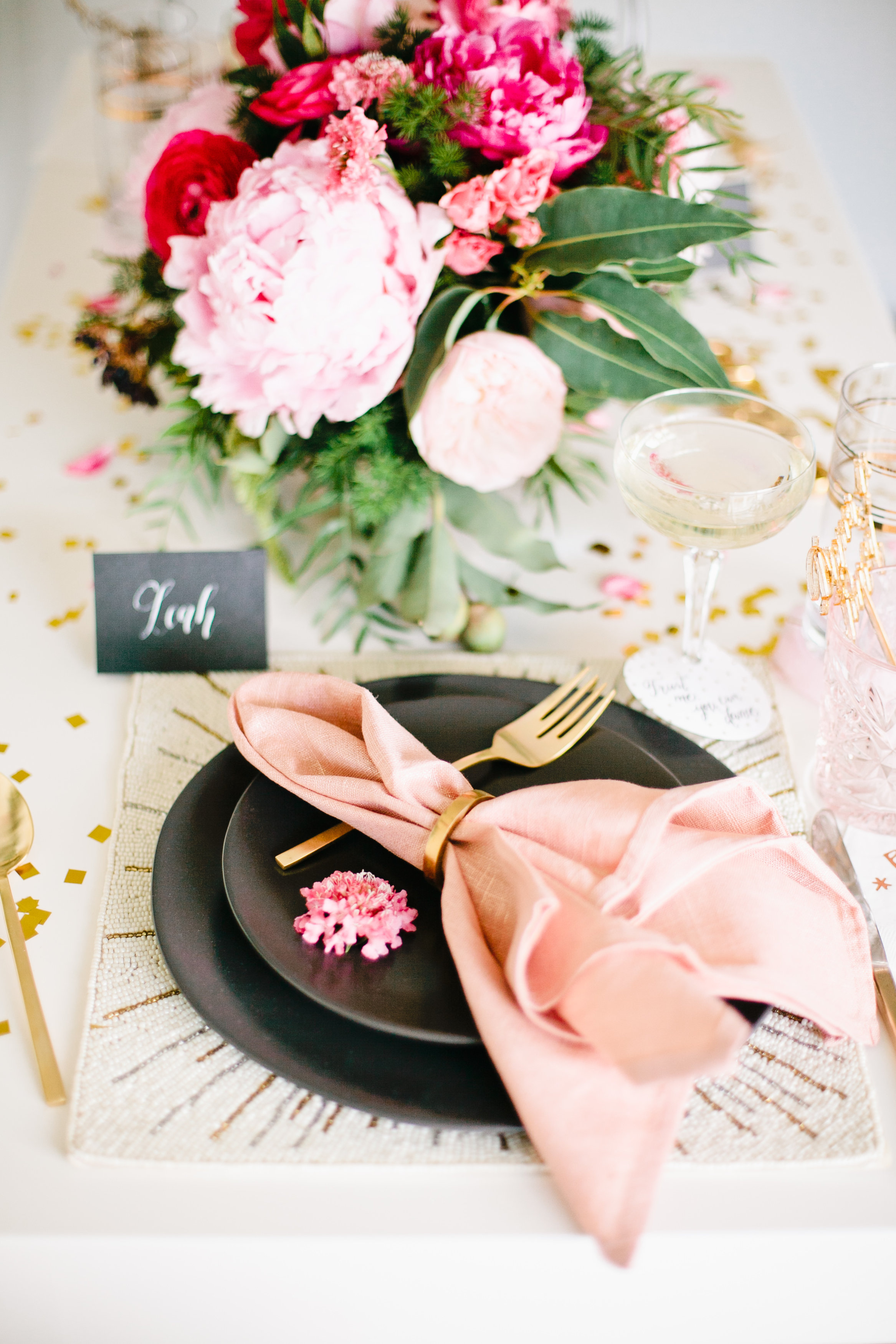 For all of the tabletop we used one of our favorite go to stores, West Elm! We can never leave that store empty handed and found such amazing items to create this perfect NYE styled look! We loved the mixture of the black plates with the pinks and golds of the napkins, glassware and flatware. They also had the most amazing starburst placemats and gold napkin rings that would jazz up any table!! Really, every detail was taken care of with their awesome inventory.