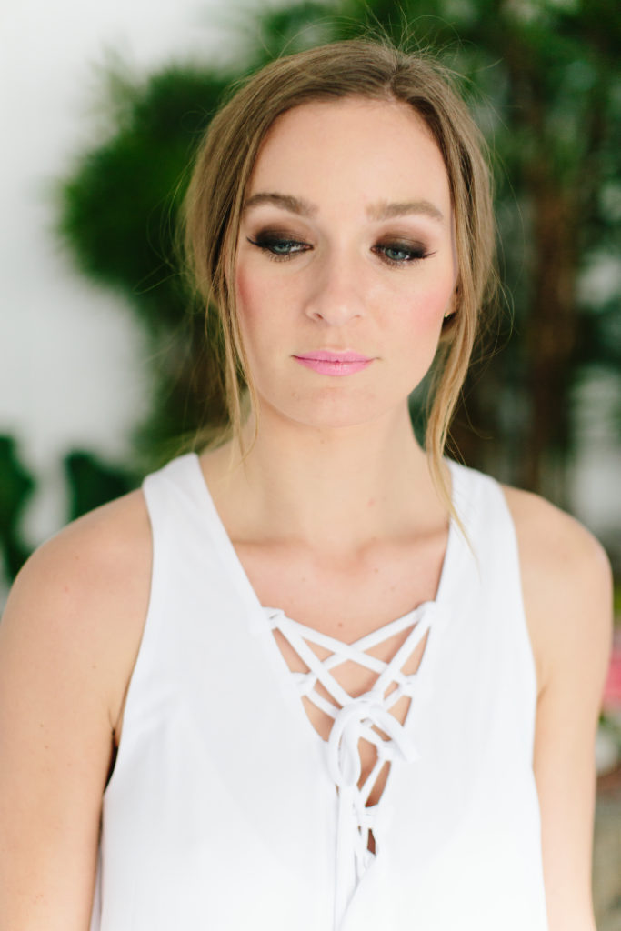 Janel has almond shaped eyes so we did a smokey eye that was darker on the outside corners and more golden on the inside lids to really brighten and accent the eyes. A peachy nude lip brought everything together to keep it looking fresh.