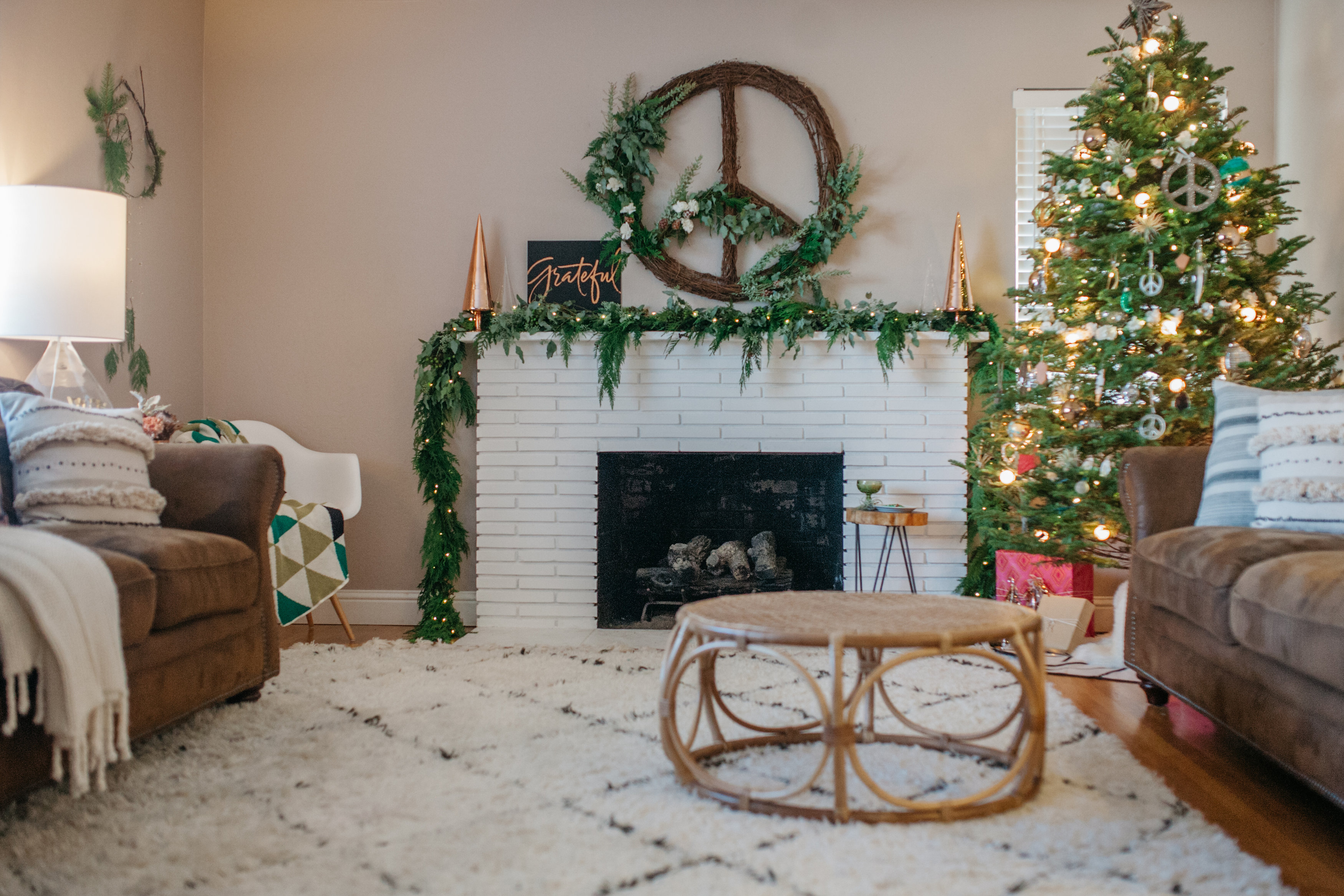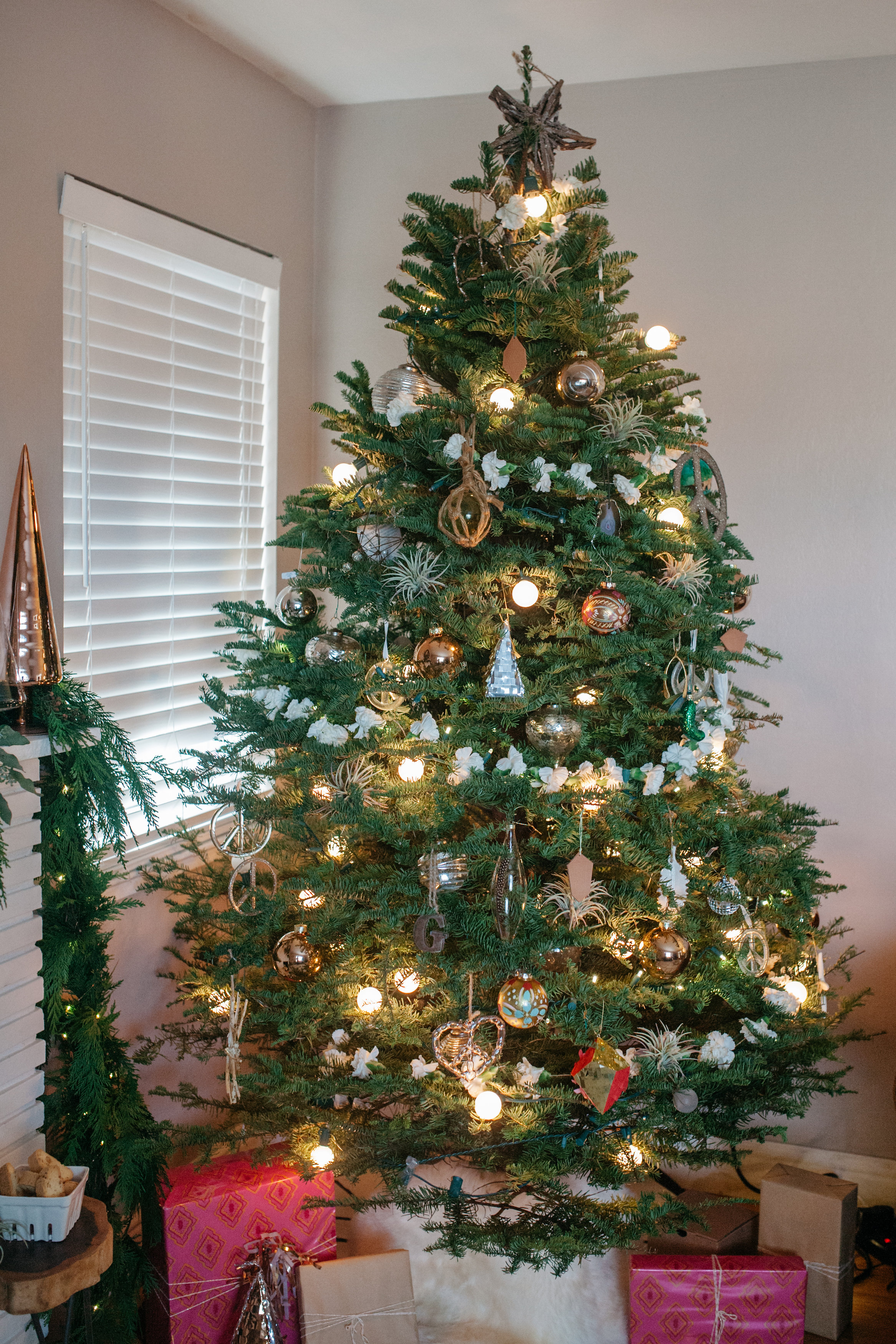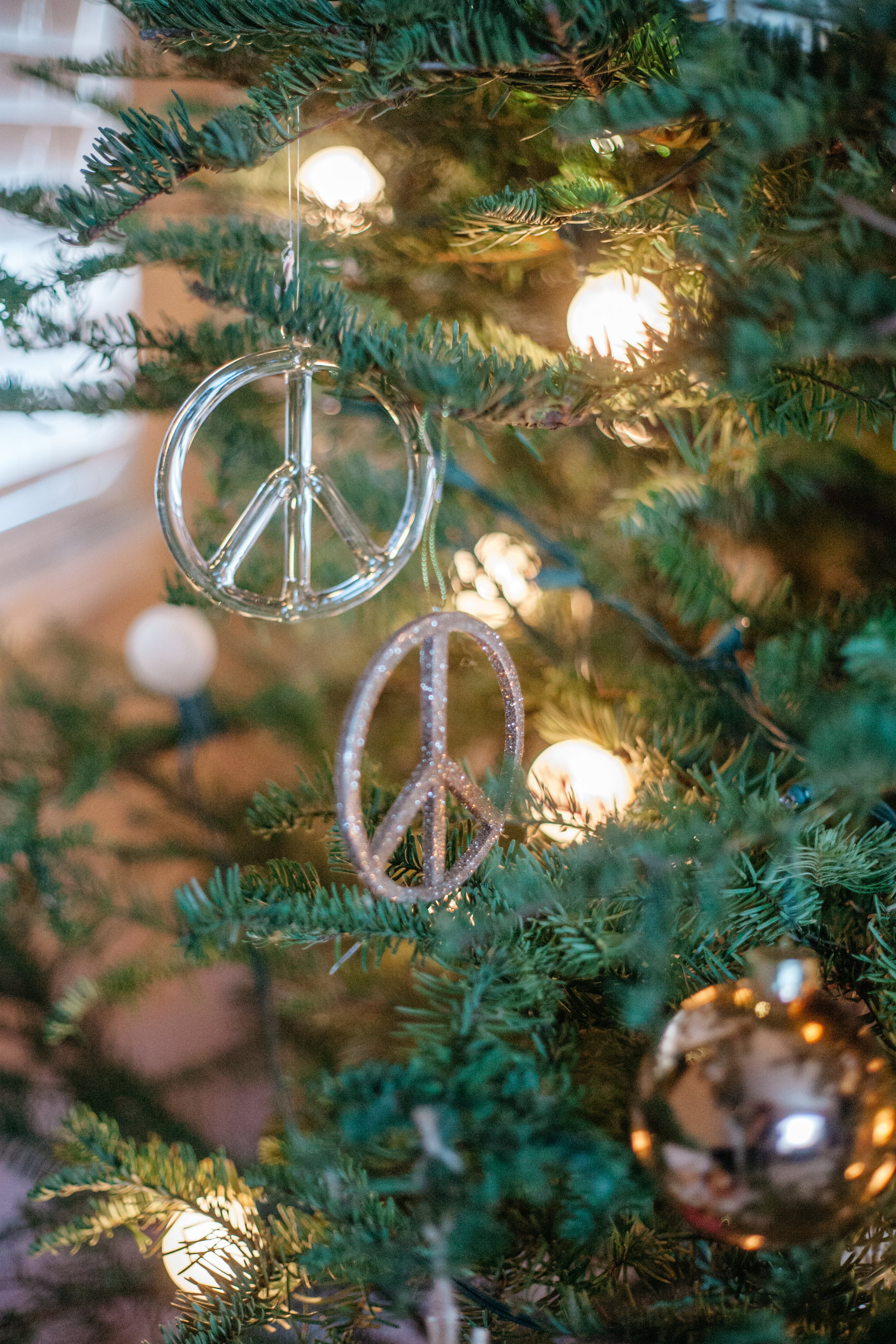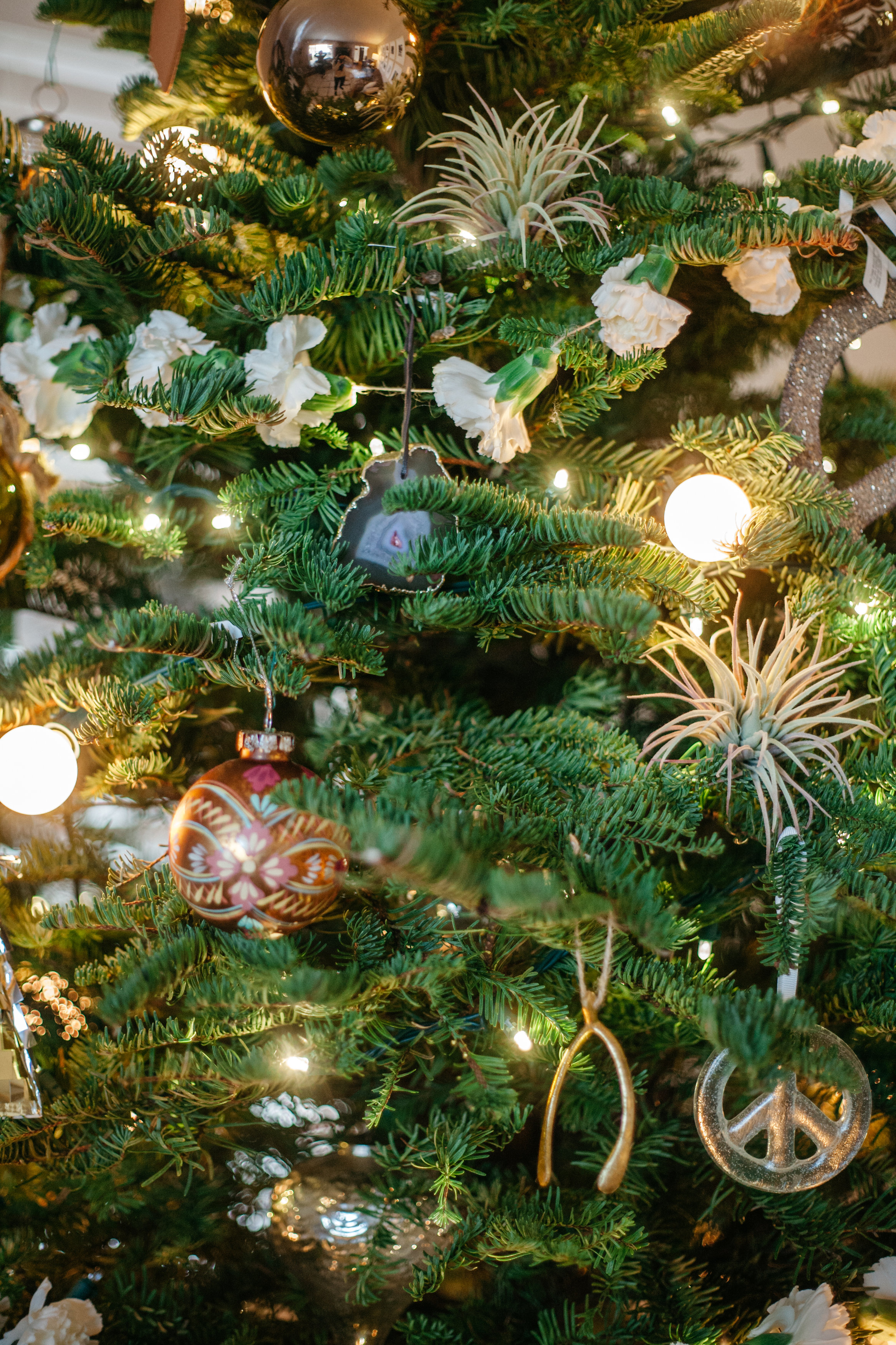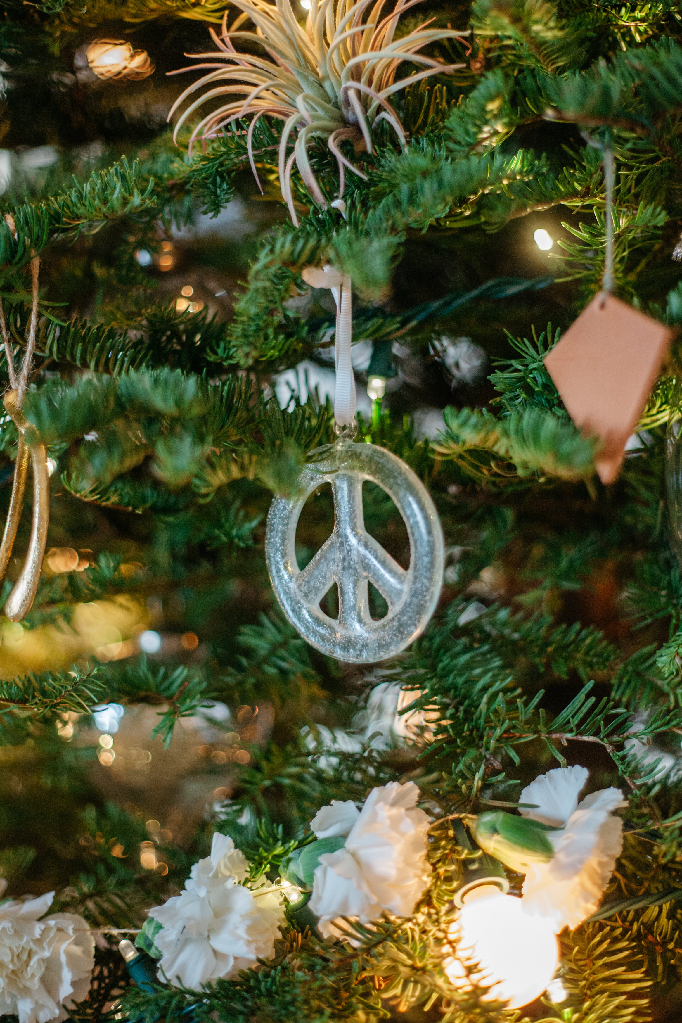 I love to incorporate different elements in the tree like leather, feather, metals, clear and colored glass, and fresh flowers, but still keeping within a natural looking theme. I have been collecting peace sign ornaments for a couple years now, so our tree naturally grew into the peace and love tree.