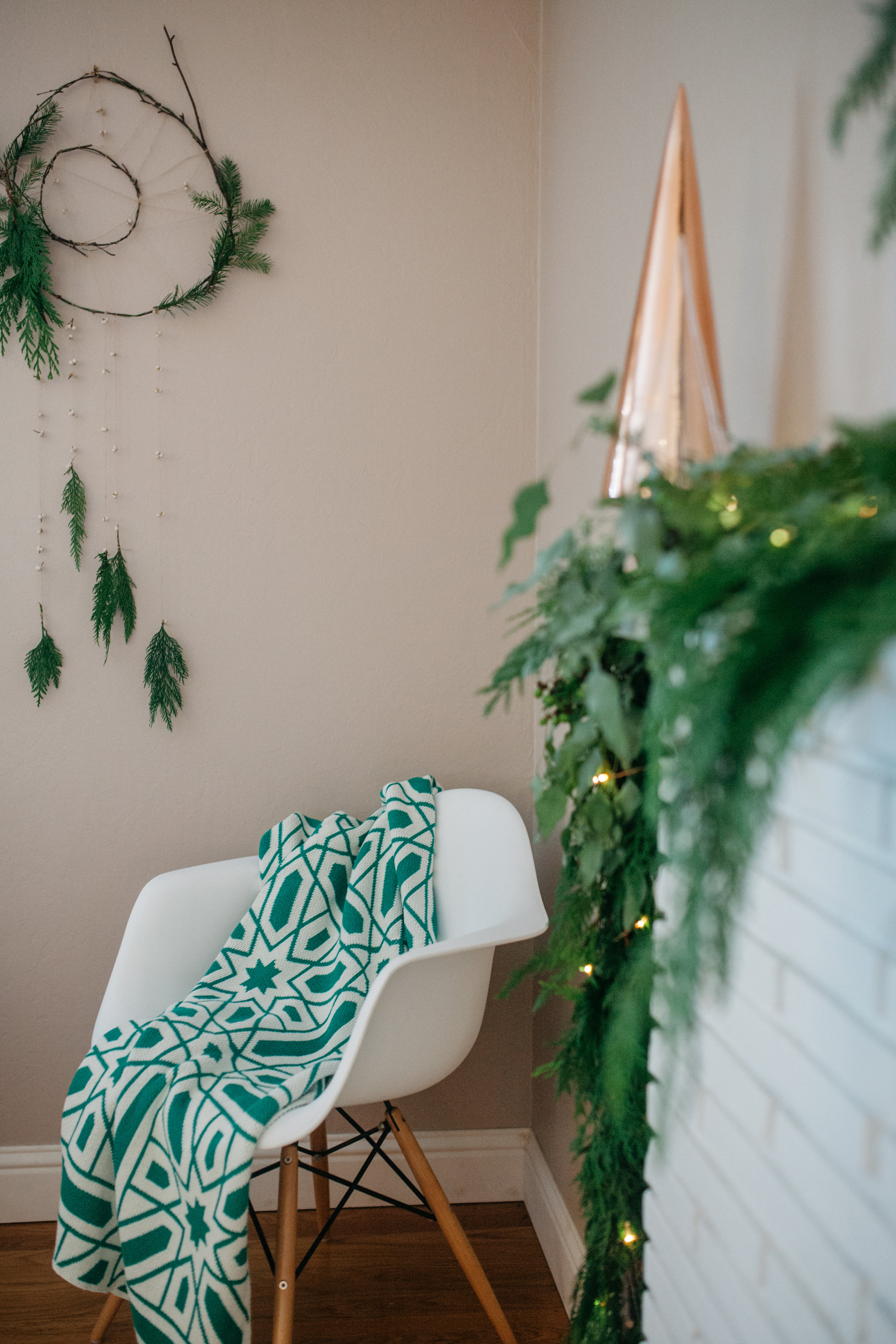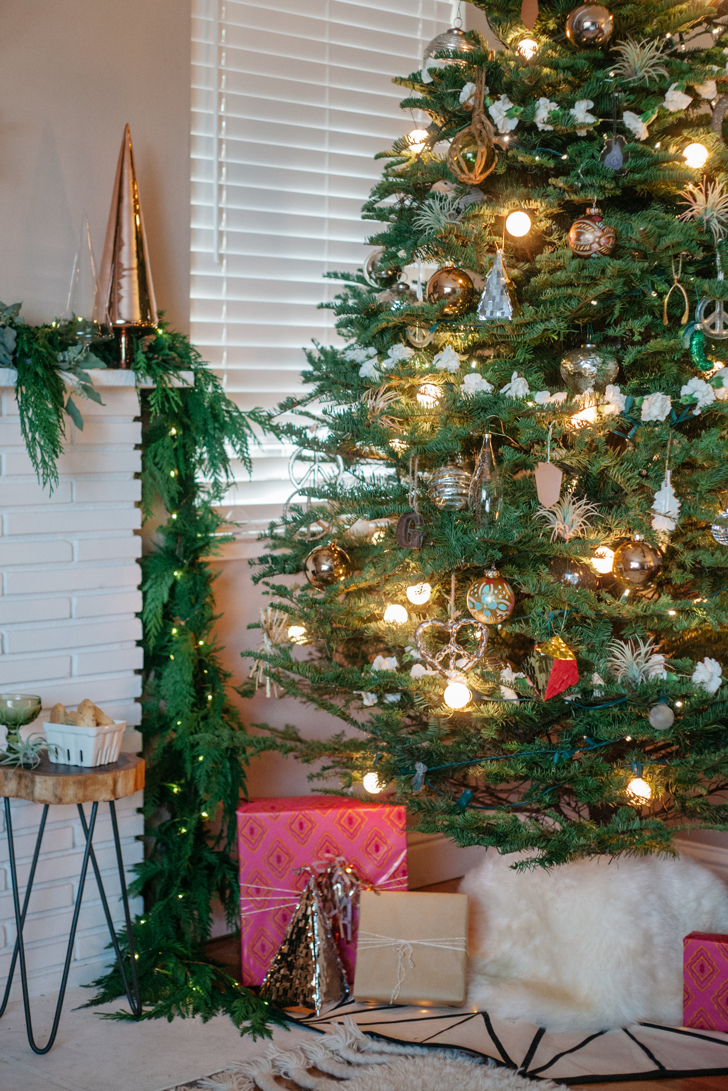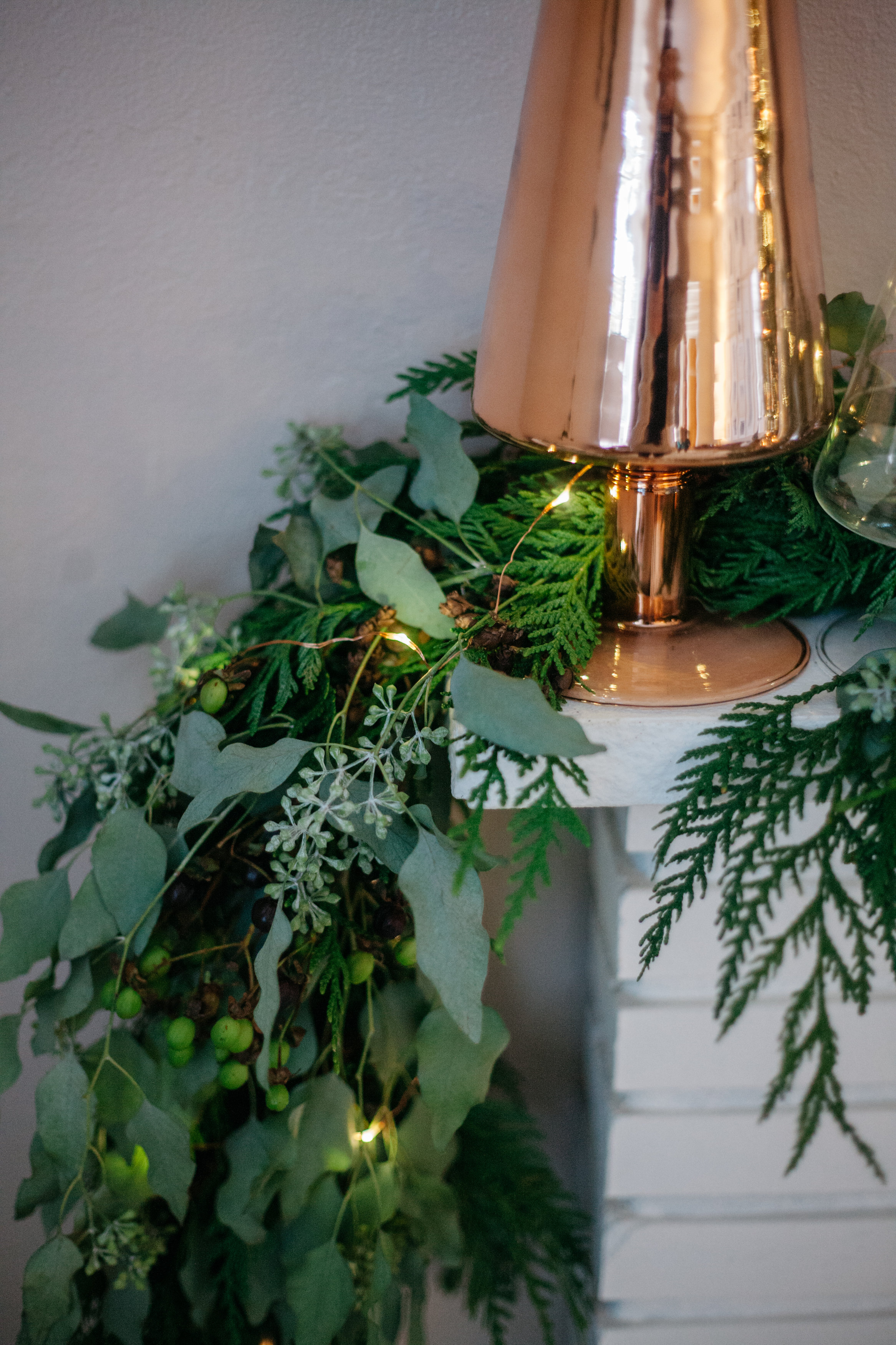 I used copper and clear paz trees from CB2 at the ends of the mantle