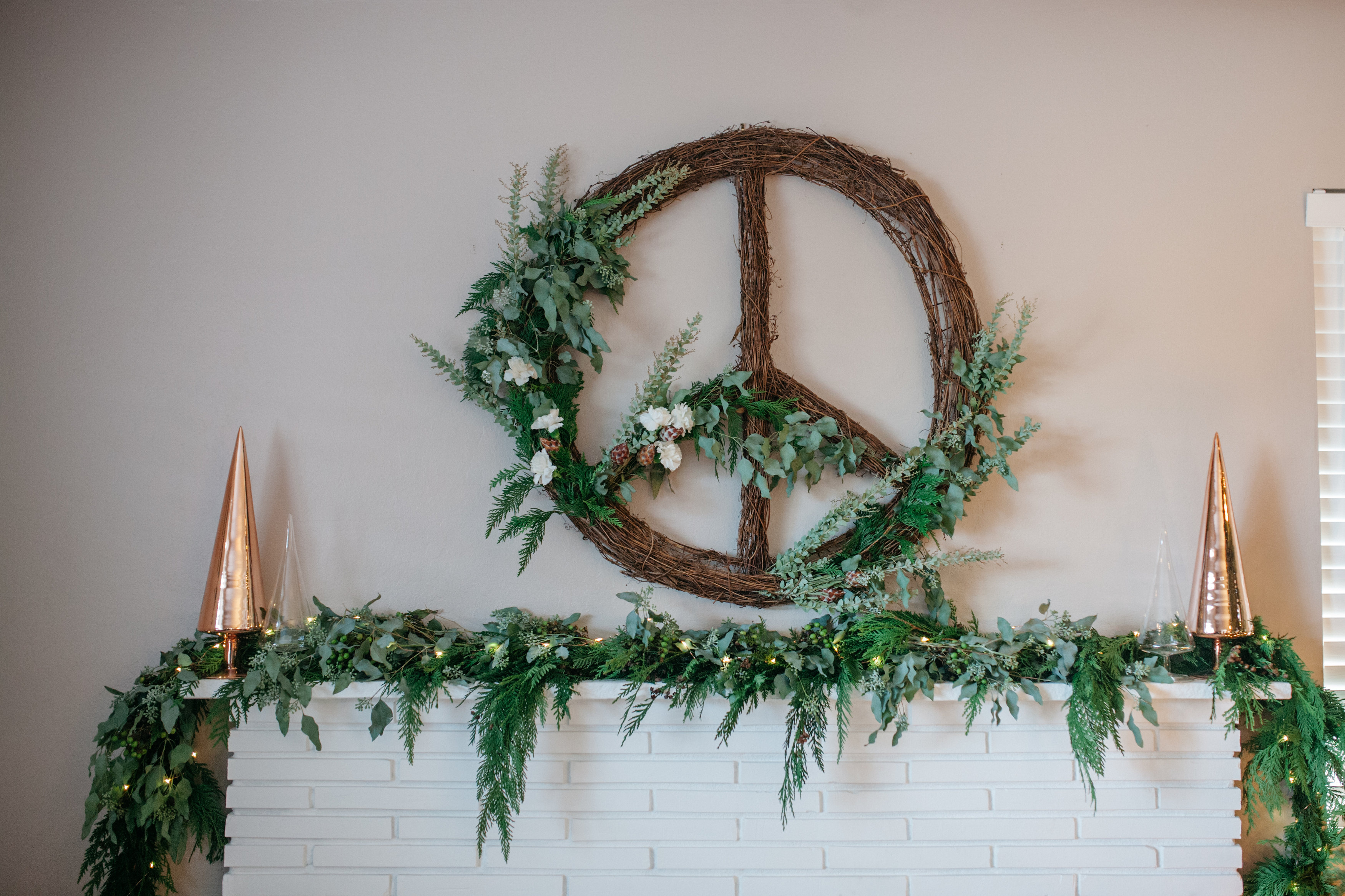 Choose a focal point to draw your attention to your festive mantle…. I used the inner peace wreath from CB2 (currently sold out) …. you can use whatever fits your style… wreath, mirror, or wall art.
