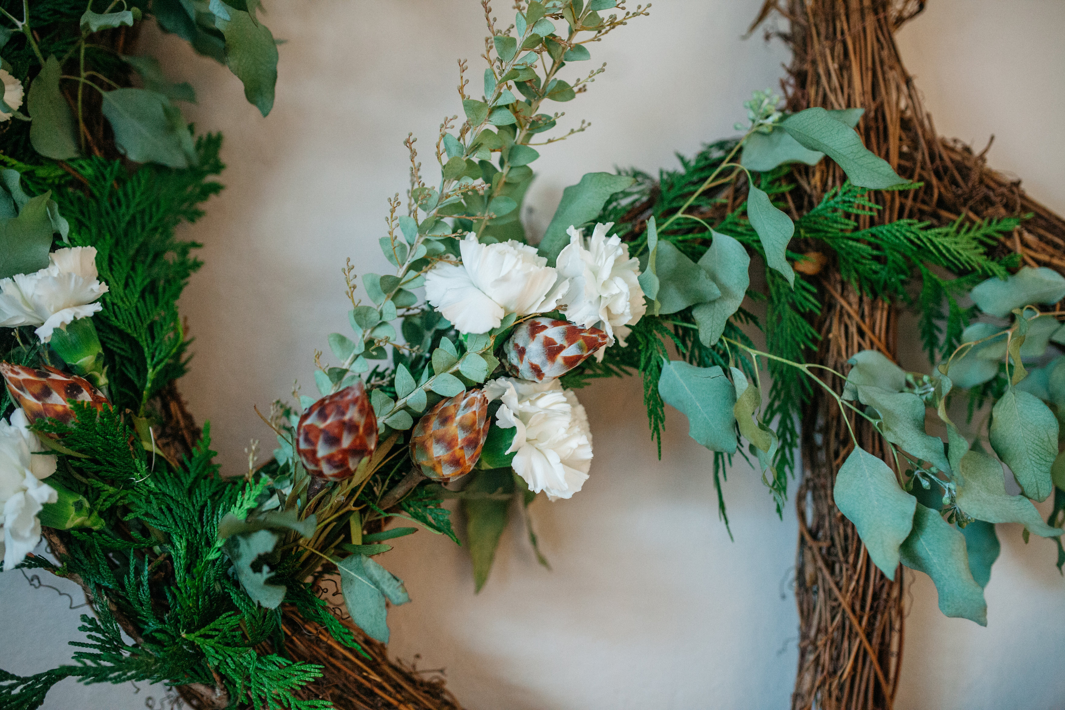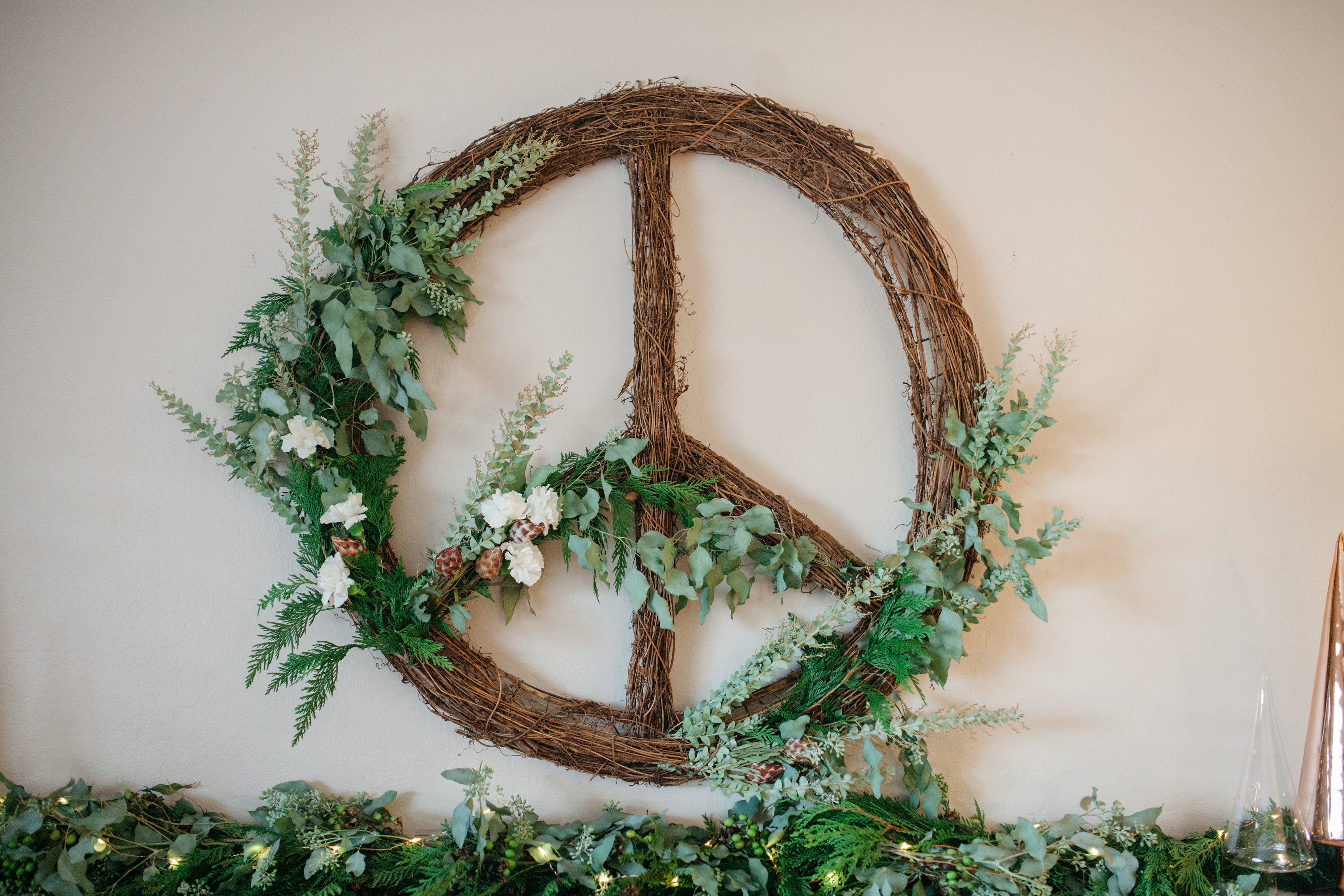 Natasha also used the same greenery and white carnations in the peace sign wreath…. again using the same elements to tie it all in…… so pretty……