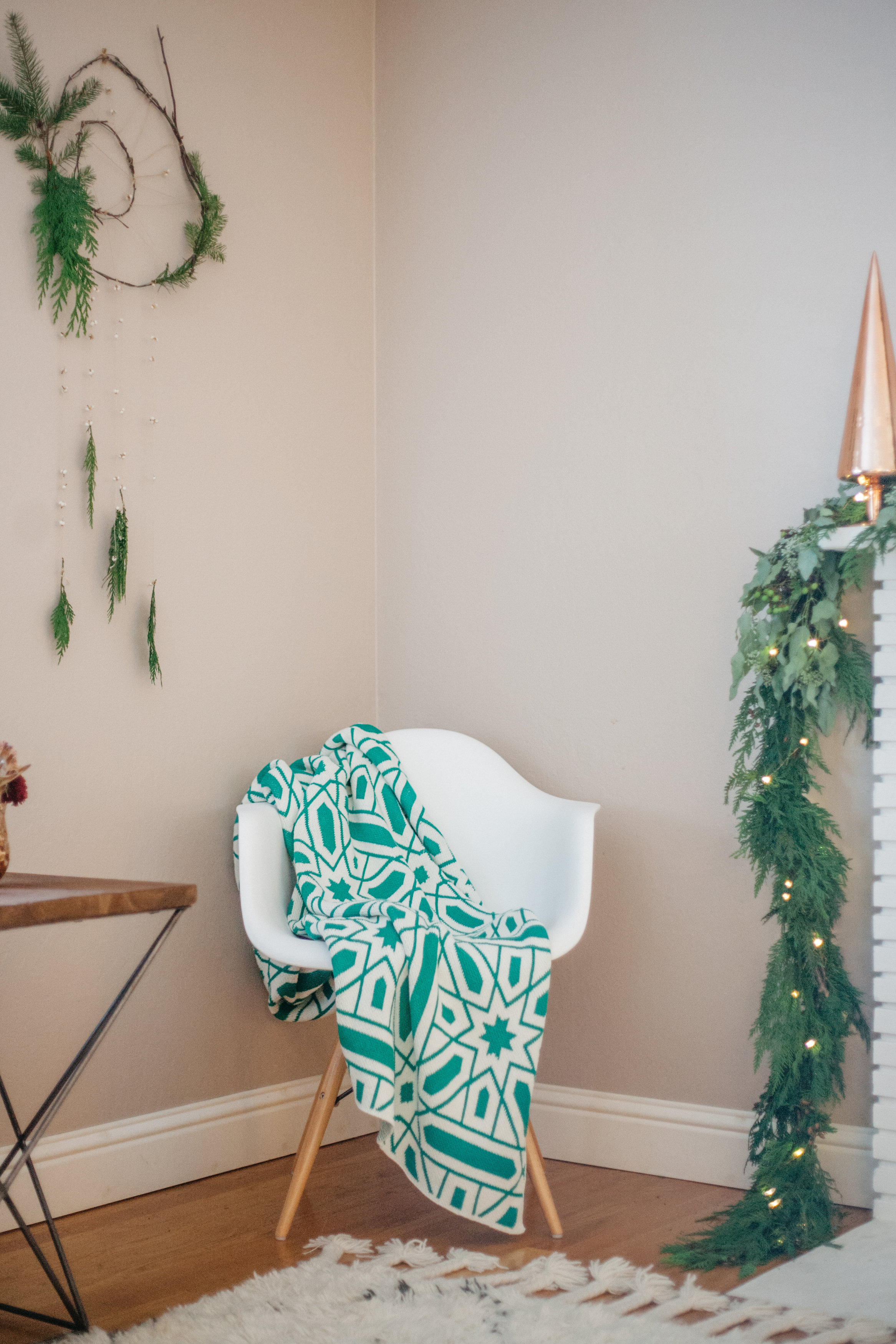 Having a cozy hand made blanket like this beauty is essential to have for the holidays to cuddle up with….. this emerald geometric patterned gem is from Happy Habitat….