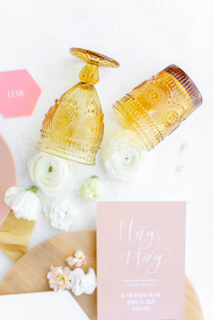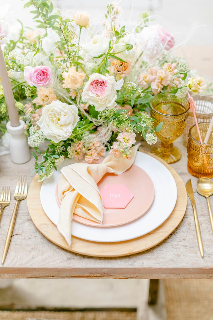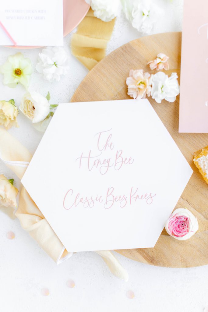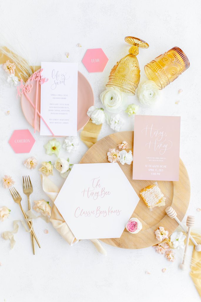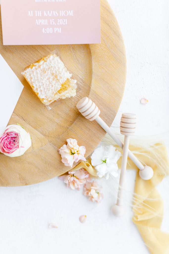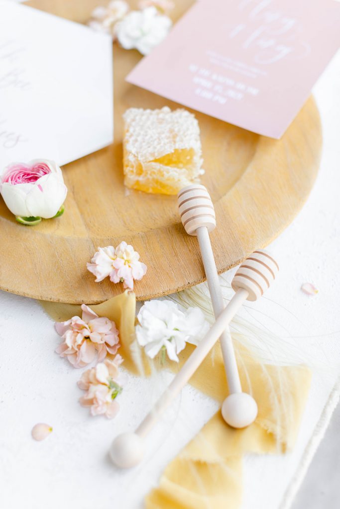 As usual, we have the prettiest little invite, styled to perfection by Lorin I must say! The invite and all of the details are by our friend Aislinn at Proper Letter, she never disappoints! We gathered some of our pretty tabletop pieces from Signature Party and Hostess Haven, along with all the pretty natural elements like flowers and honey of course! It’s all gathered together on the beautiful Chasing Stone mat.