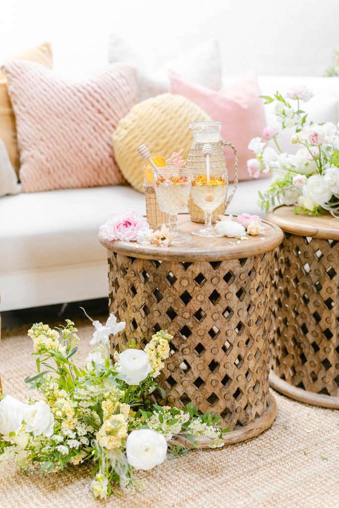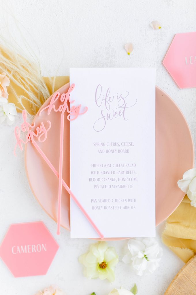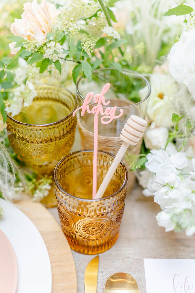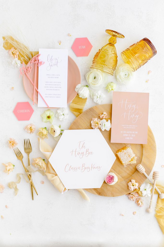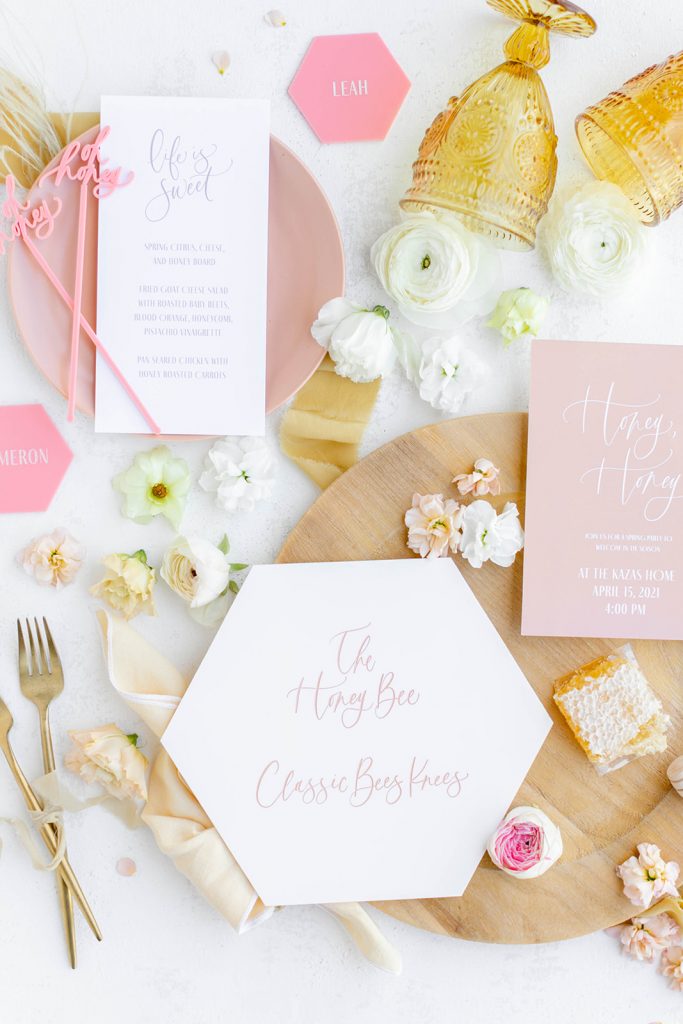 Our color scheme was so fun and I especially loved all the pretty details. We had honeycomb-shaped place cards and honey stir sticks as stir sticks along with an “Oh Honey” counterpart. Gotta love those details by Proper Letter, it’s the little things, right?! Plus, those pretty pink plates, gold flatware, and butter yellow napkins just make my heart so happy! Thank you Signature Party and Hostess Haven!