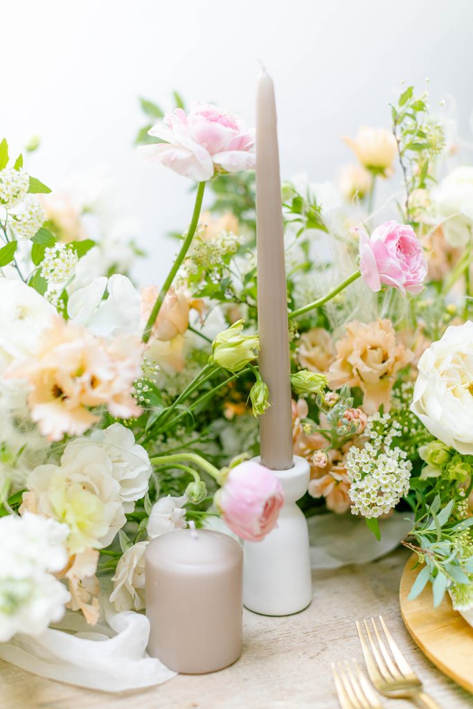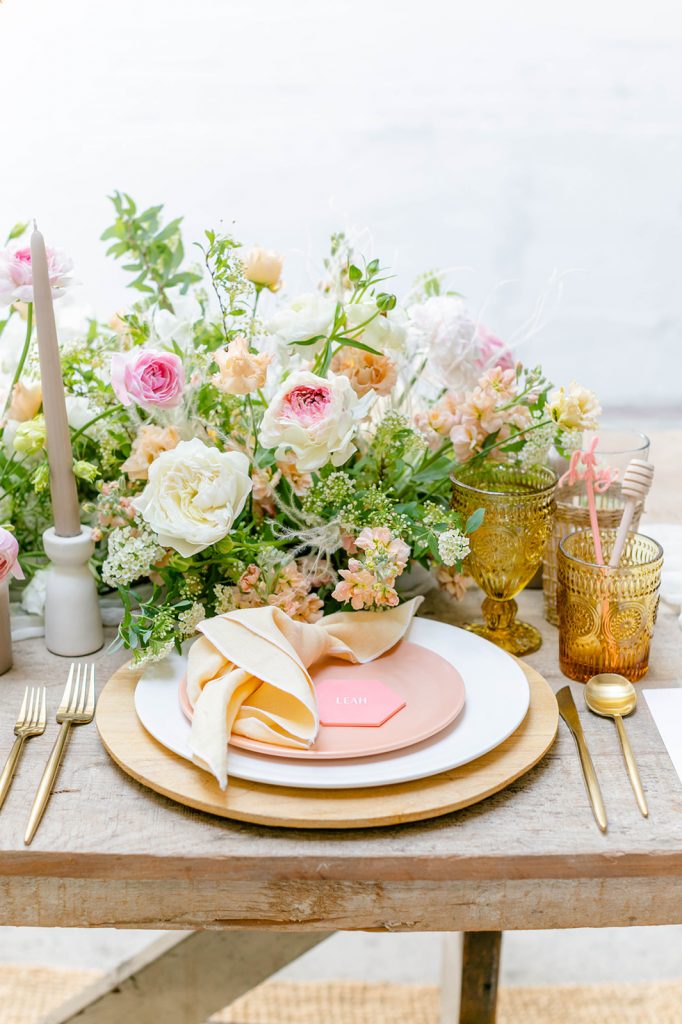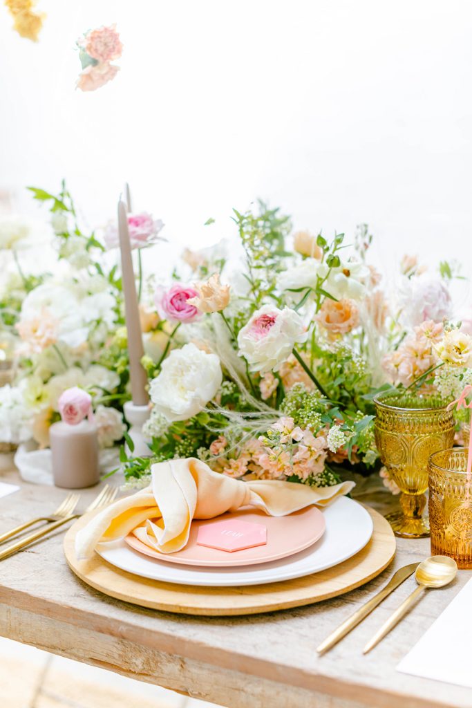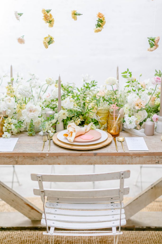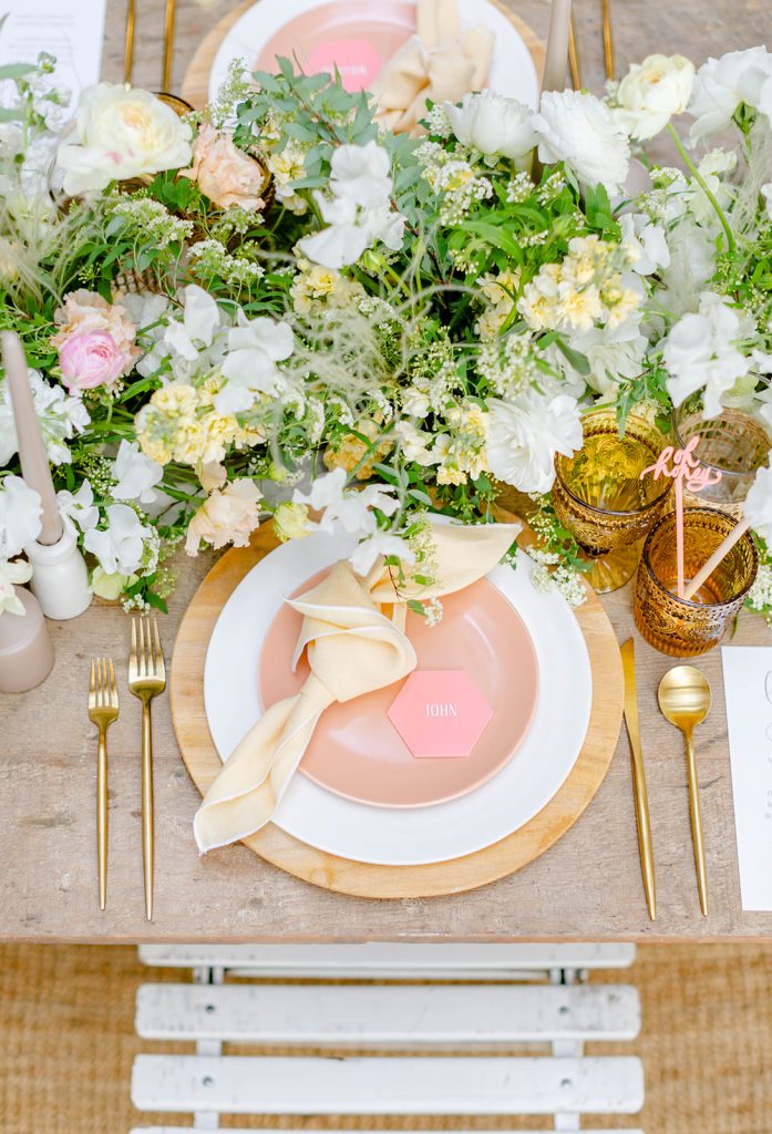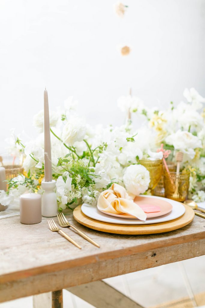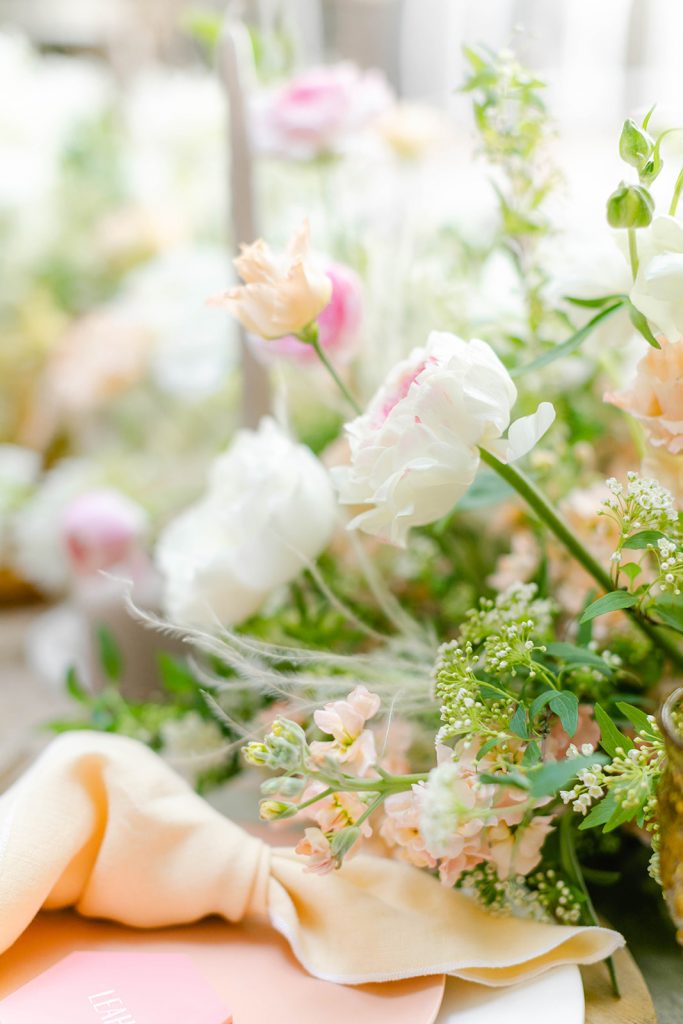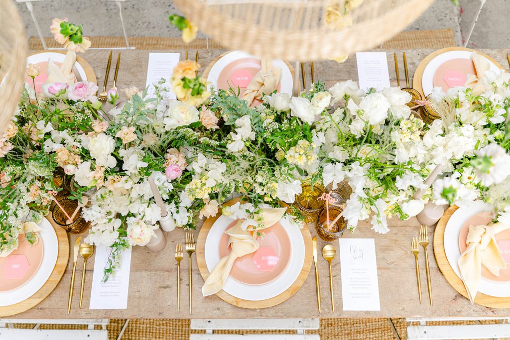 Love these overhead shots where you really see all the details! Third & Park used a runner of the most gorgeous spring blooms in neutral tones from white to soft blush to yellow.  I loved using all of the different textures and soft spring colors to create this stunning setting.