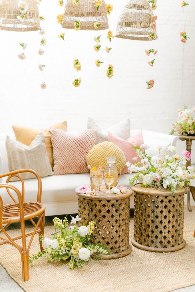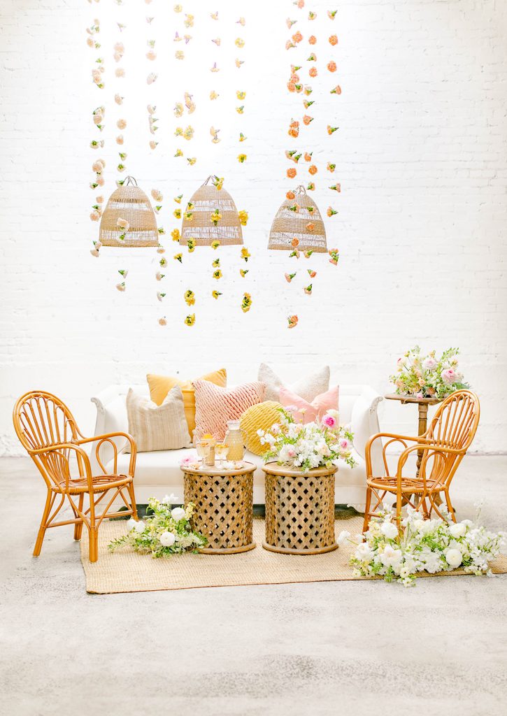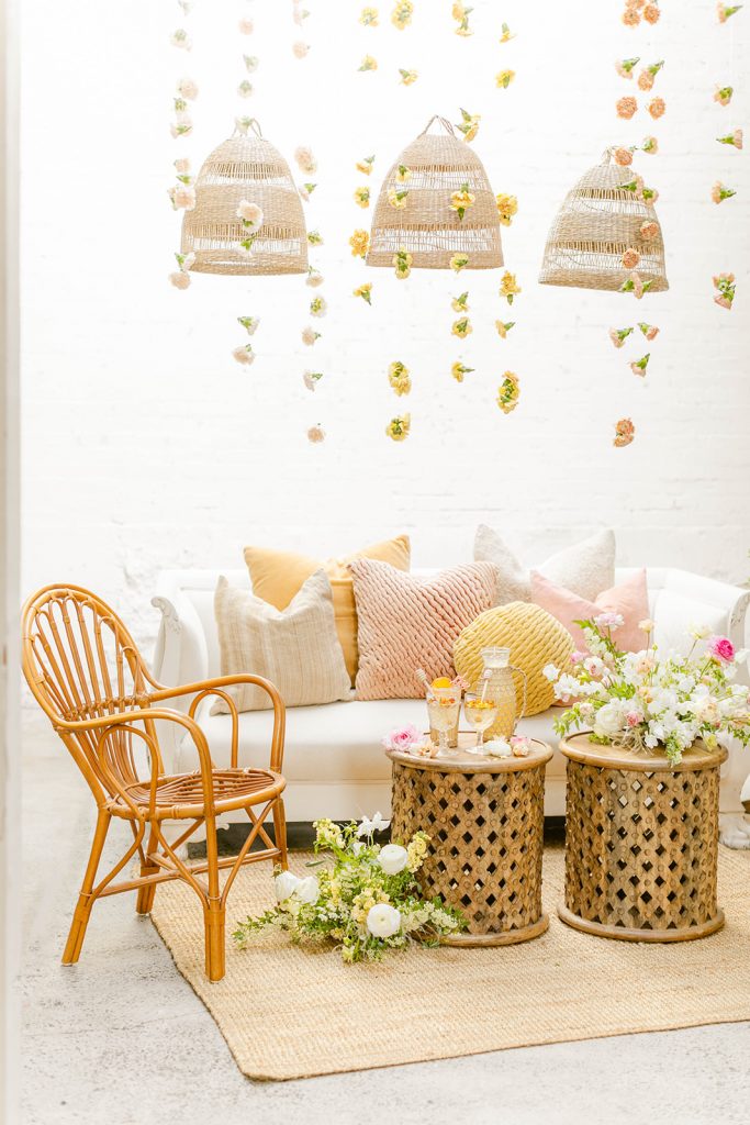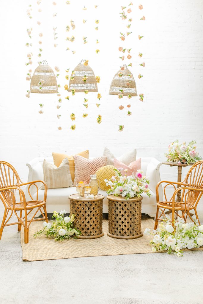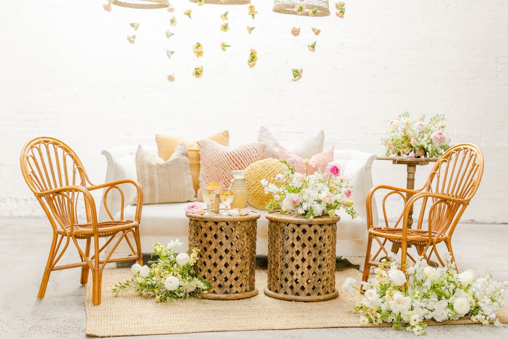 Onto my favorite, this stunning lounge!! You know I love Sweet Salvage Rentals’ amazing collection, but especially her rattan pieces (which she just got a ton more of!!) It just all looks so pretty together under Third & Park’s hanging installation. I definitely wouldn’t mind enjoying a cocktail or two right in this spot!