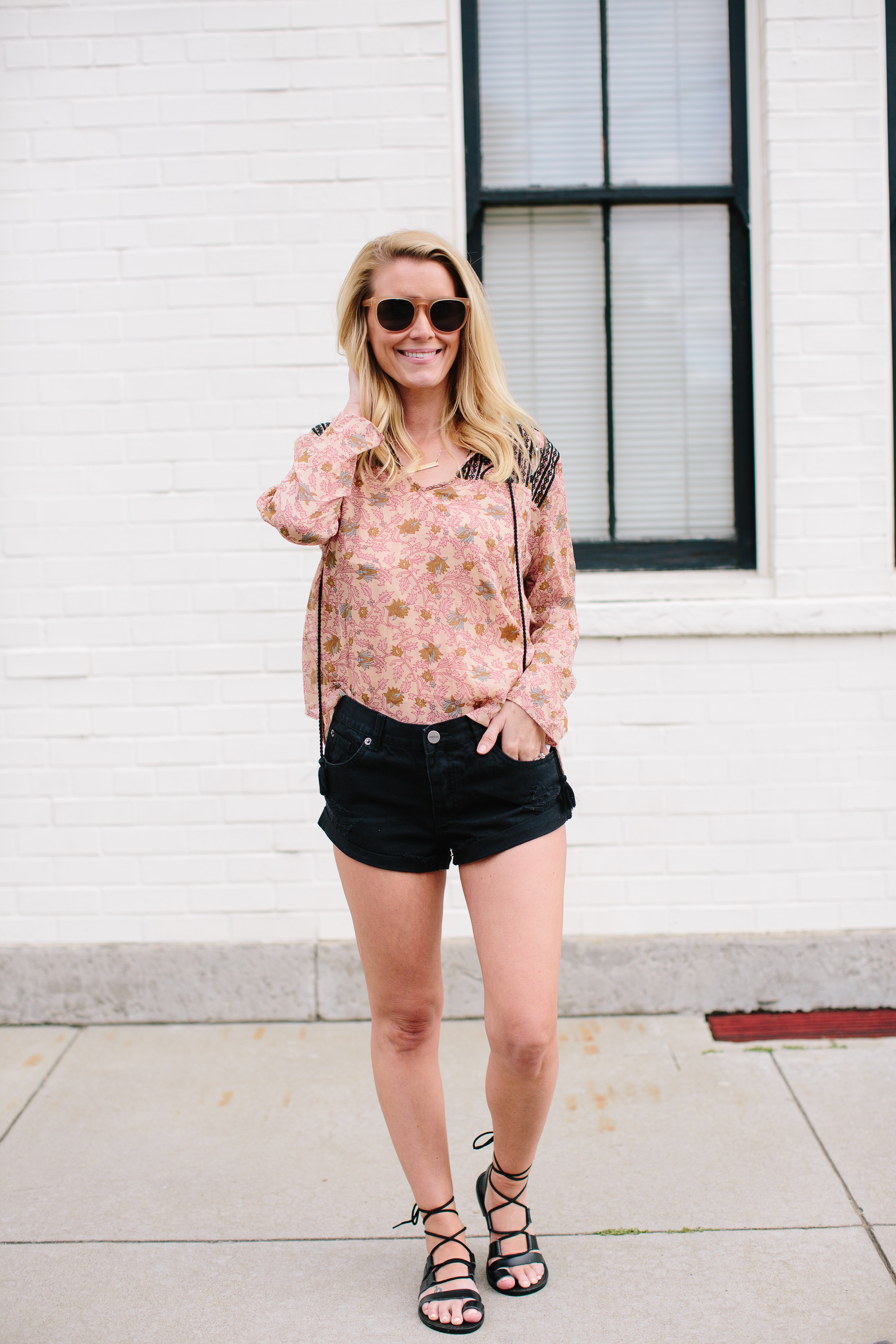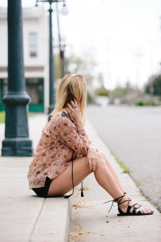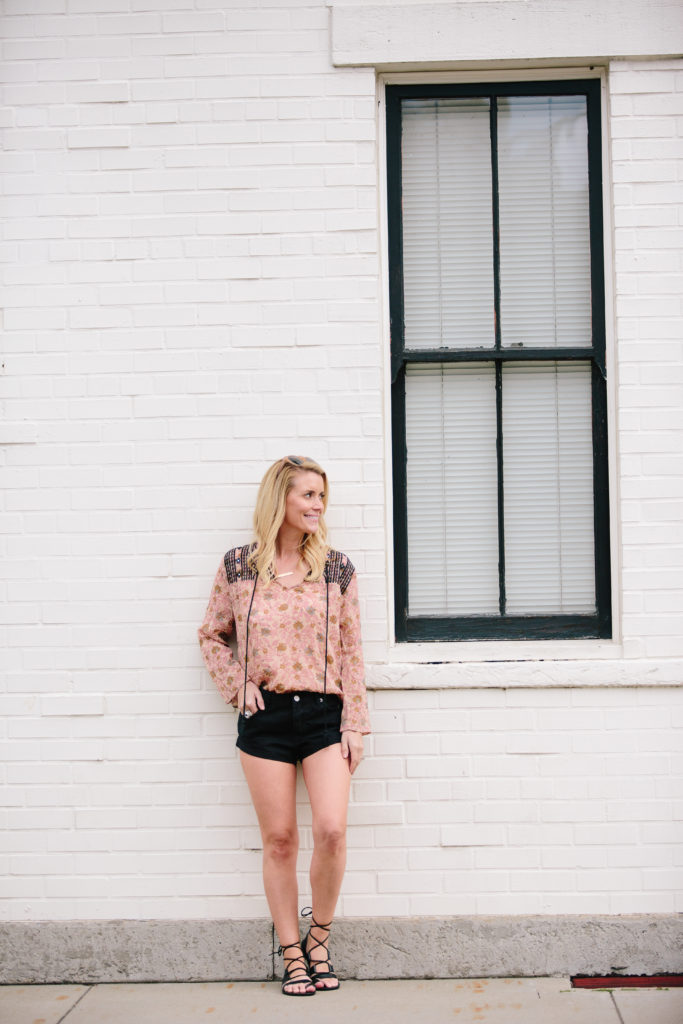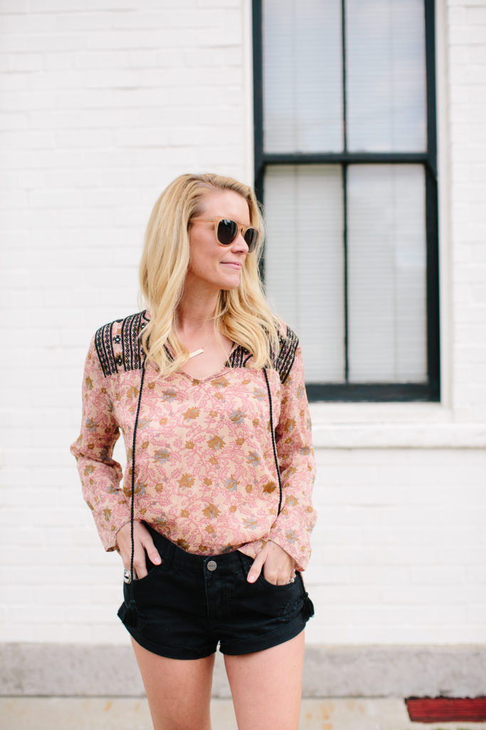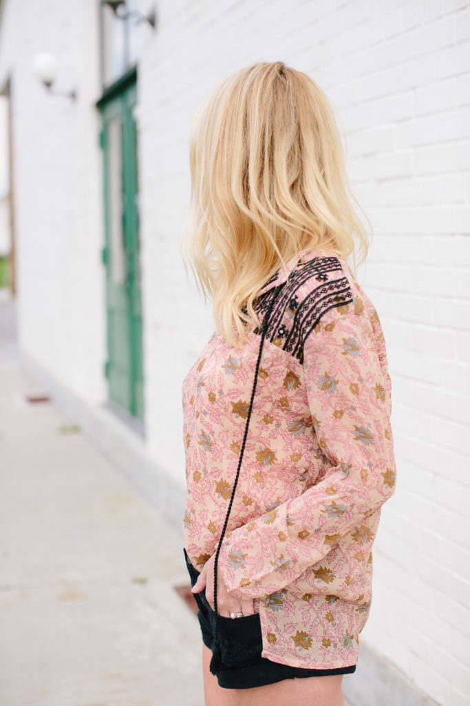 Abby is jumping in on the statement top game strong with this top by Boemo. The colors and print are so pretty for Spring and we love the black lace touch on the shoulders. This is another great bohemian style top that can be dressed casually with some cute shorts like Abby has on here, or dressed up with a pair of black denim. Abby’s sandals are so cute and from one of our favorite stores – Target!! You guys gotta snatch these up fast!