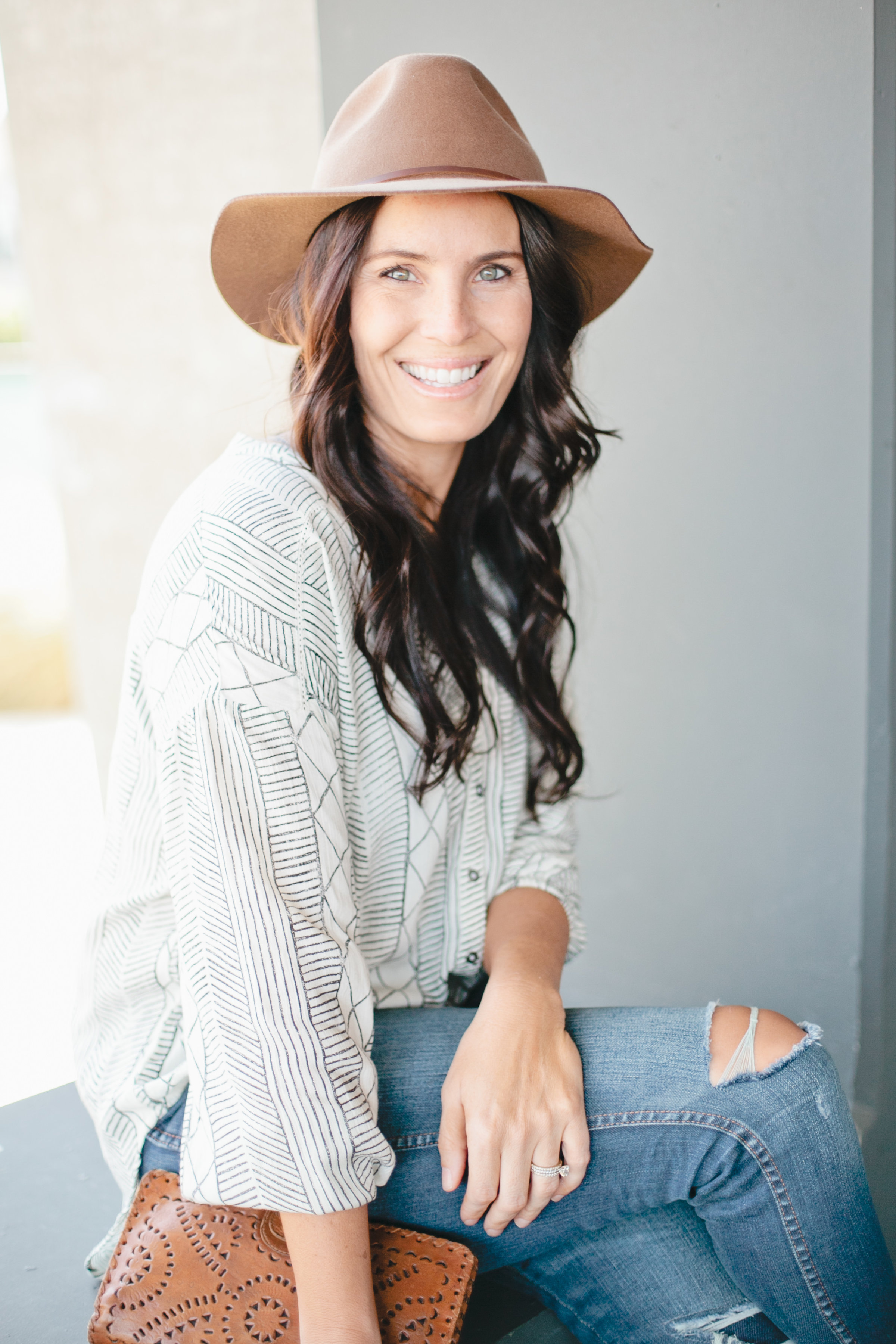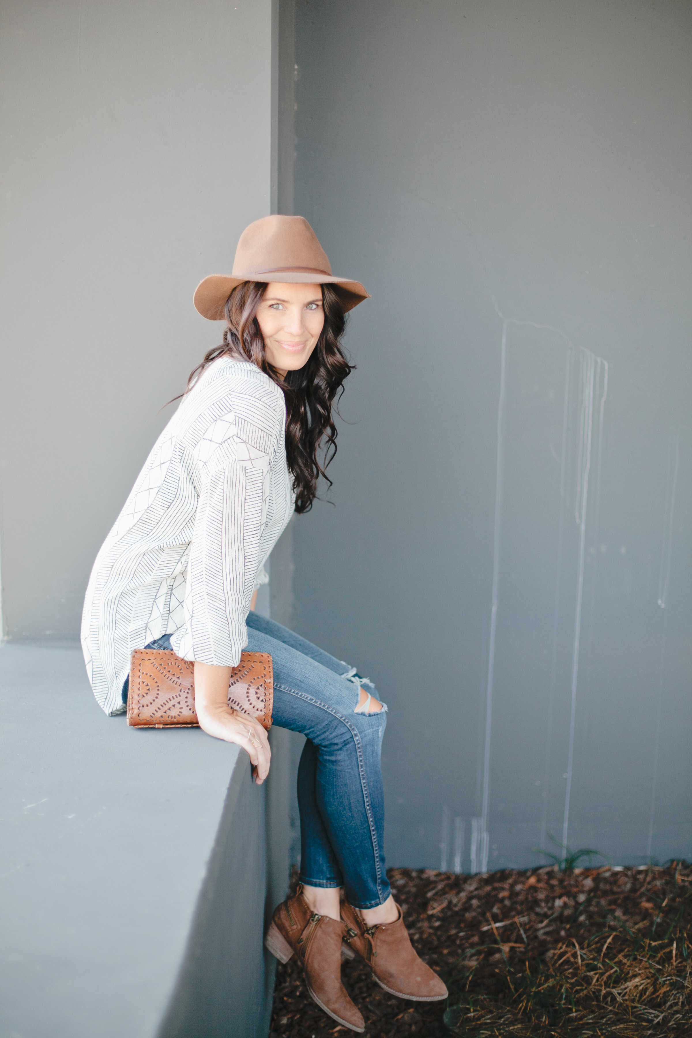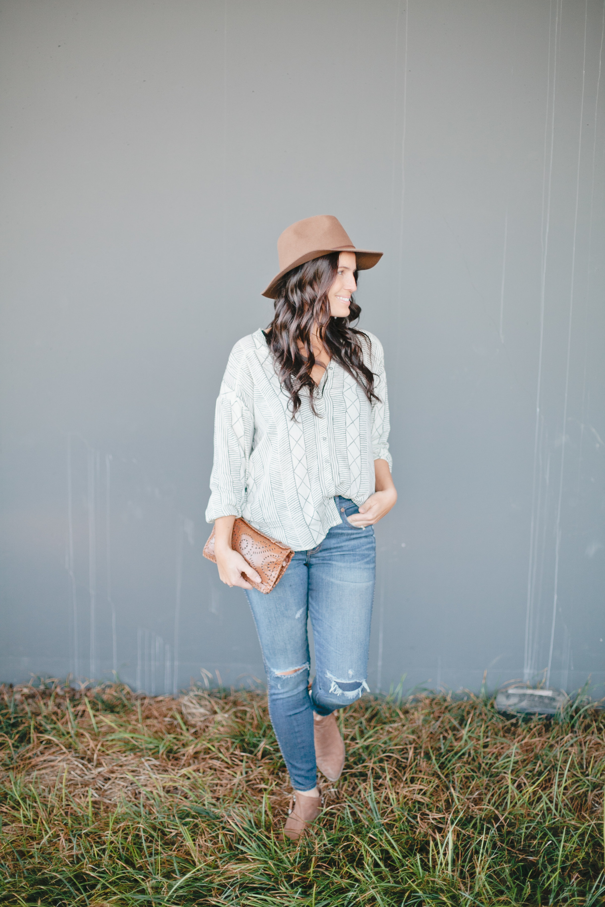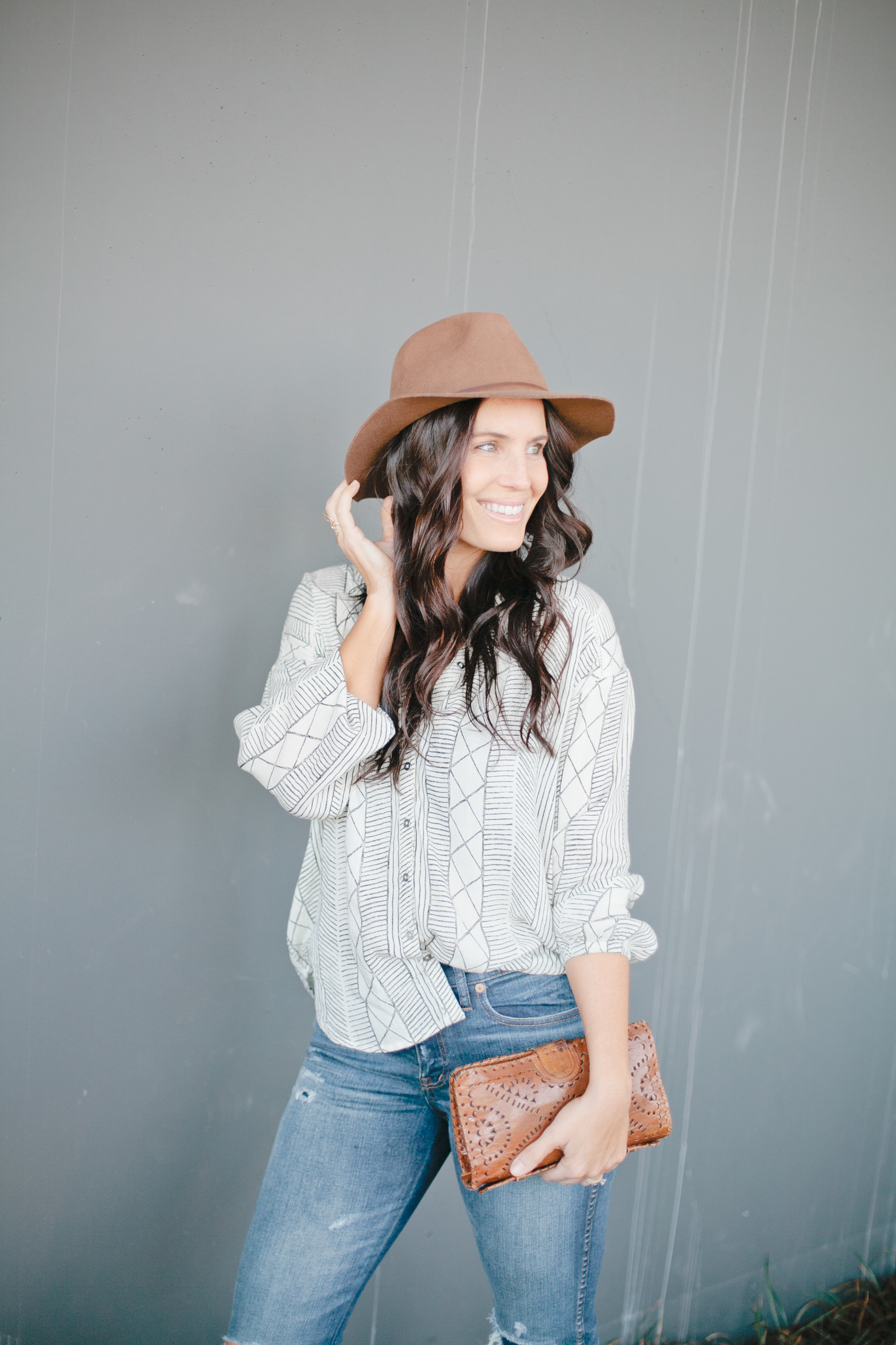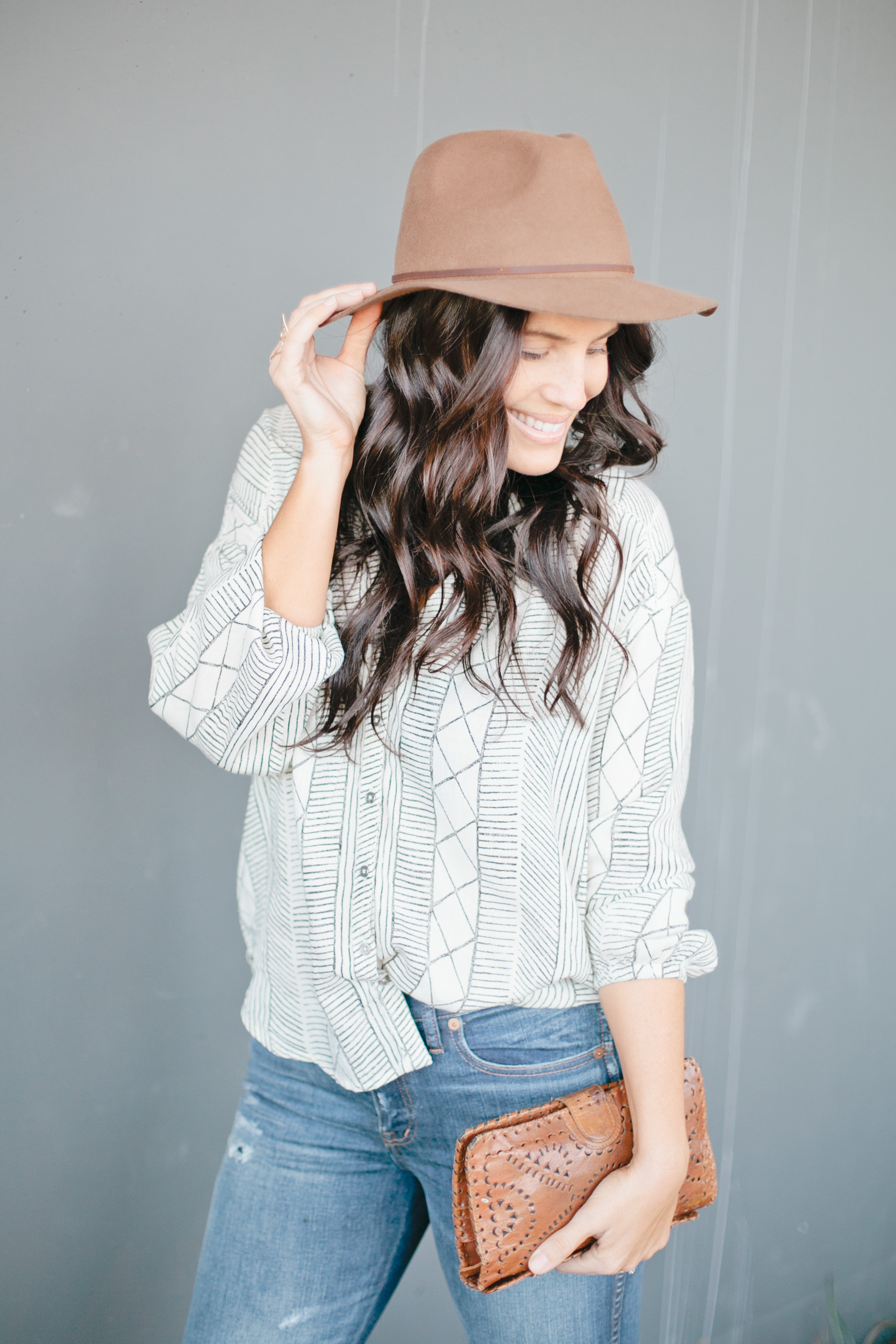 I love the simple but graphic black and white print. I again paired it with my Madewell High Rise Skinnies – I’ve been wearing the crap out of those lately – a cute hat by Brixton, my favorite Cleobella clutch and my Dolce Vita booties.