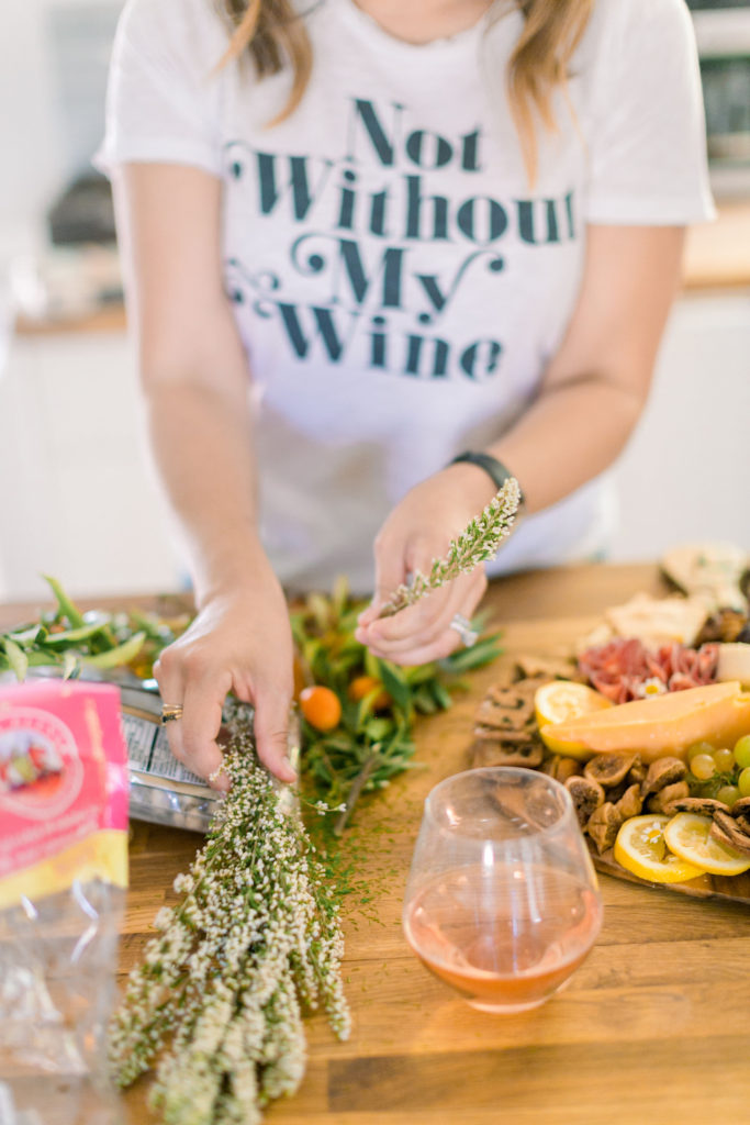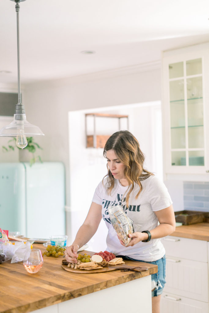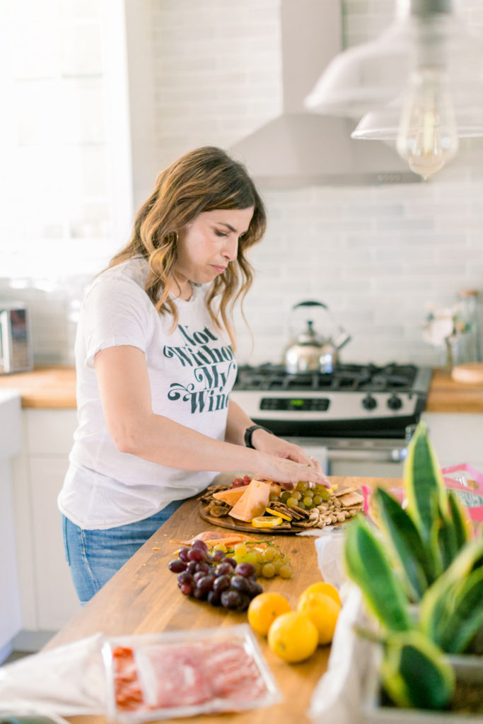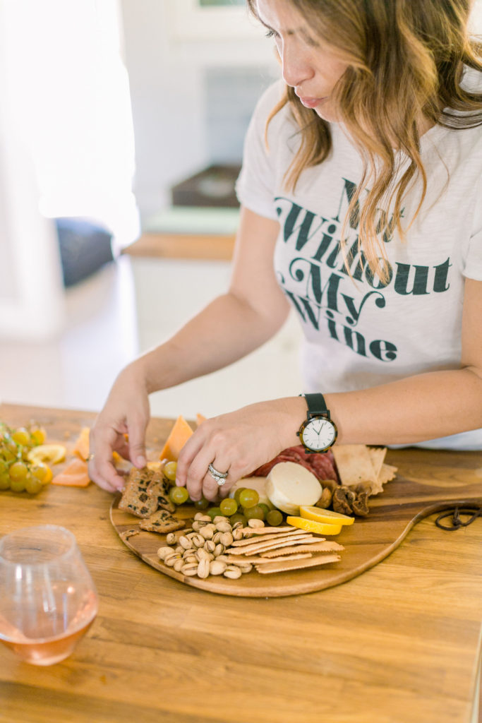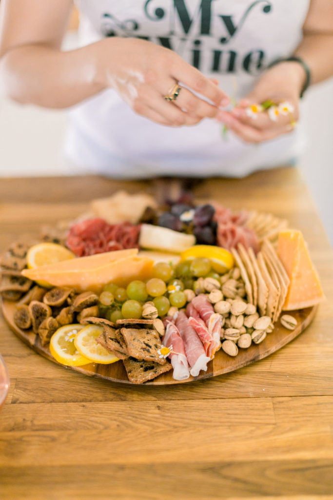 Meanwhile in the kitchen, Leah was just drinking away! Haha, just kidding – well kind of ;) Really Leah was getting some yummy bites ready!! Our friend Dionna at Feed & Feast gave us all the goods and tips for the perfect charcuterie board! So Leah went to town and the result was quite impressive!