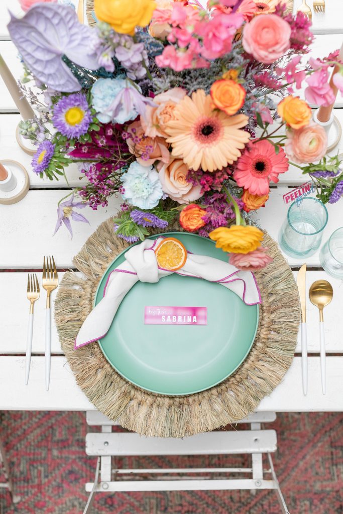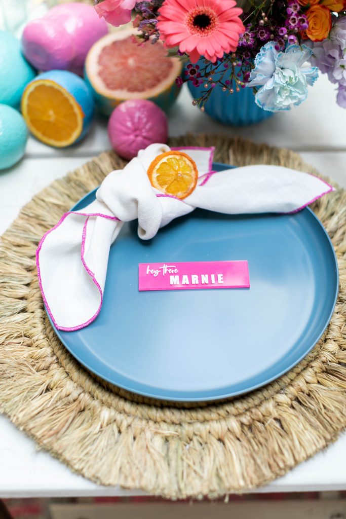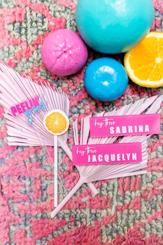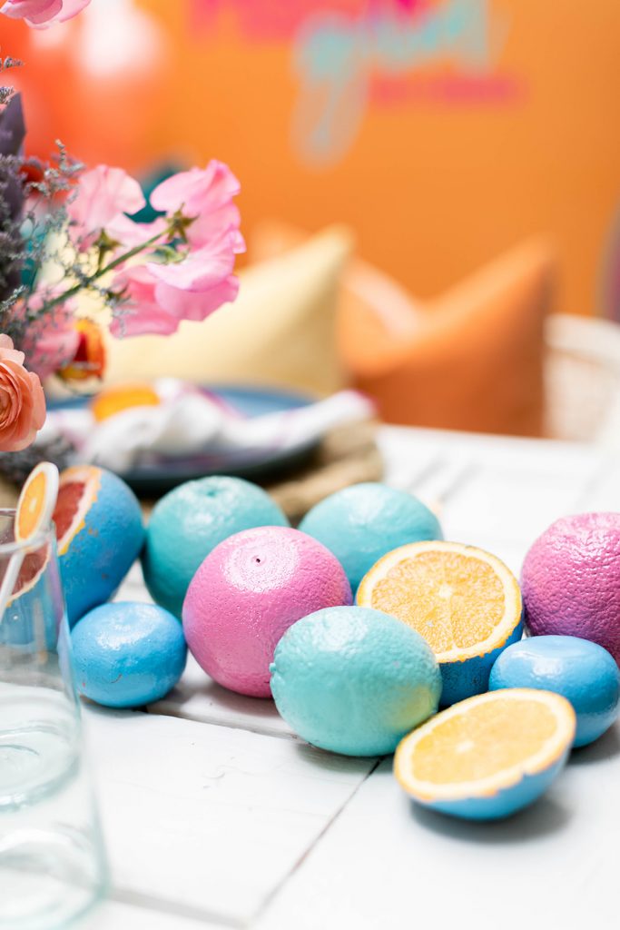 As always, gotta start it off with a fab invite!! This invitation suite by Double Dipped Calligraphy had all the right colors and all the fun wording. She nailed it!! Plus how can you resist those cute stir sticks and place cards by Creative Amme? It’s all in the details, speaking of I had fun spray painting all the citrus I could get a hold of! We were all about those vibrant tones for this shoot and I love how it all came together…
