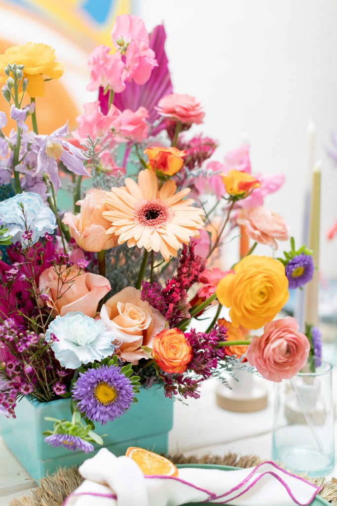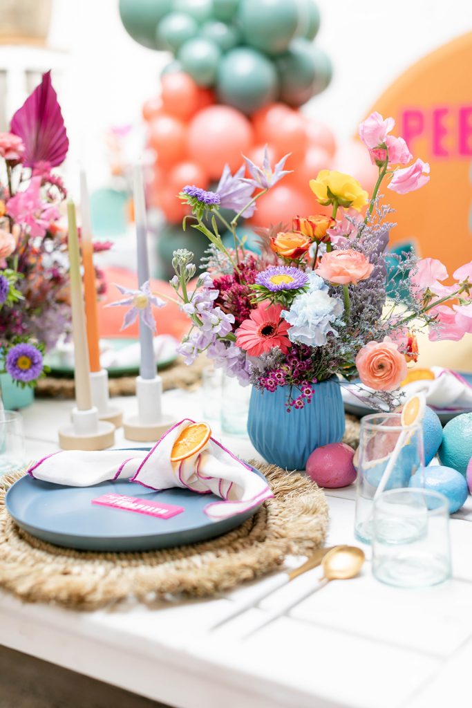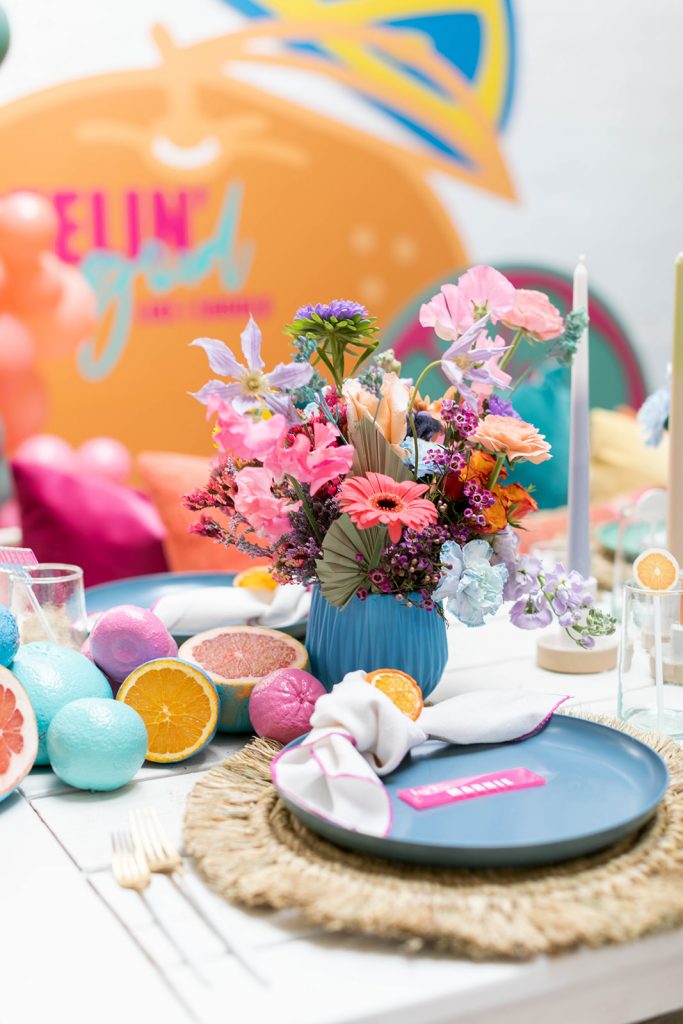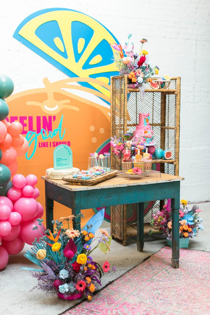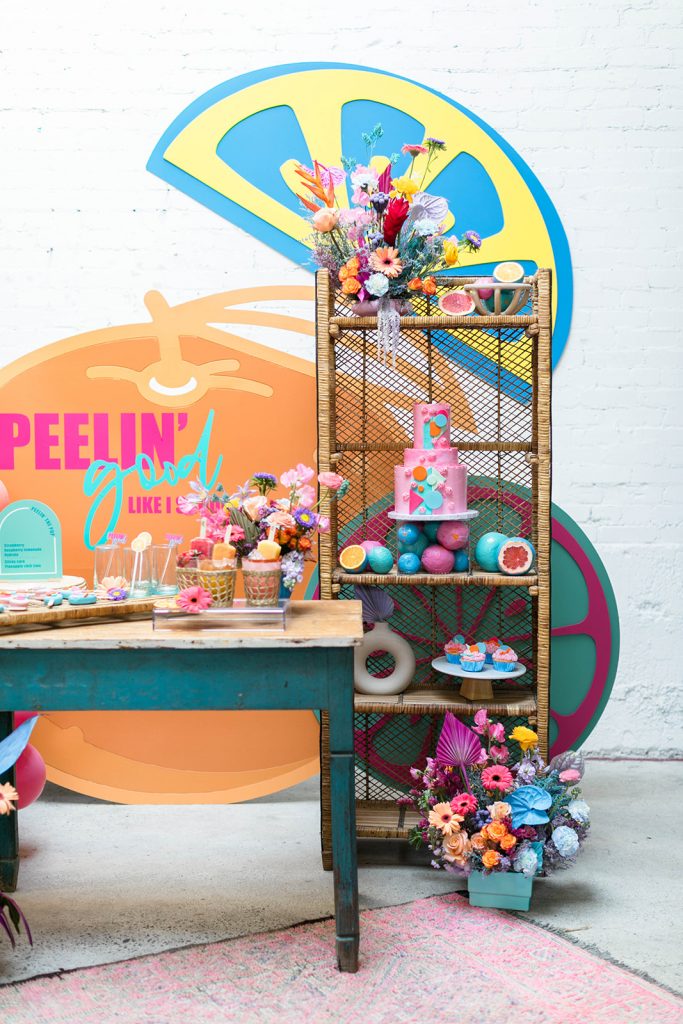 I can’t get over all of this amazing color!! So much fun for Spring & Summer! We knew we wanted to use Sweet Salvage Rentals. Marnie’s beautifully curated collection is so much fun to play with! From there we enlisted the help of Goldie Blooms to bring vibrancy with their amazing florals. The backdrop was the showstopper of this setup and our friends at Paper Garden XOXO nailed the design.