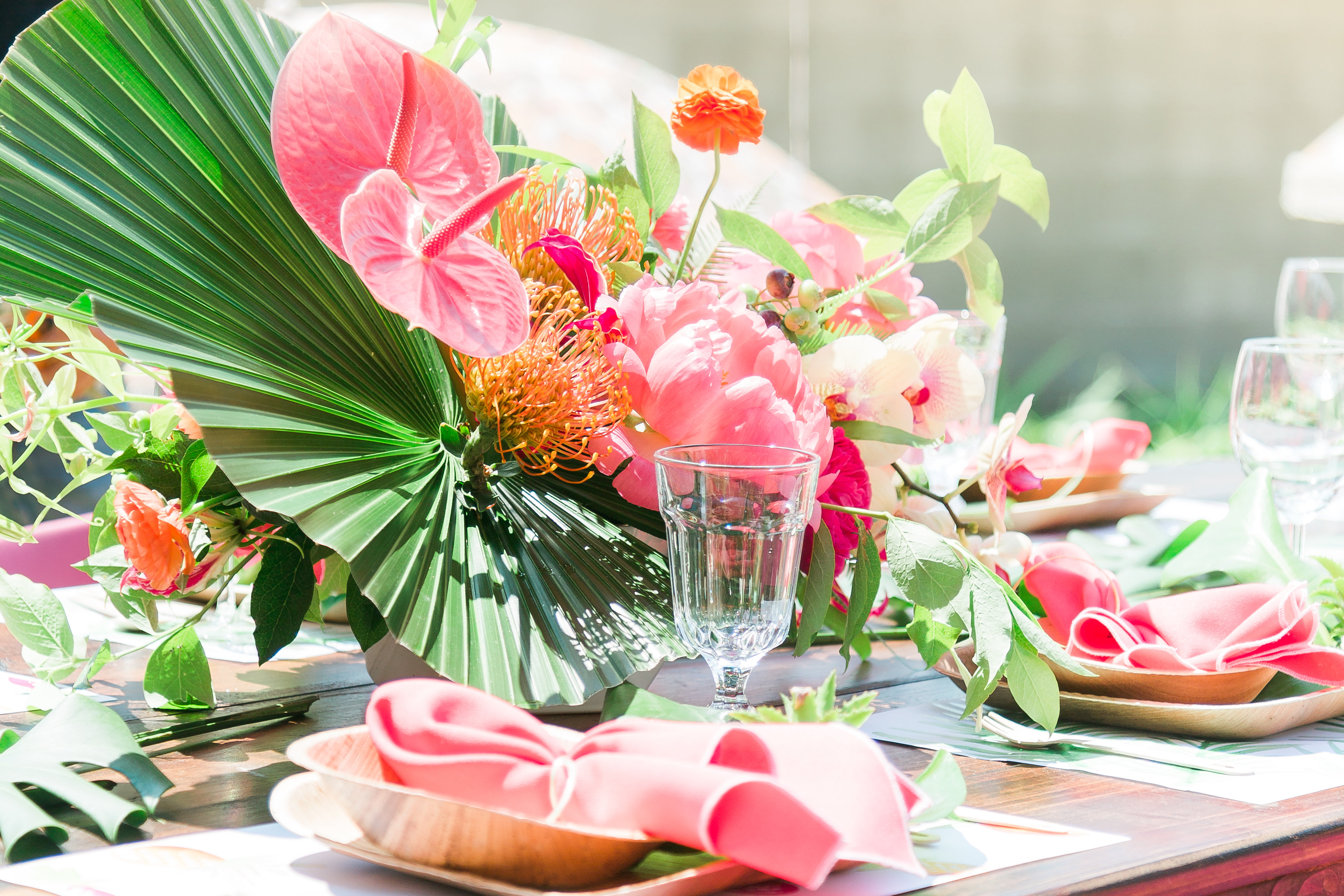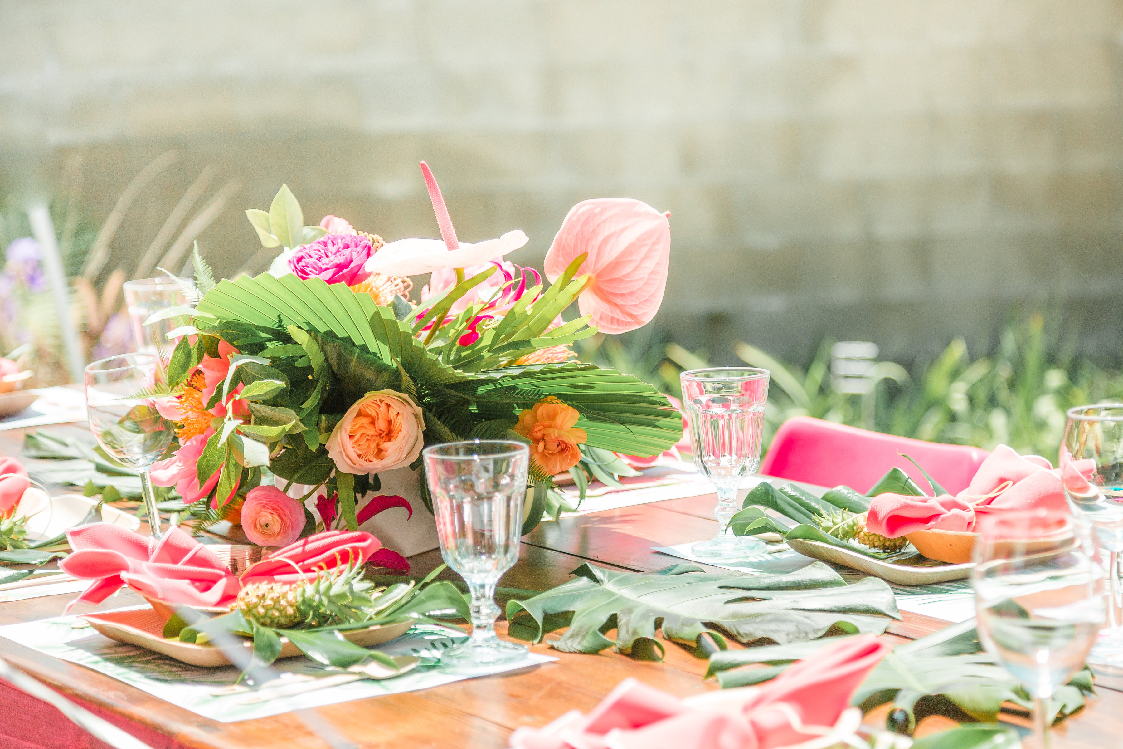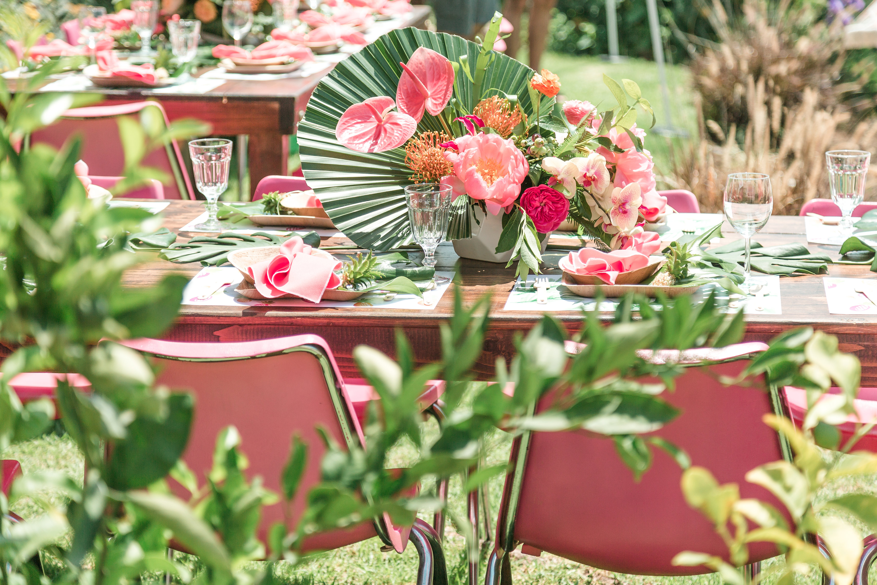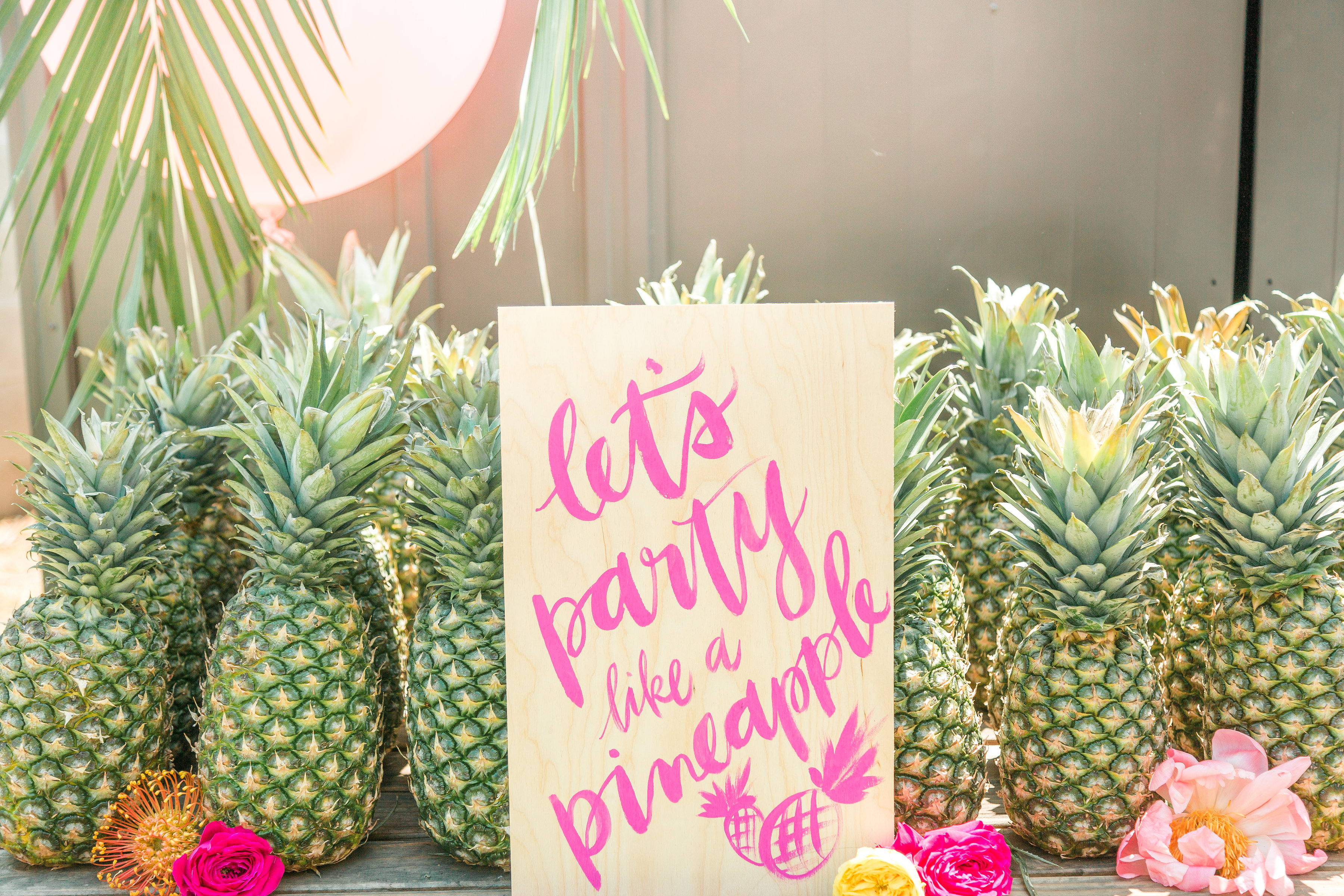 Pineapples and palm fronds were an inspiration through-out the party that we carried on to the table! We had Meghann design paper placemats using two different motifs from the invitations, we love using placemats at events, they add such a fun detail and paper ones don’t break the bank! The plates we used were by leafware which go perfectly with the theme, glassware is from Ikea, flatware from Etsy and the napkins fare from Hostess Haven. Just add a flower detail and you are set!