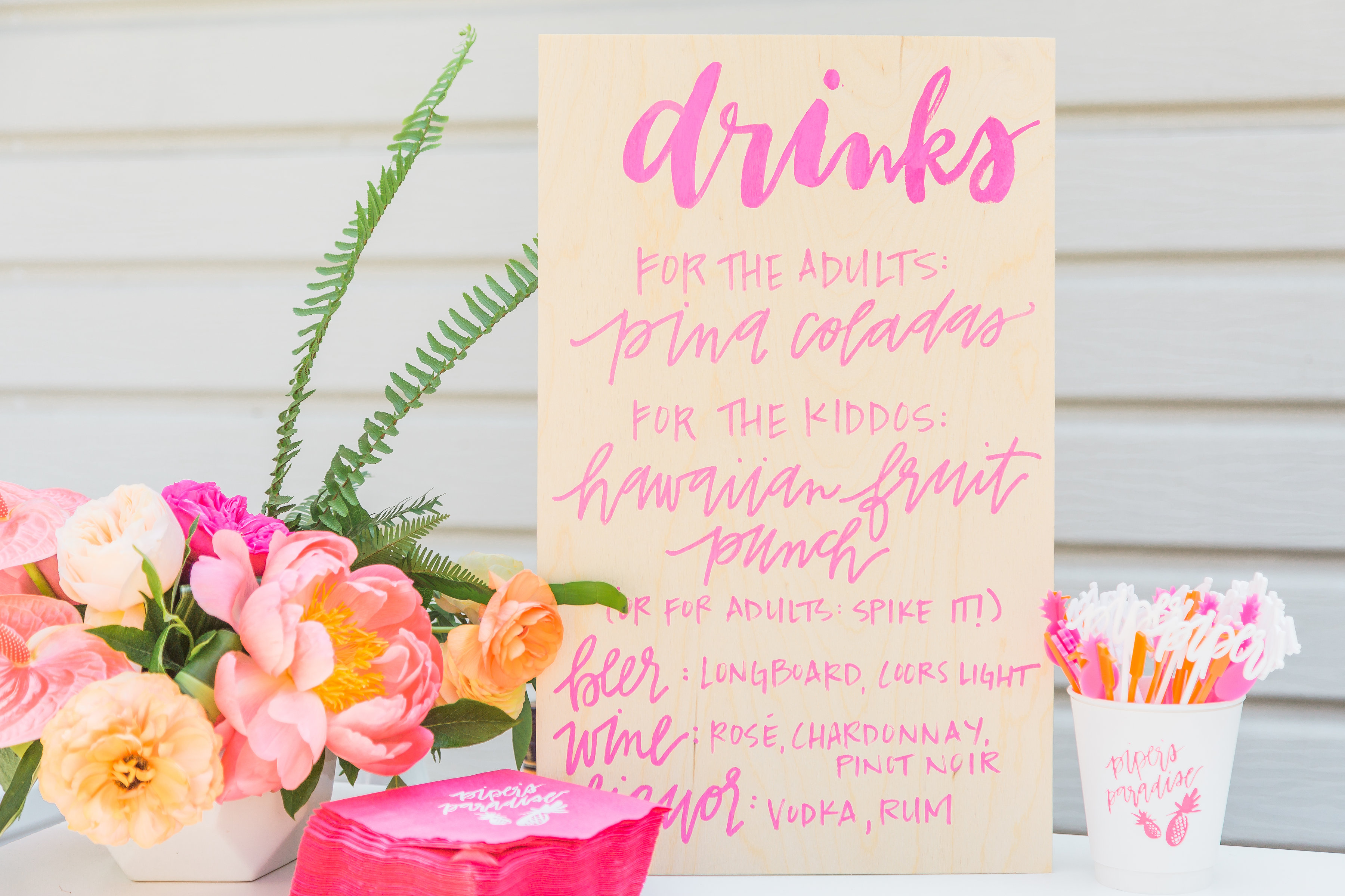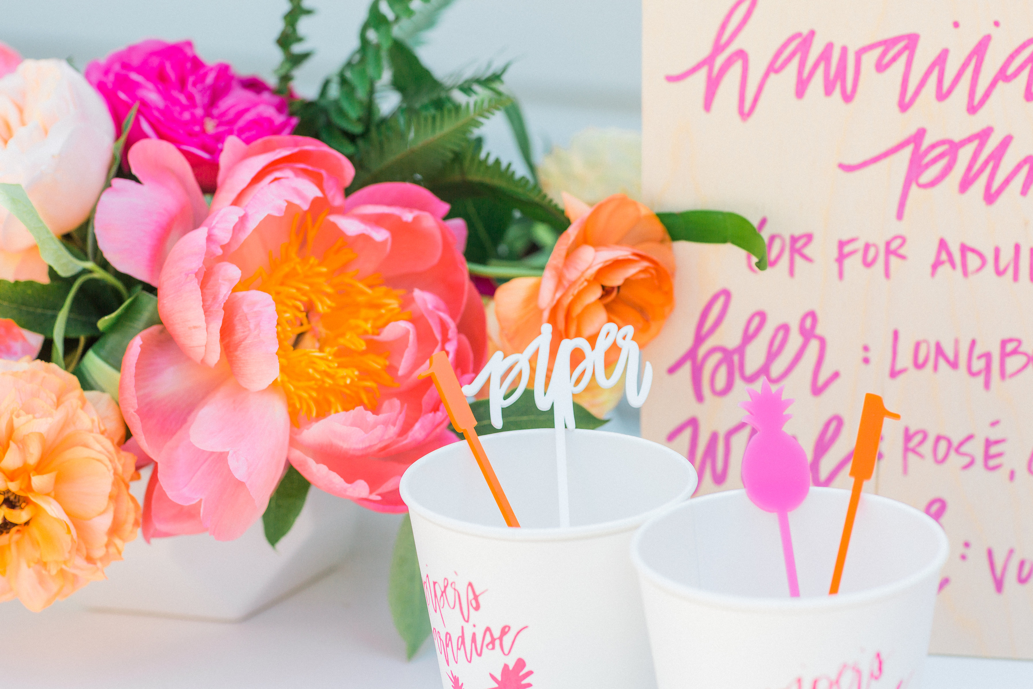 Guests were greeted upon arrival with a lei and a cocktail! The bar stood near the entrance of the party and we had lots of fun details added like custom napkins & cups with graphics by Meghann Miniello and cocktail stirrers by The Roc Shop. Meghann also did the pretty pink signage that is used through-out entire party…