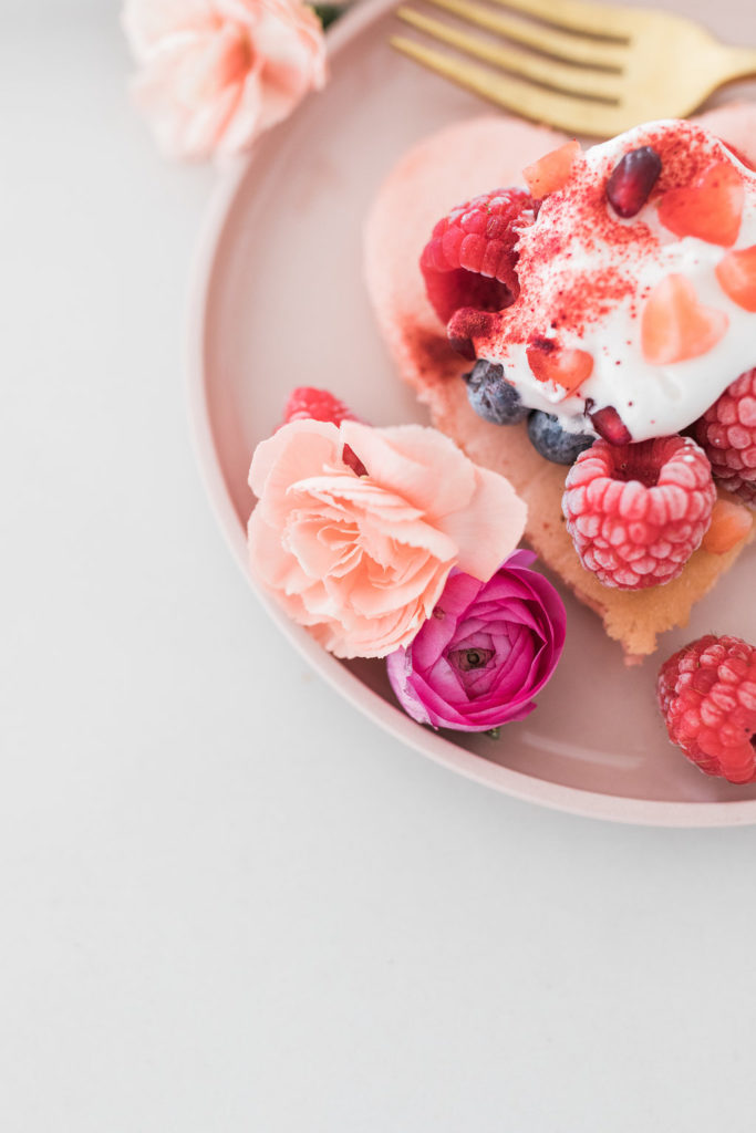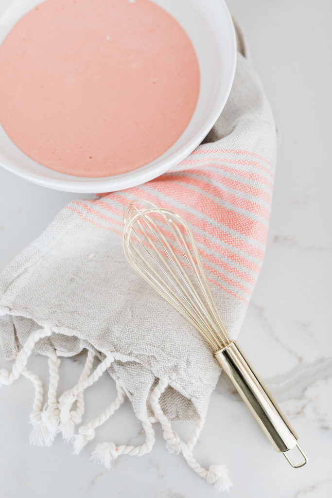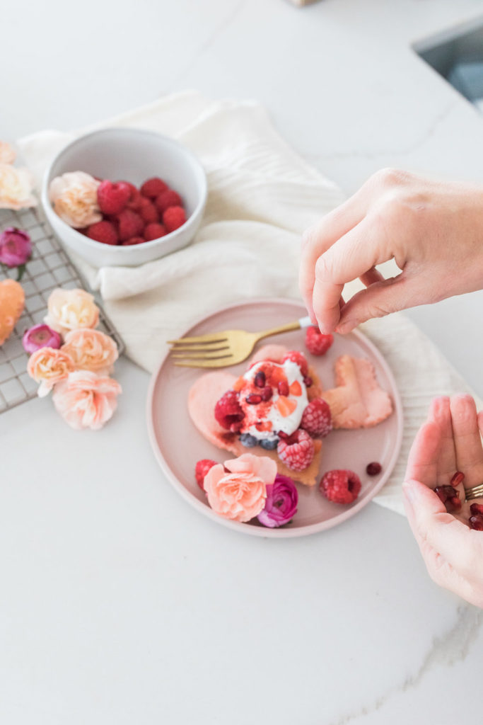 Prior to making the batter, I will freeze some raspberries and blueberries. It adds a crunchy and sweet element to the toppings. Plus it creates that pretty frozen fruit look you see in all those Pinterest breakfast smoothie pictures.