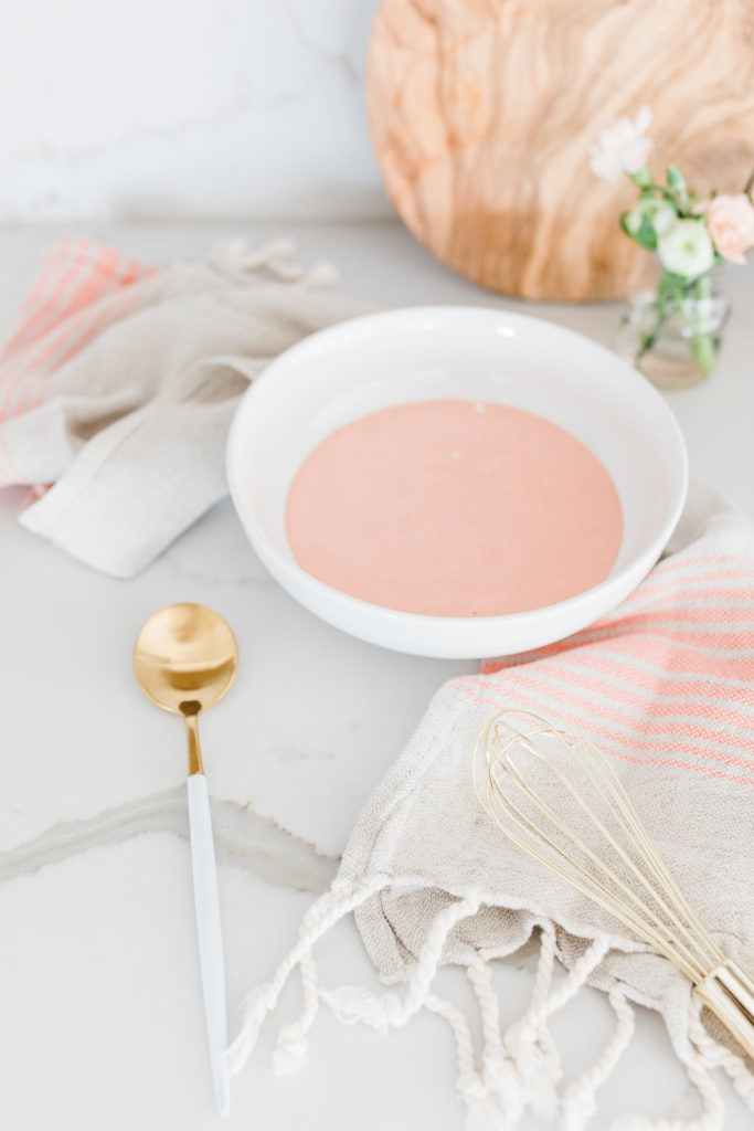 Place all ingredients, except eggs, coconut oil, and strawberries in a good quality blender. Blend until oats are ground and everything is mixed well. Add eggs and pulse until incorporated. Add pink/red food coloring to create your perfect pink.